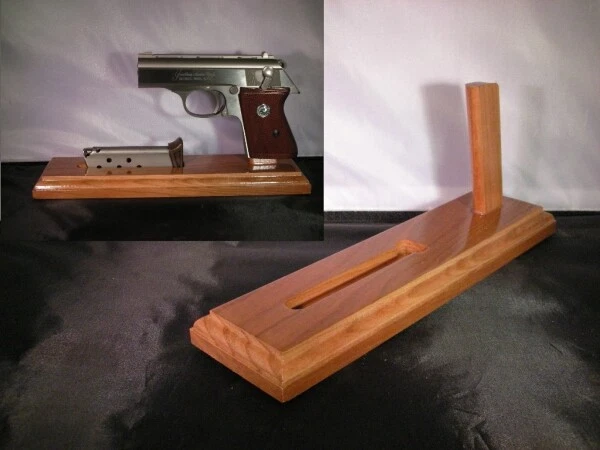 Cherry Pistol Stand specially made for Indian Arms P380 Why are my stands better? All Display Stands are made with the finest quality hand selected American Cherry clear heart wood cut and milled in the Shenandoah Valley of Virginia I work hard to get the barrels horizontal so every piece in your collection looks great when displayed together. Every piece is completely hand crafted in the USA. The Cherry is not stained to preserve the natural color. Five coats of durable polyurethane clear coat create a water free barrier to protect your piece. Felt feet protect your furniture. Serving collectors like yourself since 1996. Usually I get your order out within a few days, but if I am out of stock, I have to build the stand and that usually takes 1 to 2 week. Model with magazine slot:: 2.75 x 10.25 x 3/4 inches. Model without magazine slot: 2.75 x 7.25 x 3/4 inches Height: 4 1/4 inches We also do custom stands PISTOL NOT INCLUDED.