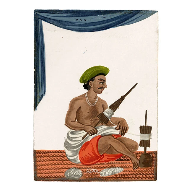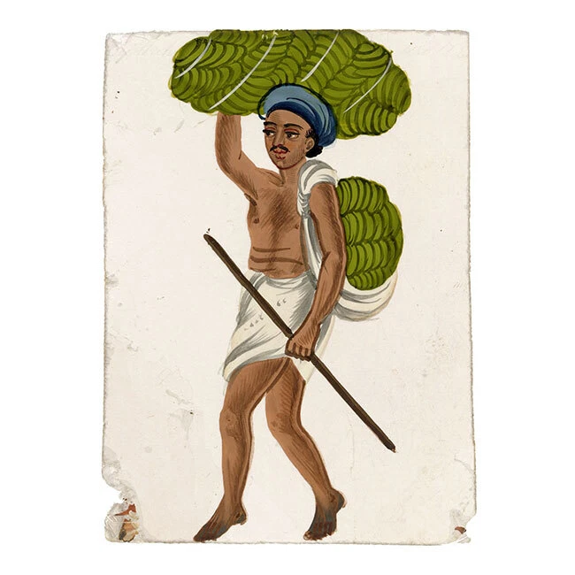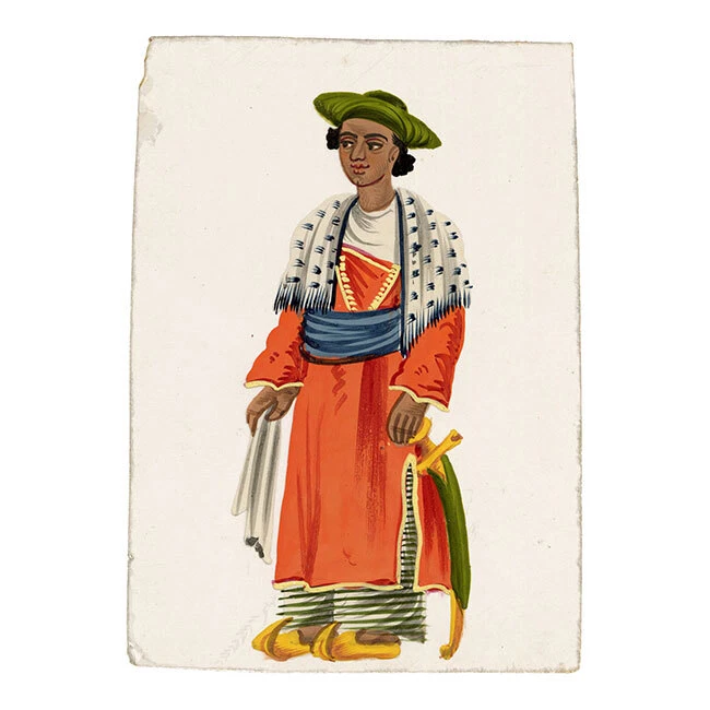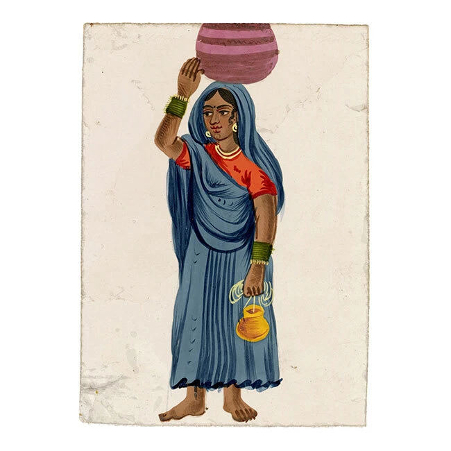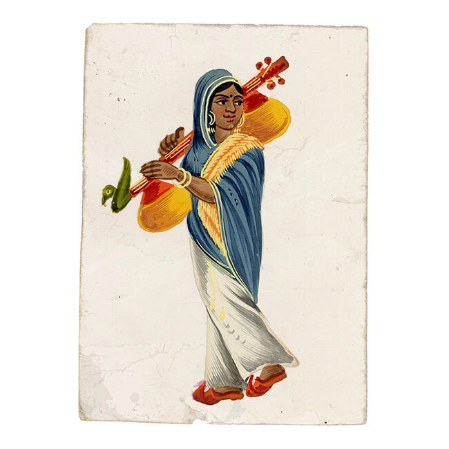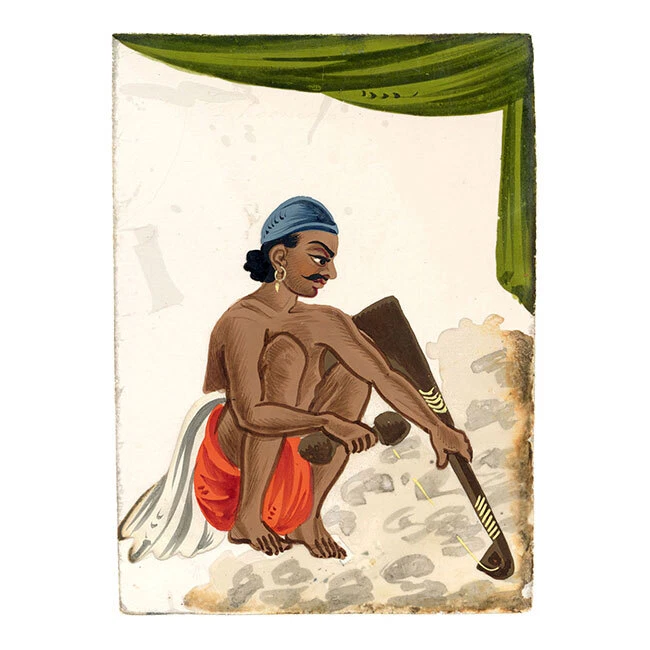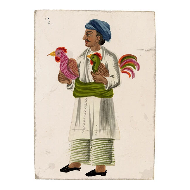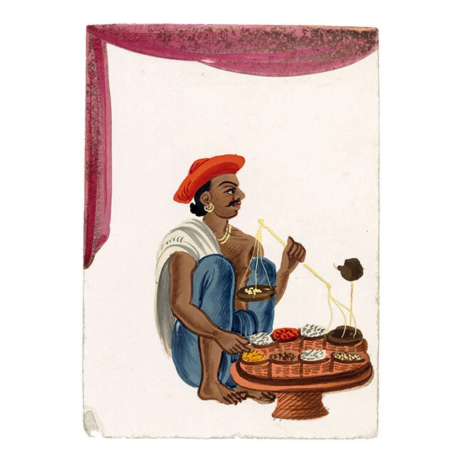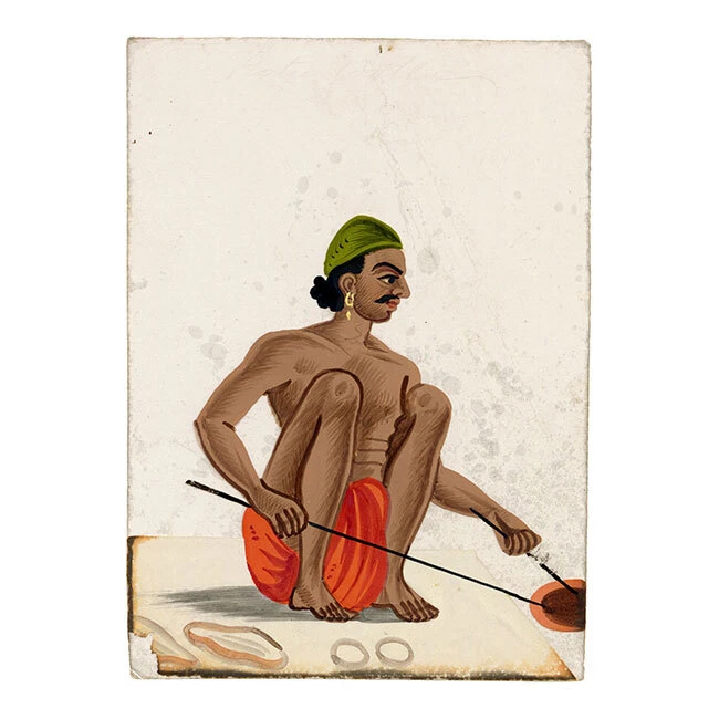 View All Subject Abstract Animals Architectural Botanical Cartoon Children Cityscape | Townscape Decorative Arts Fashion | Costume Floral | Gardens Food | Wine Genre Illustration Landscape Military Music | Instruments Mythical | Fantasy Life Drawing Political Portrait Religious | Inspirational Seascape | Marine Still Life Transport Medium Acrylic Aquatint Chalk Charcoal Engraving Etching Gouache Graphite Linocut Lithograph Mezzotint Mixed Media Oil Pastel Pen & Ink Pith Painting Watercolour Woodblock Woodcut | Wood Engraving Indian Company School Mica Paintings – Set of 12 Street Trades, early 19th-century Benares An original early 19th-century set of 12 Indian gouache paintings on transparent mica. A beautiful, vivid set of 12 Indian gouache paintings on transparent mica, painted at Benares (Varanasi) in eastern India in the early 19th century. The set depicts street sellers, performers and trades. Interestingly, each is discreetly inscribed with the name of the occupation as it was then known, such as 'Hooka-wallah Hubble bubble' for Hookah seller, or 'Mithaee-walla' for Mithai-wallah' or Sweet seller. In total, the figures comprise hookah seller (Hooka-wallah), sweet seller (Mithaee-walla), roti seller (Rotee-walla), kebab meat seller (Kubbab-walla), cockerel seller (Moorug-walla), 'Soot-walla', 'Puttah-walla', dhol drum player (Dholl-bajawa), stringed instrument player (Bien-wallee), water-woman (Punbhurin), local official (Thannah jemadar) and 'Dhooniah'. Indian Company paintings on mica are rare; it is estimated that as of now, there are only around 7,000 mica paintings available in the world. The micas are loose with no mount or backing but are contained within their original folded paper sleeve, which is inscribed '12 Indian Costumi / Painted at Benares'. The paper is watermarked 'G Wilmot 1834'. Each measuring approximately 10.8 x 7.6cm. An inscription accompanying the collection indicates a likely provenance: 'probably bought by Capt Guise'. This is possibly Lt Colonel John Guise (1813–1890), HEICS of The Bengal Army, Lt General John Christopher Guise VC CB (1826–1895) who served with the British Army at Lucknow in 1857, or his brother Major Henry John Guise (1817–1857) who was killed in action during the Indian Rebellion. Details Signed: No. Inscribed: Each inscribed at the upper edge. Dated: -- Height (cm): 10.8 Width (cm): 7.6 Height (inches): 4.25 Width (inches): 2.99 Condition: Overall the mica paintings are in very good condition, with vivid colours and minimal paint and mica loss, and generally very little delamination. One mica sheet has small losses to the lower corners; another has a small loss to the lower edge. Please see photos for detail. Presented: Unframed. Stock Number: KB-477 All artworks come with a Certificate of Authenticity and—if it is a collection artwork—its accompanying collection text or artist biography. 'Company School' refers to a variety of hybrid styles that came about through the influence of Western (especially British) patrons on Indian artists in the 18th and early 19th centuries. Finding traditional, stylised Indian painting not to their taste, these patrons began to collect works that, while incorporating traditional elements from Rajput and Mughal painting were given a more 'western' appearance through their use of perspective and rounded modelling, as opposed to the more decorative, 'flatter' styles that had gone before. The Company style evolved to meet this demand: as many of their collectors worked for the East India Company, these paintings became associated with the name. Leading centres of the Company style were the main British settlements of Calcutta, Madras (Chennai), Delhi, Lucknow and Patna. Europeans commissioned sets of images depicting festivals and scenes from Indian life, with people of different castes or trades being particular favourite subjects, as well as dancers and musicians. Collectors were particularly attracted to what were perceived to be the exotic customs, costumes and architecture of their adopted—and in many cases temporary—homeland. Mica is a transparent mineral which is found throughout south India. The mica is formed between strata of granite, and the transparency of the material is a result of the heat and pressure created between layers of rock. Mica consists of many interlocking platelets, resulting in a laminar structure which can be split easily into thin sheets. The appeal of mica as a support for painting is due to its very smooth surface: the paint sits on it without sinking in, making the colours very intense. Mica is a very brittle substance, however, meaning that it is relatively rare to find examples in perfect condition. Contact What We Offer Our Listings About Us Delivery Returns Contact We welcome all enquiries. If you have a question about a specific artwork, it is helpful if you can please quote the 'stock number' listed towards the top of the product description (e.g. JG-347), in order to help identify the work. Please see our Business Seller Information below for contact details. Our gallery is exclusively online. Should you wish to view an artwork in person, please contact us to arrange an appointment (Monday to Friday, 9.30am–5.00pm). Please provide the 'stock number' (e.g. JG-347) of the artworks that you are interested in so that we can get them out of storage for you. As all artworks are kept in storage, please note that general browsing is not possible. The Somerset & Wood Guarantee It is our absolute priority that your buying experience at Somerset & Wood is of the highest quality. This extends from the accuracy of our listings and depth of research, to the diligence of our communication, and the care taken with our packing. We believe that these principles are as important for a low priced artwork as an expensive piece; we are committed to offering affordable art with high 'added value' and to keeping our prices as low as possible. Included with your order you 