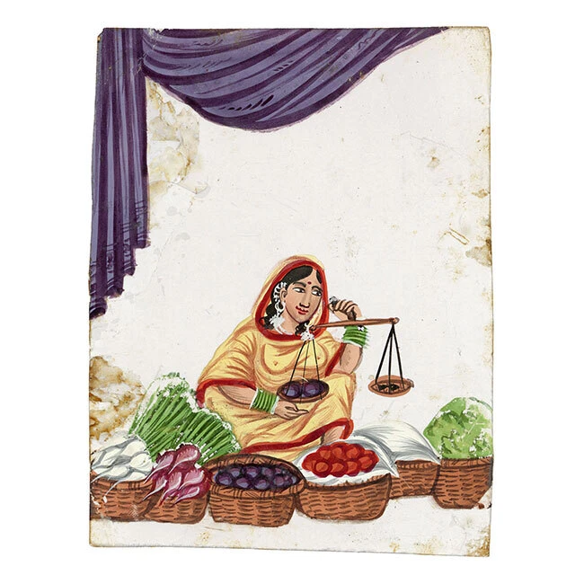 View All Subject Abstract Animals Architectural Botanical Cartoon Children Cityscape | Townscape Decorative Arts Fashion | Costume Floral | Gardens Food | Wine Genre Illustration Landscape Military Music | Instruments Mythical | Fantasy Life Drawing Political Portrait Religious | Inspirational Seascape | Marine Still Life Transport Medium Acrylic Aquatint Chalk Charcoal Engraving Etching Gouache Graphite Linocut Lithograph Mezzotint Mixed Media Oil Pastel Pen & Ink Pith Painting Watercolour Woodblock Woodcut | Wood Engraving Indian Company School Mica Paintings – Set of 8 Street Sellers & Trades, 19th-century An original early 19th-century set of 8 Indian gouache paintings on transparent mica. A fantastically vivid set of 8 19th-century Indian gouache paintings on transparent mica depicting street sellers and trades. The detailed colourful figures comprise a Dhobi washerman, Textile dyer, Bhisti Water-carrier, Burkundaz armed guard, Khidmutgar servant, Hindoo religious devotee and male and female vegetable and grain sellers. Indian Company paintings on mica are rare; it is estimated that as of now, there are only around 7,000 mica paintings available in the world. The micas are loose with no mount or backing. Each measuring approximately 12.8 x 9.7cm. An inscription accompanying the collection indicates a likely provenance: 'probably bought by Capt Guise'. This is possibly Lt Colonel John Guise (1813–1890), HEICS of The Bengal Army, Lt General John Christopher Guise VC CB (1826–1895) who served with the British Army at Lucknow in 1857, or his brother Major Henry John Guise (1817–1857) who was killed in action during the Indian Rebellion. Details Signed: No. Inscribed: No. Dated: -- Height (cm): 12.8 Width (cm): 9.7 Height (inches): 5.04 Width (inches): 3.82 Condition: Overall the mica paintings are in good condition, with vivid colours and minimal paint and mica loss. The mica has some degree of delamination in places, with a limited amount of associated brown staining. Some minor wear / small losses to the corners of the mica, as per the photos. One mica sheet has flaking at the upper left and a historic tape repair to the lower right corner. Please see photos for detail. Presented: Unframed. Stock Number: KB-478 All artworks come with a Certificate of Authenticity and—if it is a collection artwork—its accompanying collection text or artist biography. 'Company School' refers to a variety of hybrid styles that came about through the influence of Western (especially British) patrons on Indian artists in the 18th and early 19th centuries. Finding traditional, stylised Indian painting not to their taste, these patrons began to collect works that, while incorporating traditional elements from Rajput and Mughal painting were given a more 'western' appearance through their use of perspective and rounded modelling, as opposed to the more decorative, 'flatter' styles that had gone before. The Company style evolved to meet this demand: as many of their collectors worked for the East India Company, these paintings became associated with the name. Leading centres of the Company style were the main British settlements of Calcutta, Madras (Chennai), Delhi, Lucknow and Patna. Europeans commissioned sets of images depicting festivals and scenes from Indian life, with people of different castes or trades being particular favourite subjects, as well as dancers and musicians. Collectors were particularly attracted to what were perceived to be the exotic customs, costumes and architecture of their adopted—and in many cases temporary—homeland. Mica is a transparent mineral which is found throughout south India. The mica is formed between strata of granite, and the transparency of the material is a result of the heat and pressure created between layers of rock. Mica consists of many interlocking platelets, resulting in a laminar structure which can be split easily into thin sheets. The appeal of mica as a support for painting is due to its very smooth surface: the paint sits on it without sinking in, making the colours very intense. Mica is a very brittle substance, however, meaning that it is relatively rare to find examples in perfect condition. Contact What We Offer Our Listings About Us Delivery Returns Contact We welcome all enquiries. If you have a question about a specific artwork, it is helpful if you can please quote the 'stock number' listed towards the top of the product description (e.g. JG-347), in order to help identify the work. Please see our Business Seller Information below for contact details. Our gallery is exclusively online. Should you wish to view an artwork in person, please contact us to arrange an appointment (Monday to Friday, 9.30am–5.00pm). Please provide the 'stock number' (e.g. JG-347) of the artworks that you are interested in so that we can get them out of storage for you. As all artworks are kept in storage, please note that general browsing is not possible. The Somerset & Wood Guarantee It is our absolute priority that your buying experience at Somerset & Wood is of the highest quality. This extends from the accuracy of our listings and depth of research, to the diligence of our communication, and the care taken with our packing. We believe that these principles are as important for a low priced artwork as an expensive piece; we are committed to offering affordable art with high 'added value' and to keeping our prices as low as possible. Included with your order you will receive: Certificate of Authenticity (COA) Supplying a COA when selling an artwork is a long-established convention. It is all the more pertinent in today’s online marketplace, where as a buyer you commit to purchase without the opportunity to view and scrutinise the work. By providing a COA with every artwork, backed by our knowledge and expertise, we are vouching that a work is of the stated age and authorship. Accompanying Text for all Collection Works or Listed Artists A printed copy