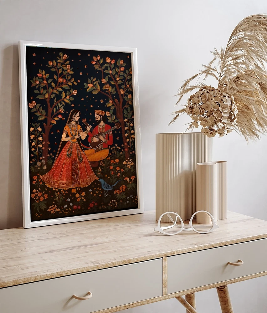 Indian Romantic Folk Painting Royal King Queen Art Raja Rani Indian Art Living Room Decor Vintage Indian Folk Poster Material: Premium luster photo paper Print type: Inkjet printing One side printed + The finish provides the highest possible resolution and color saturation + Lasts up to 200 years in color and 400 years in black-and-white + Printed on high-quality resin-coated photo base paper medium + Posters can be hung with double-sided tape, tacks, or framed + Hand washing with a gentle cry cloth is recommended for extended durability I will hand select the best choice of paper for your chosen design to ensure top quality results for a beautiful, bright and luxurious print. All prints are sealed in cellophane slips for protection during transportation, and are shipped in a protective cardboard envelope.