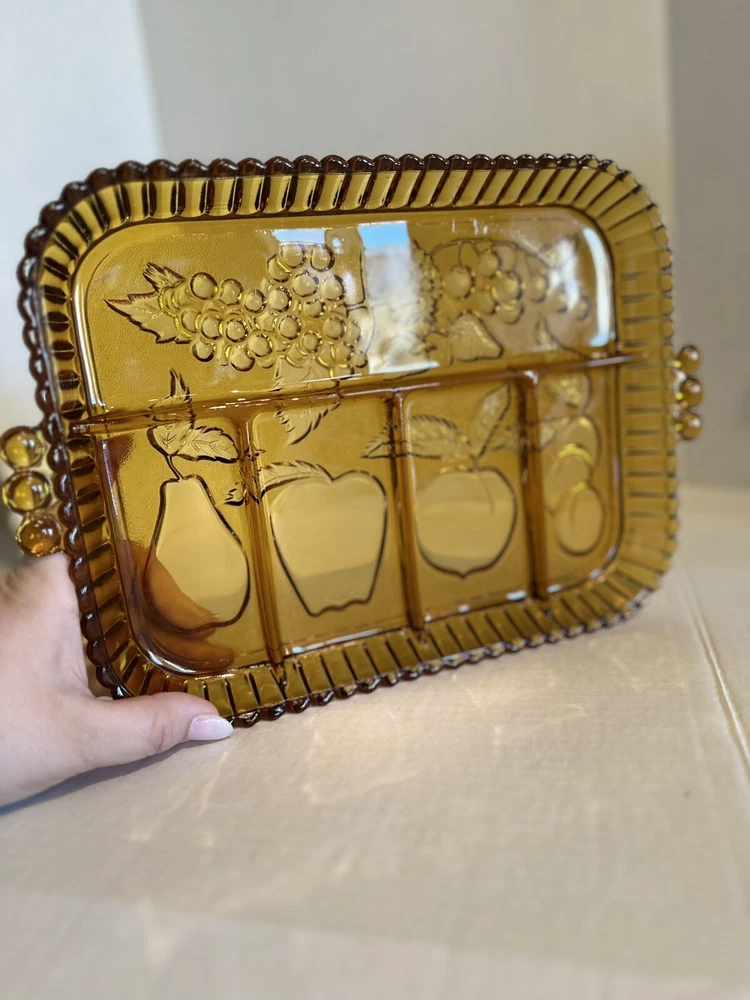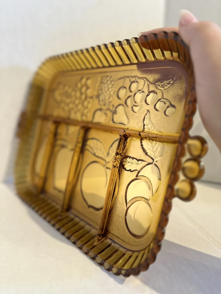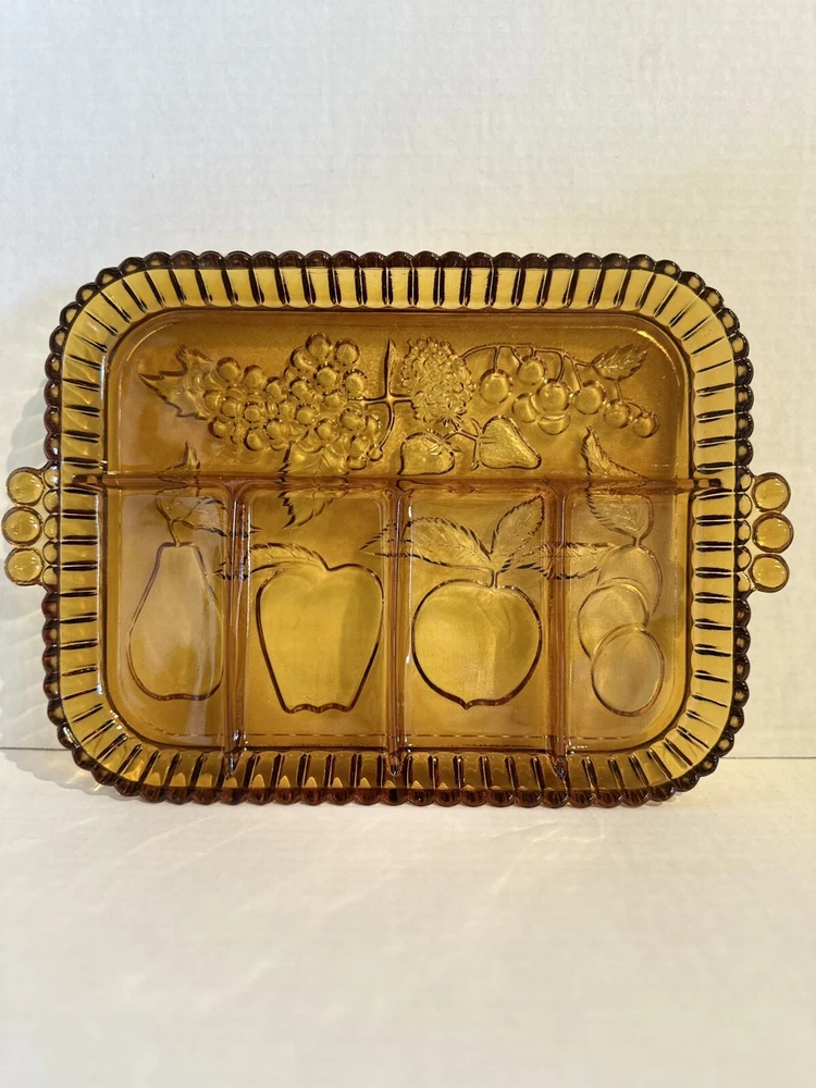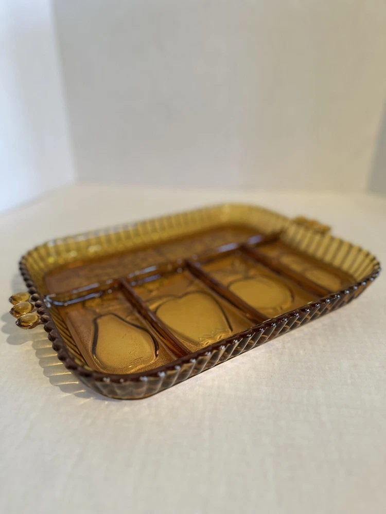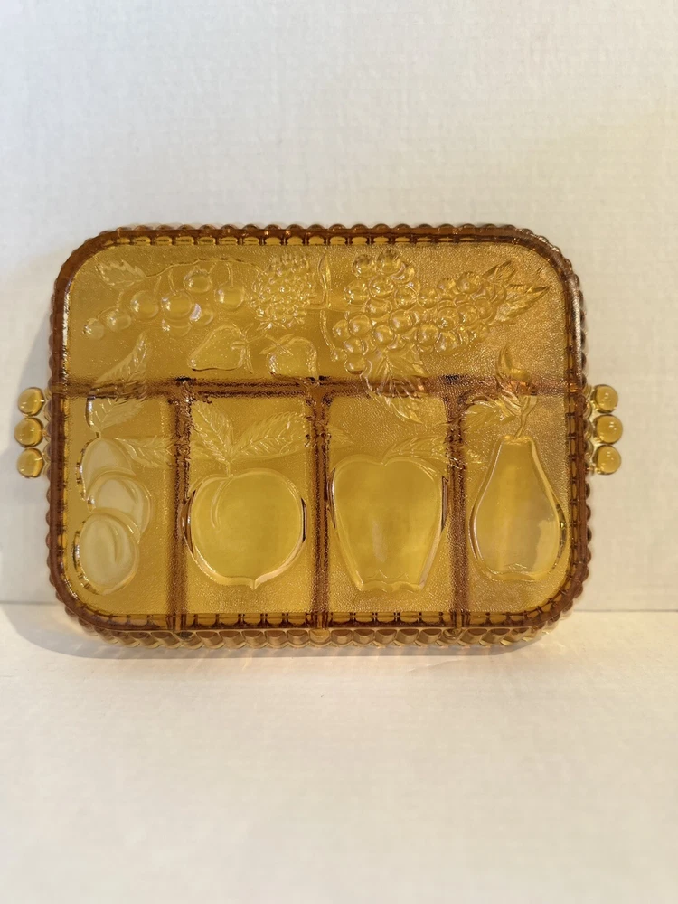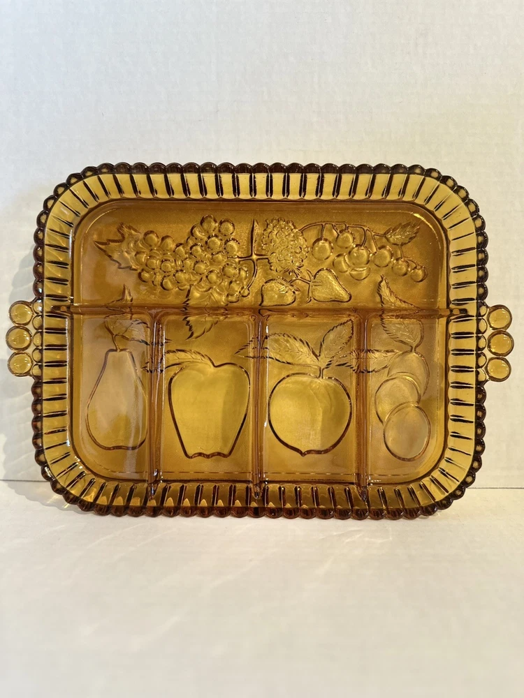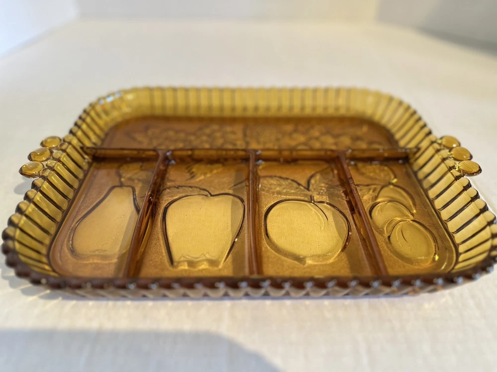 Elevate your serving game with this stunning Indiana Glass Amber Divided Part Relish Serving Dish Tray. The intricate fruit design on the carnival glass adds a touch of elegance to any table setting. Perfect for hosting dinner parties or holiday gatherings, this dish is sure to impress your guests. Crafted from high-quality glass and produced in a beautiful gold color, this relish dish is a must-have for any collector or home chef. Use it to serve your favorite condiments or as a decorative piece in your home.