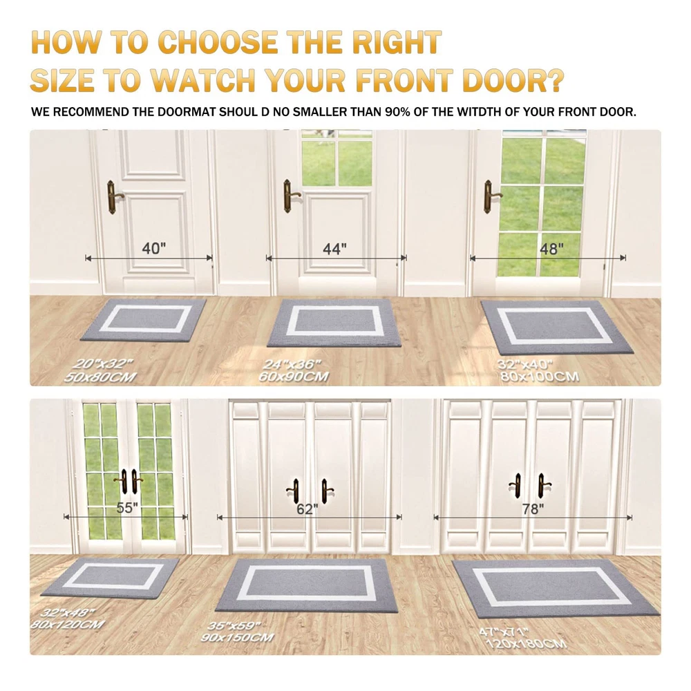 TO MAKE EVERYDAY LIFE EASIER We are dedicated to bringing our customers premium, high-quality, and functional household products at reasonable prices. Our vision is to continuously innovate and improve our products based on customer needs as well as current industry trends. With many different color and sizes to choose from, you will easily find mats to coordinate with your decor! FEATURES:- Constructed of 100% high-quality polypropylene fabric- Dimensions: 20" x 32" x 0.4" / 24" x 36" x 0.4"/ 32" x 48" x 0.4"/ 35" x 59" x 0.4"- Grey, Black and Khaki - Non-slip TP rubber backing- Ribbed weave to work as shoe scraper TAKE A LOOK AT SOME POPULAR QUESTIONS FROM OUR VALUED CUSTOMERS: ☛ HOW CAN I CLEAN THIS MAT? For a quick clean, simply vacuum with a hand-held or regular sized vacuum. Your mat can also be spot cleaned using a mild soap and a damp cloth. For deeper cleans, use a garden hose to rinse off outdoors. Always air dry. Never use bleach on the mat. ☛ CAN I USE THIS MAT UNDER LOW-CLEARING DOORS? Yes! Our mat is designed with a 0.4” sleek, low-pile for most low-clearing doors or entryways. This mat works in both interior and exterior spaces. ☛ HOW EFFECTIVE IS THIS MAT IN CAPTURING DIRT AND MOISTURE? Good question. We’ve intentionally designed our door mats with the solid and practical polypropylene fiber to help keep dirt and moisture trapped in the absorbent mat fabric and off your floors! [FRIENDLY NOTE] Upon arrival, your doormat may have some wrinkles due to being folded during packaging. No worries—this won't impact its functionality. Simply toss it in the washing machine, lay it flat for a couple of days, and let it naturally regain its shape. Alternatively, a quick pass with a hot iron will smooth out any remaining wrinkles. [SOFT TOPSIDES AND ELEGANT DECOR] Transform your space with 's indoor door mats, boasting a gentle yet sturdy topside. The refined geometric design brings an air of beauty and sophistication, establishing a warm and inviting atmosphere. Experience the harmonious blend of comfort and aesthetics as the soft topsides cradle your feet in luxurious elegance. [CAPTURES DIRT AND MOISTURE] Step into comfort with 's indoor door mat. Crafted to effectively capture dirt and rapidly absorb moisture, this mat is perfect for your entryway. Ensure your shoes are promptly rid of water, dust, grit, muck, sand, and more. Elevate your entrance with 's versatile doormat. [EFFORTLESS ELEGANCE] 's door mat features a slim 0.4-inch profile complemented by reinforced overlock edges, presenting a chic and streamlined aesthetic. The considerate design guarantees smooth door operation while keeping the mat securely in place. Cleaning is a breeze – a quick shake, a sweep with a broom, or a pass with a handheld vacuum maintains its fresh appearance. For a deeper clean, toss it in the washing machine with cold water and tumble dry on low heat. [PERSONALIZED WELCOME] Craft a personalized welcome for your home with 's door mat. Its neutral yet stylish design seamlessly complements any decor, providing a platform for expressing your unique taste. Versatile and suitable for all weather conditions, this door mat fits effortlessly as a front door mat, outdoor mat, welcome mat, indoor entryway mat, shoe mat, dog doormat, or floor mat. Ideal for use in various areas, such as the mudroom.