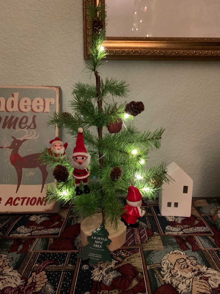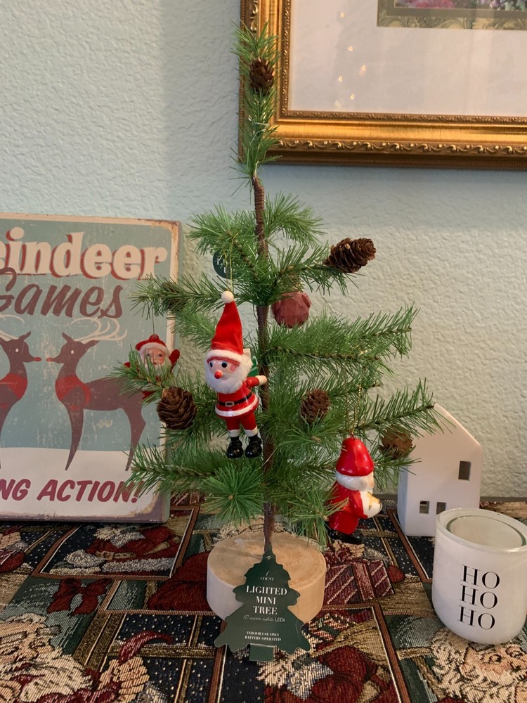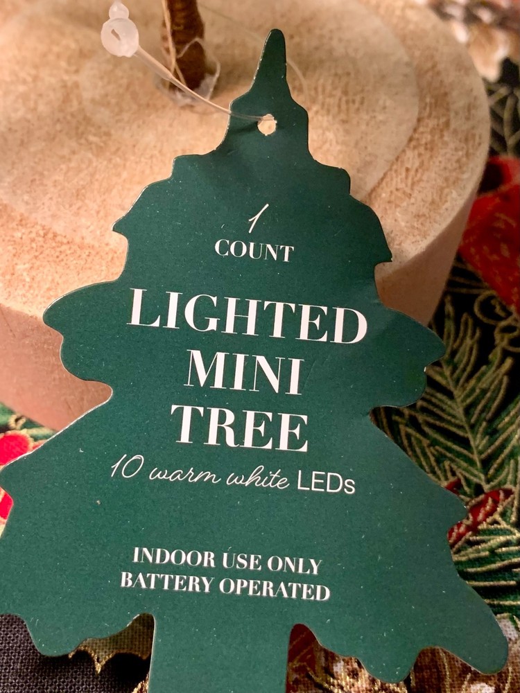 Indoor Lighted Mini Christmas Tree 10 warm white LEDs and 6 brown pinecones Battery operated - three AAA batteries (not included) 17" tall, 9" wide 3 1/2" diameter wood base