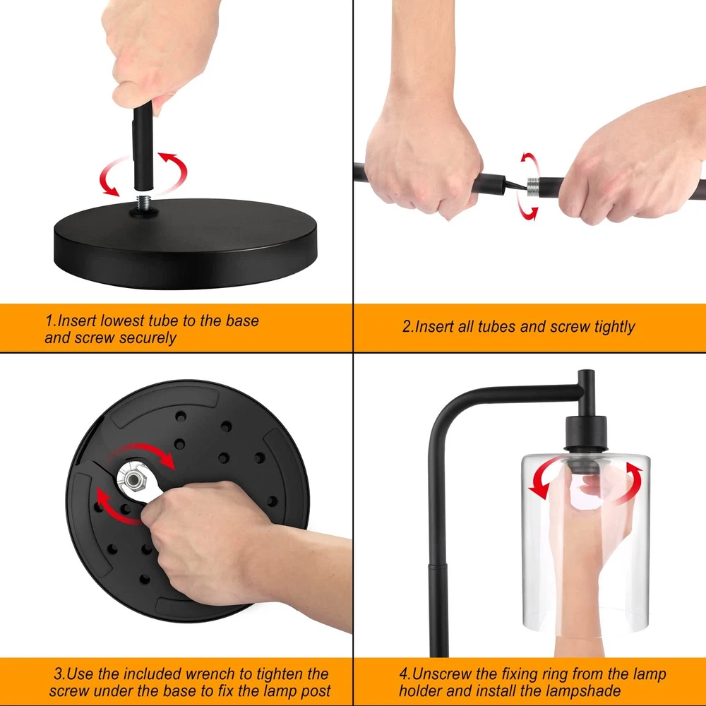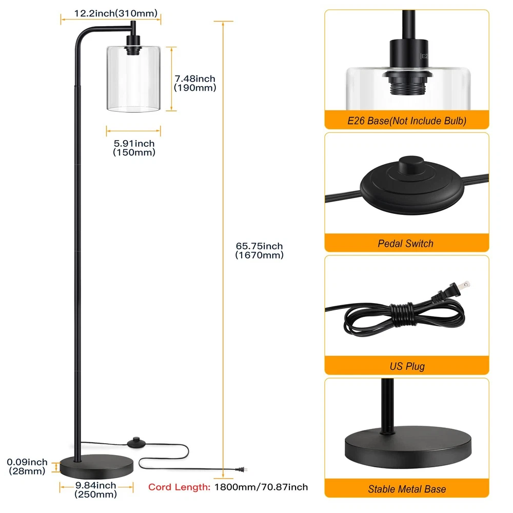 Industrial Floor Lamp, Modern LED Standing Lamps with Hanging Clear Glass Shade, Classic Reading Tall Pole Light for Living Room Bedroom Office Study Room Farmhouse, Black Modern & Industrial Design: Inspired by the modern minimalist design concept, our industrial floor lamp mixed anti-rust finished black tubular metal body and sturdy clear glass shade, which compatible with a wide range of decor styles like new Nordic, mid-century, modern, classic, art deco. Adds a vintage yet upscale look to your living room, bedroom, study room, kids room, dorm, nursery, office Safe and Sturdy: This bedroom tall lamp adapts with a weighted 9.84" metal base, which can firmly hold the black stand up lamps, providing good stability and durability that prevents tipping for daily use, making it safe around children, aged, and pets Convenient & Practical Switch: The tall reading lamp is equipped with a foot pedal switch, very convenient to switch the light on/off by your foot. The extended 1800mm/5.9ft cord allows you to place the floor lamp anywhere you want, such as near seats, sofas, side tables, beds Easy Assemble: This living room lamp is easy to assemble without tools, as the package has contained all components. Just take a few minutes and you can easily screw all the parts of the lamp poles together following the instruction Bulb Requirement: The corner lamp is in standard medium E26 base (60W max), so you can choose different types of E26 bulb(NOT included) like LED, Incandescent or CFL bulb, to decorate these standing light to match your house style