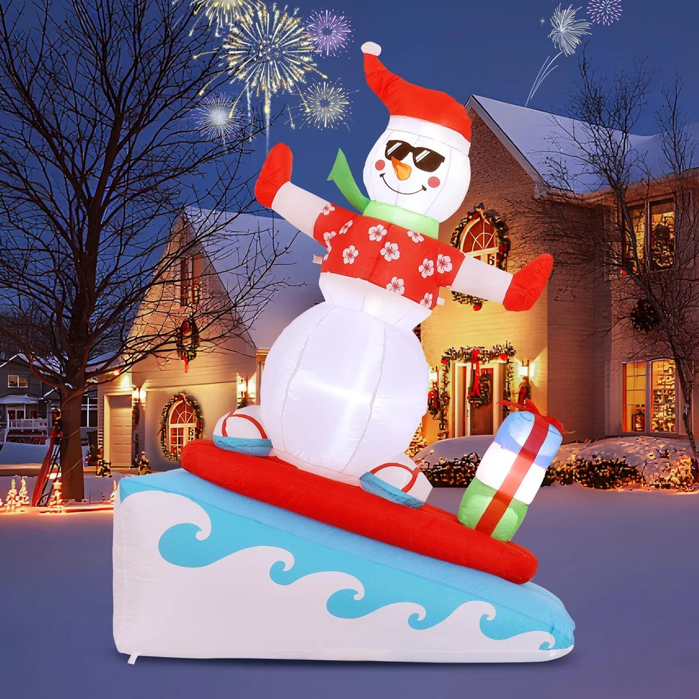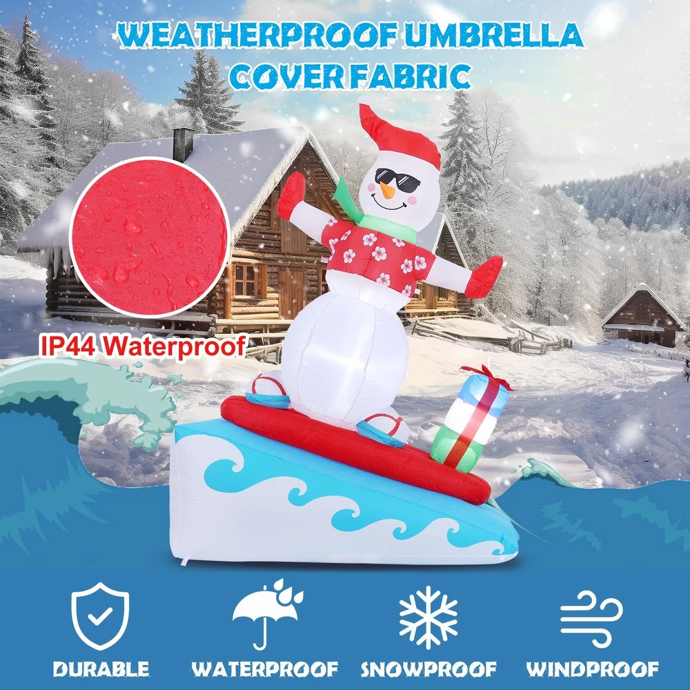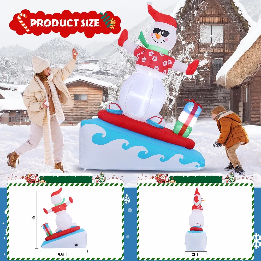 6FT Inflatable Snowman with LED Lights Surfing Snowman Blow Up Yard Decorations Xmas Decorations for Xmas Party Indoor Outdoor Home Garden Lawn Surfing Snowman Inflatable: This 6FT Christmas inflatable outdoor decoration seems to have just returned from surfing in the ocean and brought Christmas presents for you and your family, which will certainly give you, your family and guests a good mood. Your children may also hope to have a cute inflatable friend to accompany them at Christmas. This snowman inflatable is an ideal Christmas gift for kids, its vivid and funny appearance will make them love it at the first sight. Inflatable snowman with LED Lights: The built-in warm white LED lights help this Christmas decorations outside inflatable light up your garden and create a happy and warm Christmas atmosphere in the evening, which will easily catch the eyes of children, neighbors and guests. All of you can dance or talk happily in the warm light forgetting all troubles. Our light up snowman is ideal for both outdoor and indoor family Christmas party decorations to enliven the festival atmosphere. High-quality Inflatable Christmas Decorations: Made of high-quality umbrella cover fabric, this Christmas inflatables snowman can be used without worries in snowy or rainy days. With excellent stitching umbrella fabric, this inflatable christmas ornament won’t be torn apart or fade, and will accompany your family at Christmas next few years. What a perfect inflatable Christmas yard decoration. Christmas outdoor inflatables with Good Stability: There are 1 built-in sndbag, 3 6.6ft ropes and 7 stakes to help to fix the blow up snowman. You can easily install the outdoor snowman on the lawn, in the yard or in the garden. The inflatable snowman outdoor will be firmly fixed on the ground and won’t be blown down by the wind. Just let this Christmas inflatable snowman bring you laughter and joy at Christmas and enjoy a happy and wonderful Christmas party! Fast Inflation and Deflation: The snowman inflatable is quipped with a powerful air blower. Plug in and zip up, you'll see a inflatable snowman in 30s. Unplug and zip up, the snowman blow up can be quickly deflated. The 6.6ft power cord reduces the distance limit of power supply. Just feel free to have a Christmas party in the yard. Putting the Xmas inflatable snowman in front of the door of your store, shopping window will make them more eye-catching and attract more customers. Precautions: 1. Do not cover the surface of the blower during inflation. 2. Keep away from sharp objects. 3. Keep the plug and blower away from water. guarantees to serve you! If you have any questions, suggestions, ideas, please feel free to contact us!