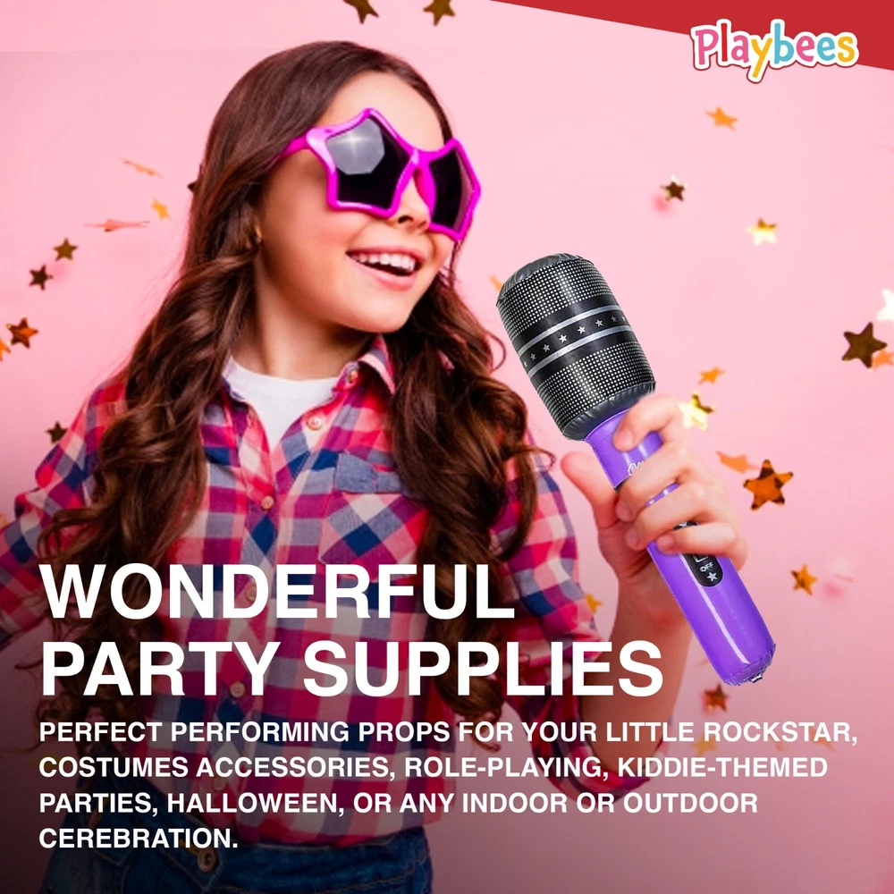 Unleash the ROCKSTAR in your kids with our karaoke-tastic inflatable microphones! Get ready for a colorful musical adventure featuring vibrant shades of blue, light blue, pink, and violet. This package comes with 12 pieces of microphone goodness, measuring a cool 10.5 inches each, and boasting an easy-grip handle for comfortable play at the beach, on road trips, or while camping out. Let the stage come alive as your little performers shine! These microphones are the ultimate props for costumes and role-playing, transforming your kids into the coolest rockstars around. Not only that, they add a magical touch to kiddie-themed parties, Halloween bashes, and all kinds of indoor and outdoor musical events. Get set for a musical extravaganza that's as easy as 1-2-3! Inflating and deflating is a breeze, making these microphones super portable and convenient. Take them on vacation, throw them in a beach bag, or make them the life of any party! Your kids can now unleash their inner idols and perform like pros, anytime, anywhere! The fun never stops with these fabulous microphones from Kicko! Fill your upcoming occasions with excitement using these delightful event supplies. They're perfect additions to party loot bags, promotional gifts, treats, and giveaways. Your little superstars will adore the endless hours of joy and laughter that await them! Safety and durability go hand in hand! Crafted from premium quality vinyl, these microphones are built to last, ready to withstand the wildest rockstar antics! Punctures and leaks are no match for their sturdy construction. 100% safe for your kids, they're the ultimate companions for never-ending fun!