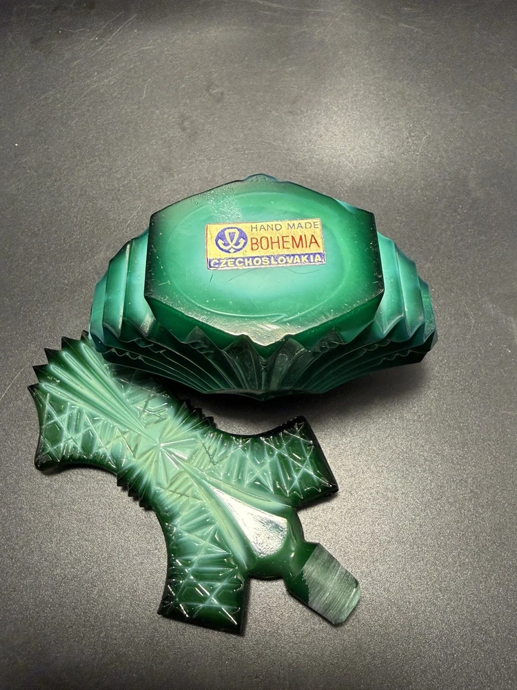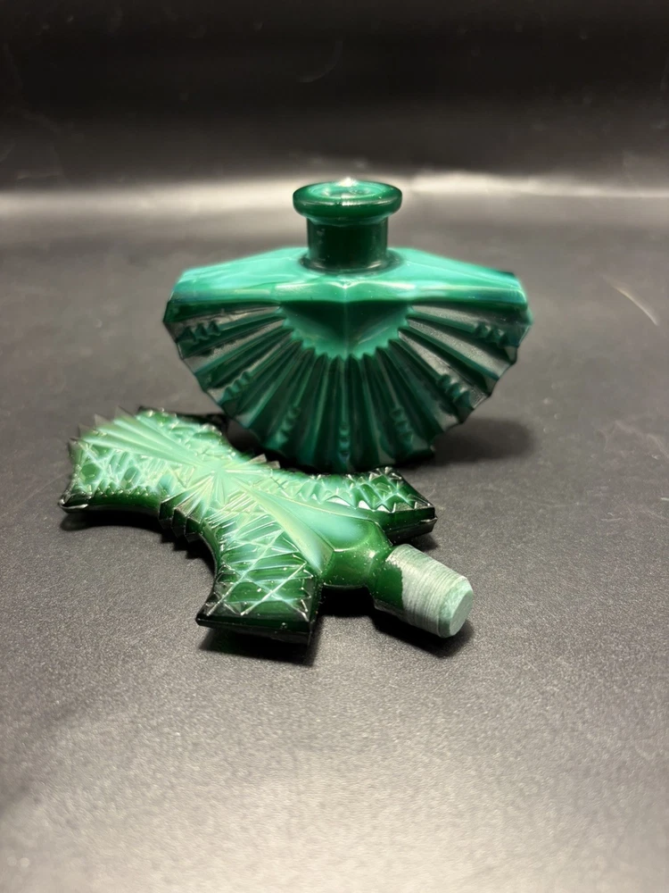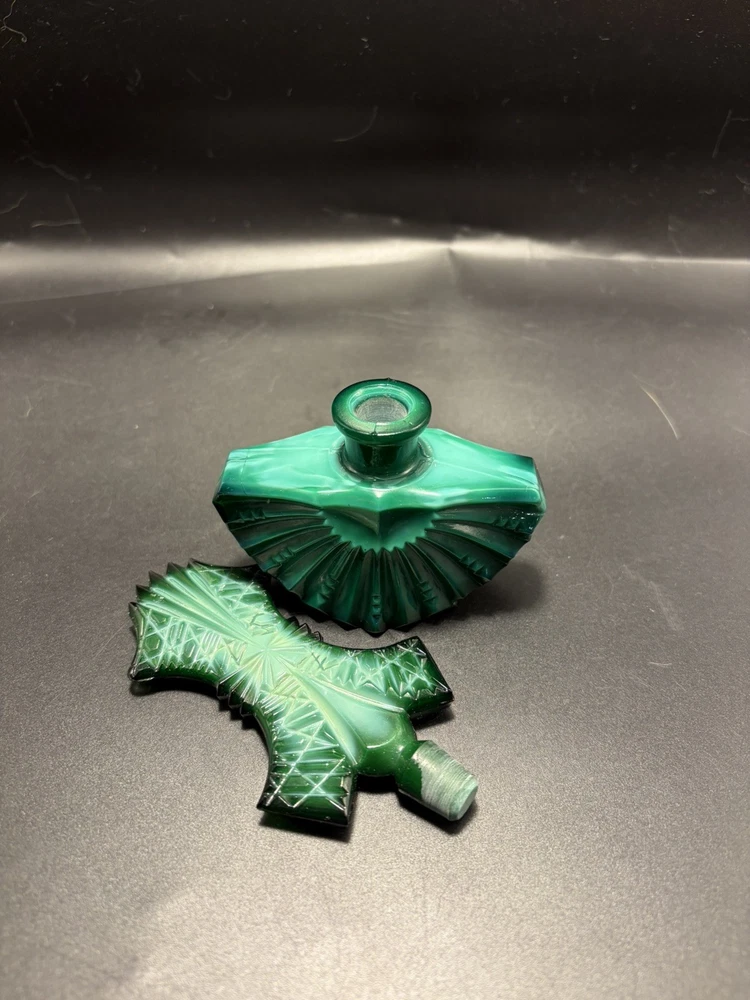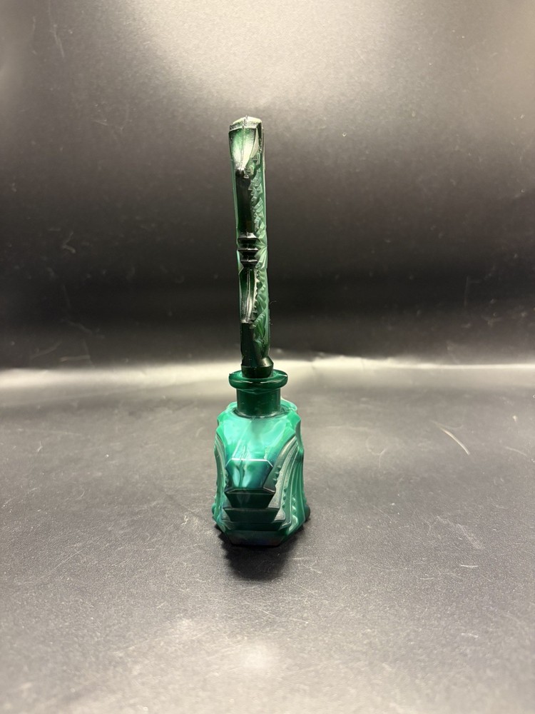 The product is a handmade Ingrid Schlevogt Czechoslovakia Art Deco malachite perfume bottle with stopper, originating from Czechia. Known for its unique design and craftsmanship, this perfume bottle stands out as a luxurious and stylish addition to any collection. The use of malachite adds a touch of elegance and exclusivity to the piece, making it a sought-after item for those who appreciate fine artistry and quality craftsmanship.