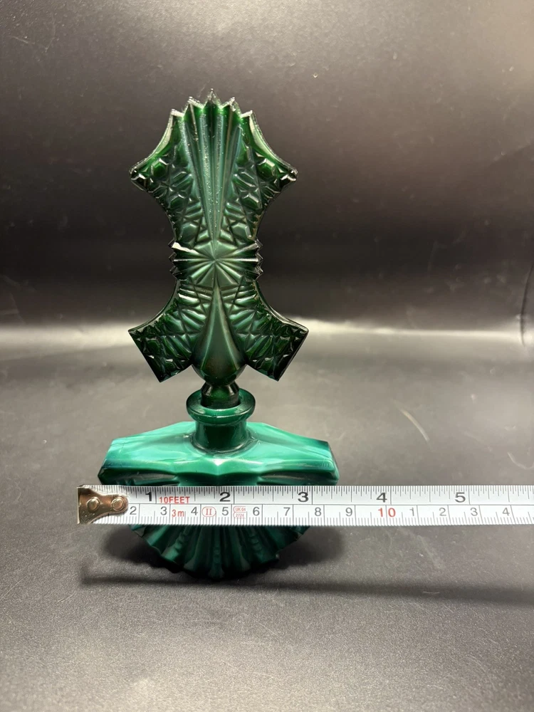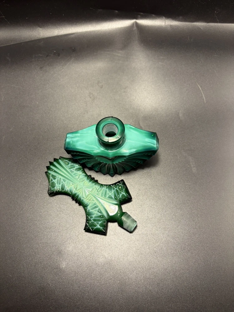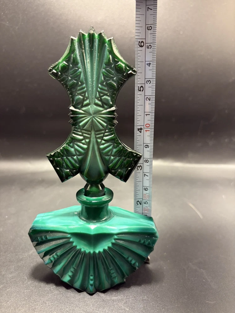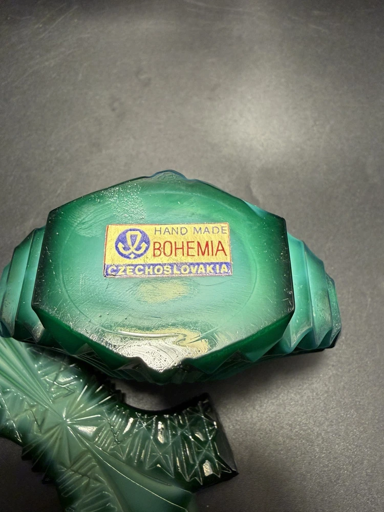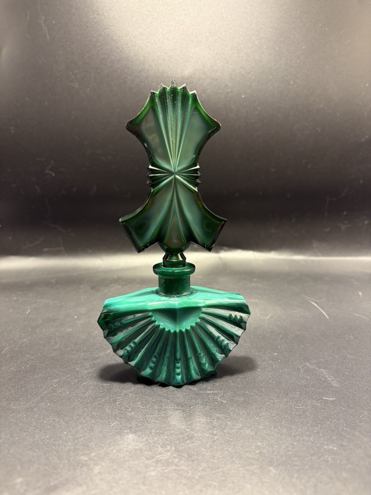 The product is a handmade Ingrid Schlevogt Czechoslovakia Art Deco malachite perfume bottle with stopper, originating from Czechia. Known for its unique design and craftsmanship, this perfume bottle stands out as a luxurious and stylish addition to any collection. The use of malachite adds a touch of elegance and exclusivity to the piece, making it a sought-after item for those who appreciate fine artistry and quality craftsmanship.
