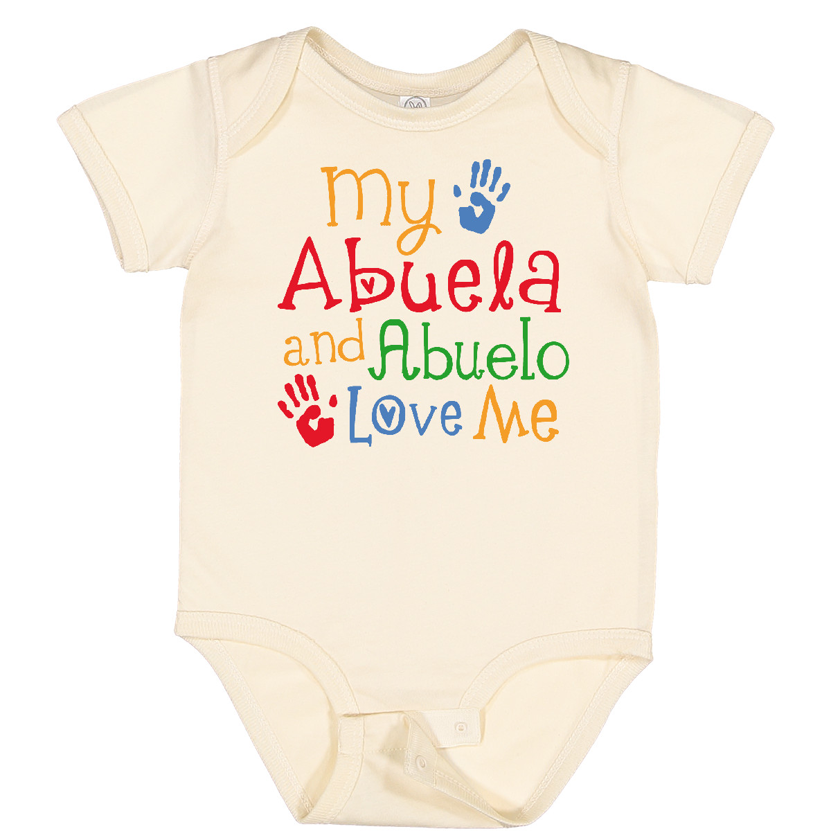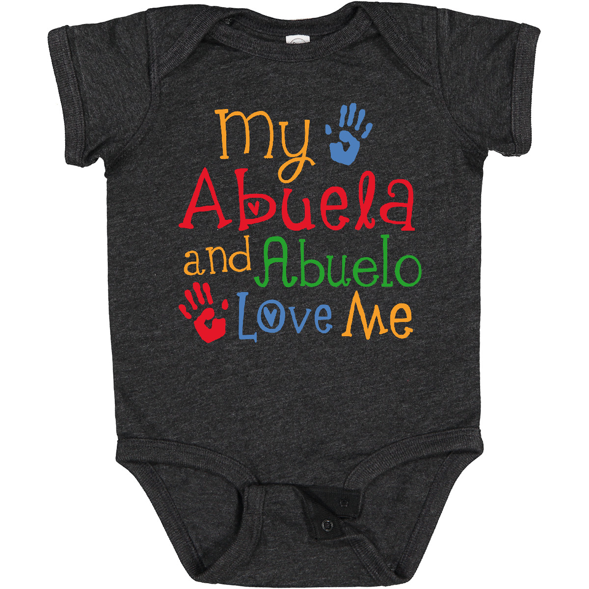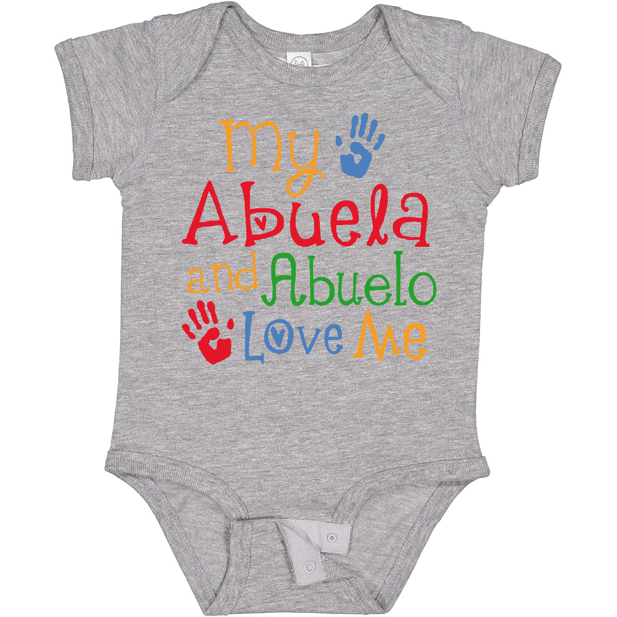 My Abuelo and Abuela love me Baby Bodysuit cute gift for a grandchild has colorful handprint logo for a boy or girl from their grandparents. Our one piece baby bodysuit make great gift for newborns, babies, infants, baby showers and expectant moms. An ideal gift for any new parent who will want one in every color. Baby Bodysuit. Our eBay Store My Abuela and Abuelo Love Me Baby Bodysuit Baseball Heather and Hot Pink 18 Months 22.99 My Abuelo and Abuela love me Baby Bodysuit cute gift for a grandchild has colorful handprint logo for a boy or girl from their grandparents. Our one piece baby bodysuit make great gift for newborns, babies, infants, baby showers and expectant moms. An ideal gift for any new parent who will want one in every color. Baby Bodysuit. Childrens grandchild quote Baby Bodysuit for a favorite set of grandparents. Abuela and Abuelo quote grandkids gift idea. Our one piece baby bodysuit makes a unique clothing gift for newborns, babies, infants, baby showers and expectant moms. Quick & easy diaper changing with reinforced three-snap closure. Solid colors are 100% cotton, other are cotton/polyester or cotton/polyester/viscose Blend.