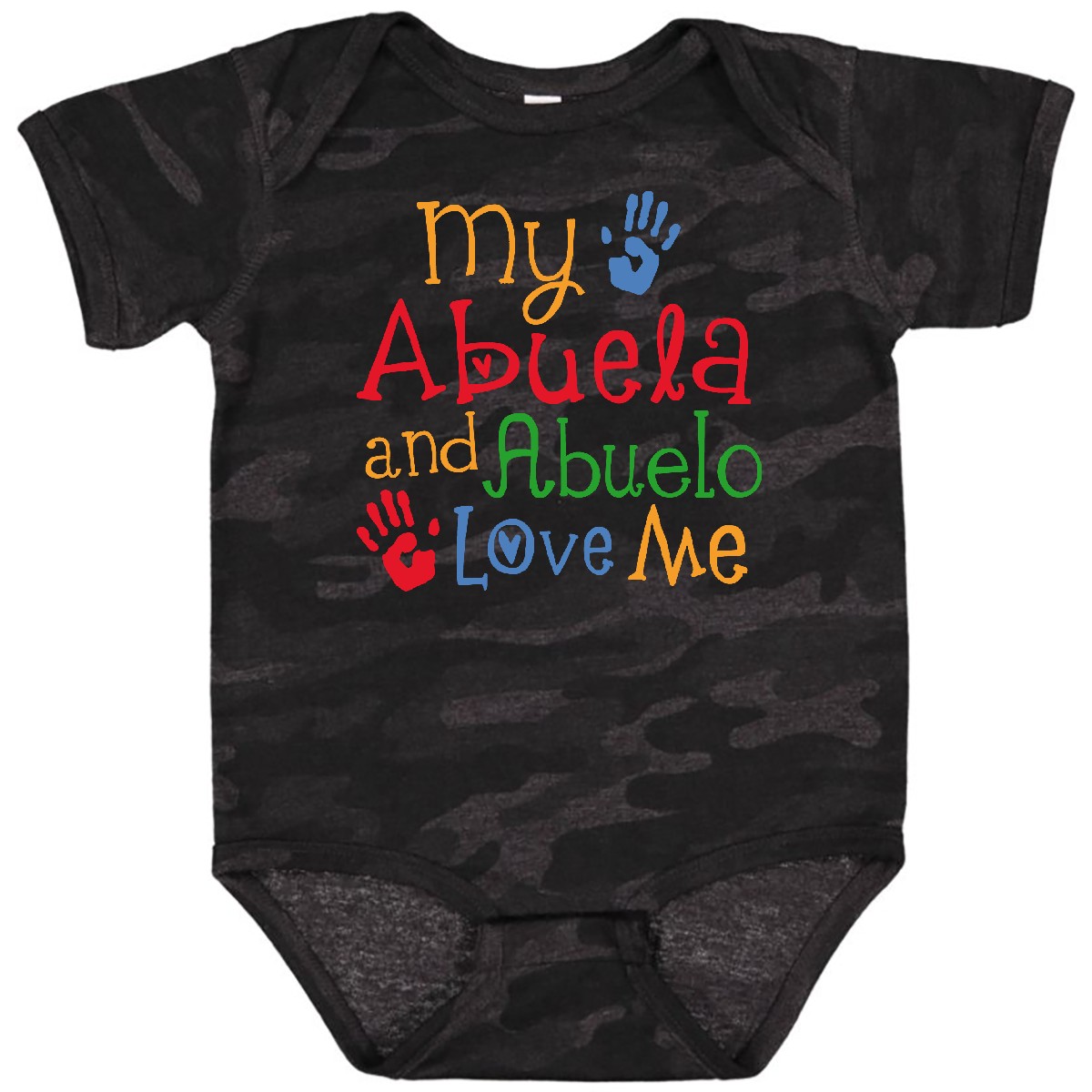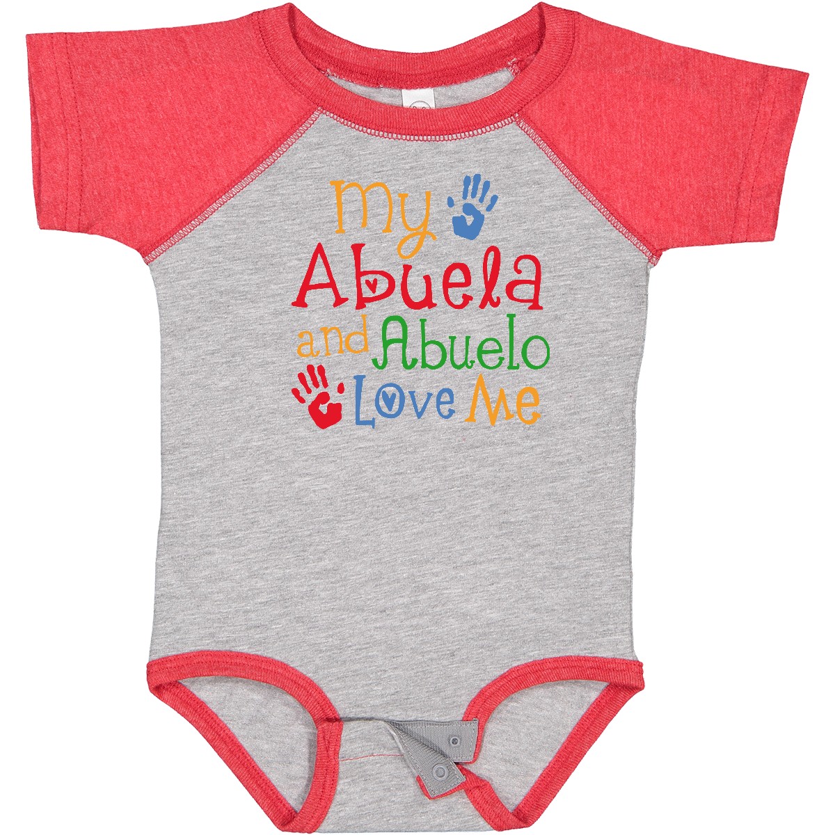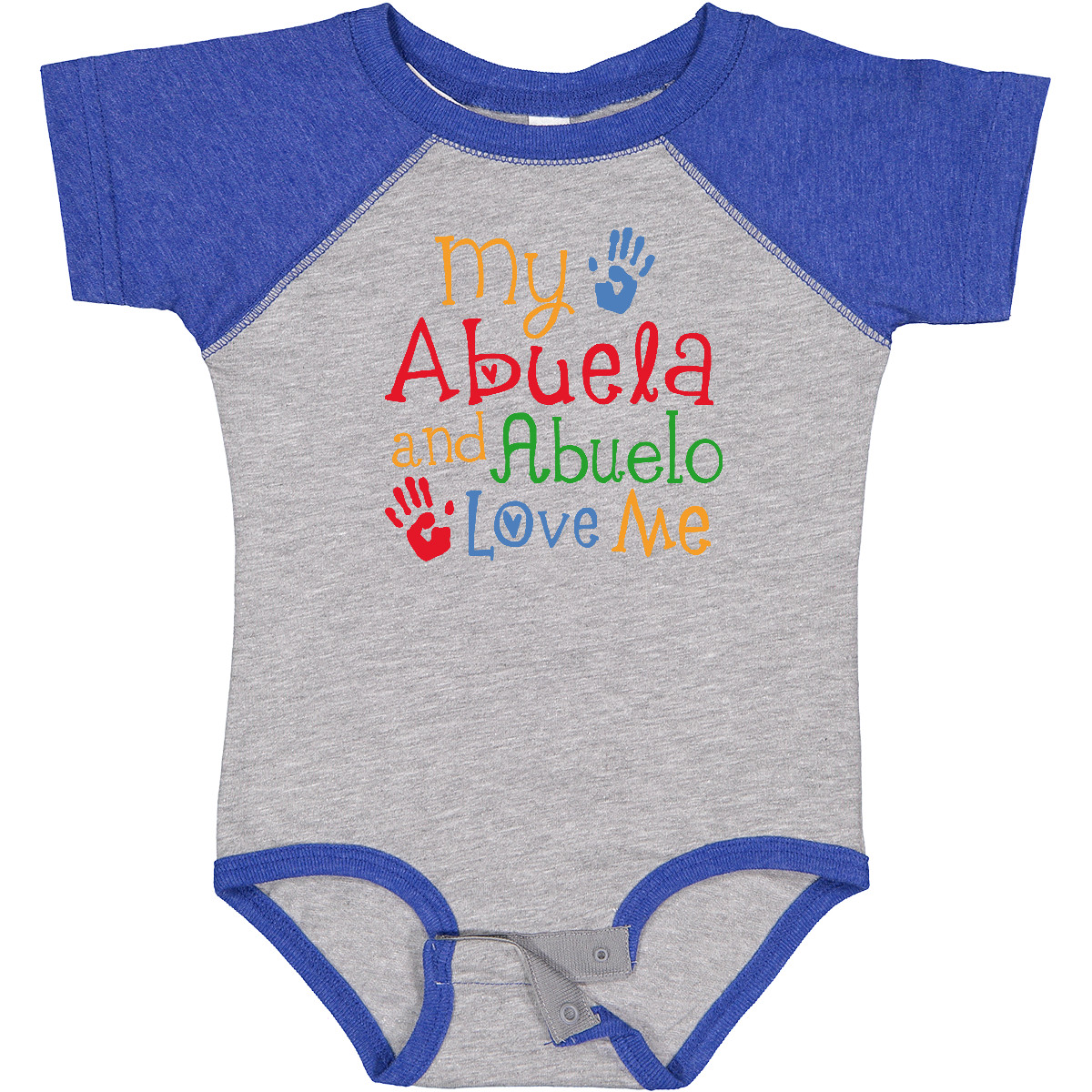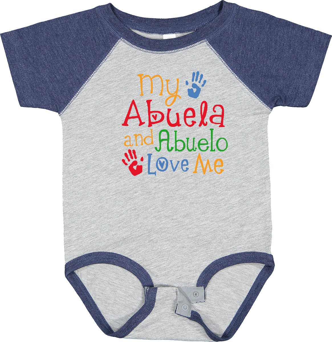 My Abuelo and Abuela love me Baby Bodysuit cute gift for a grandchild has colorful handprint logo for a boy or girl from their grandparents. Our one piece baby bodysuit make great gift for newborns, babies, infants, baby showers and expectant moms. An ideal gift for any new parent who will want one in every color. Baby Bodysuit. Our eBay Store My Abuela and Abuelo Love Me Baby Bodysuit Baseball Heather and Hot Pink 18 Months 22.99 My Abuelo and Abuela love me Baby Bodysuit cute gift for a grandchild has colorful handprint logo for a boy or girl from their grandparents. Our one piece baby bodysuit make great gift for newborns, babies, infants, baby showers and expectant moms. An ideal gift for any new parent who will want one in every color. Baby Bodysuit. Childrens grandchild quote Baby Bodysuit for a favorite set of grandparents. Abuela and Abuelo quote grandkids gift idea. Our one piece baby bodysuit makes a unique clothing gift for newborns, babies, infants, baby showers and expectant moms. Quick & easy diaper changing with reinforced three-snap closure. Solid colors are 100% cotton, other are cotton/polyester or cotton/polyester/viscose Blend.