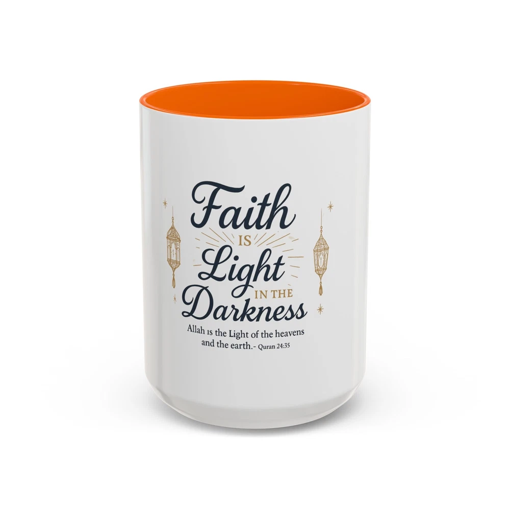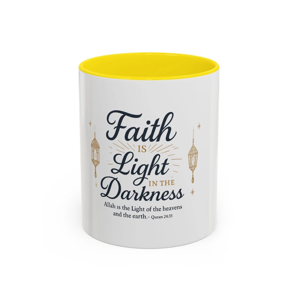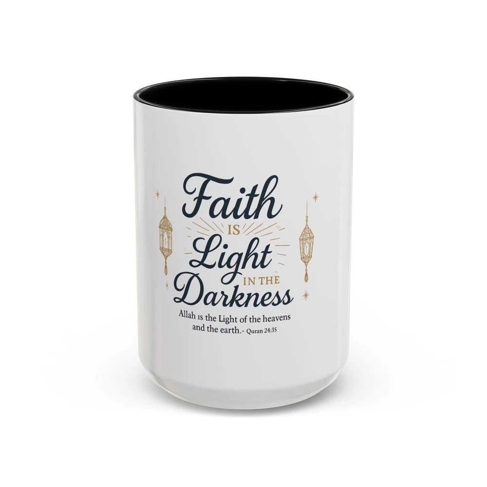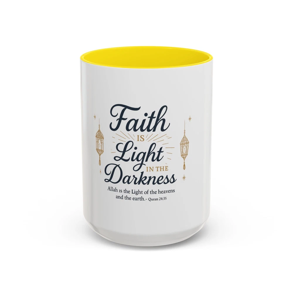 Introducing a vibrant Accent Coffee Mug that adds a splash of personality to your morning routine! Made from durable white ceramic, this mug features a stunning color contrast with a glossy finish that makes even the dullest days feel bright. Ideal for coffee lovers and tea enthusiasts alike, its generous sizes of 11oz and 15oz cater to your caffeine cravings perfectly. The C-shaped handle offers a comfortable grip, ensuring that every sip feels delightful. Whether you’re enjoying a quiet moment at home, sharing laughs with friends, or gifting it to someone special, this mug is perfect for various occasions like birthdays, holidays, or even as a thoughtful 'just because' gift. Celebrate your faith or inspire a loved one during Ramadan, Christmas, or any season of giving with this beautiful piece that reminds us that 'Faith is Light in the Darkness'. Embrace your unique style with this expressive addition to your drinkware collection! Product features - Microwave-safe for easy heating - Dishwasher-safe for effortless cleaning - Vibrant colors with crisp designs - Made from lead and BPA-free ceramic - Available in two sizes for your preference Care instructions - Clean in dishwasher or wash by hand with warm water and dish soap EU representative : HONSON VENTURES LIMITED, 3, Gnaftis House flat 102, Limassol, Mesa Geitonia, 4003, CY Product information : Generic brand, 2 year warranty in EU and Northern Ireland as per Directive 1999/44/EC Care instructions : Clean in dishwasher or wash by hand with warm water and dish soap