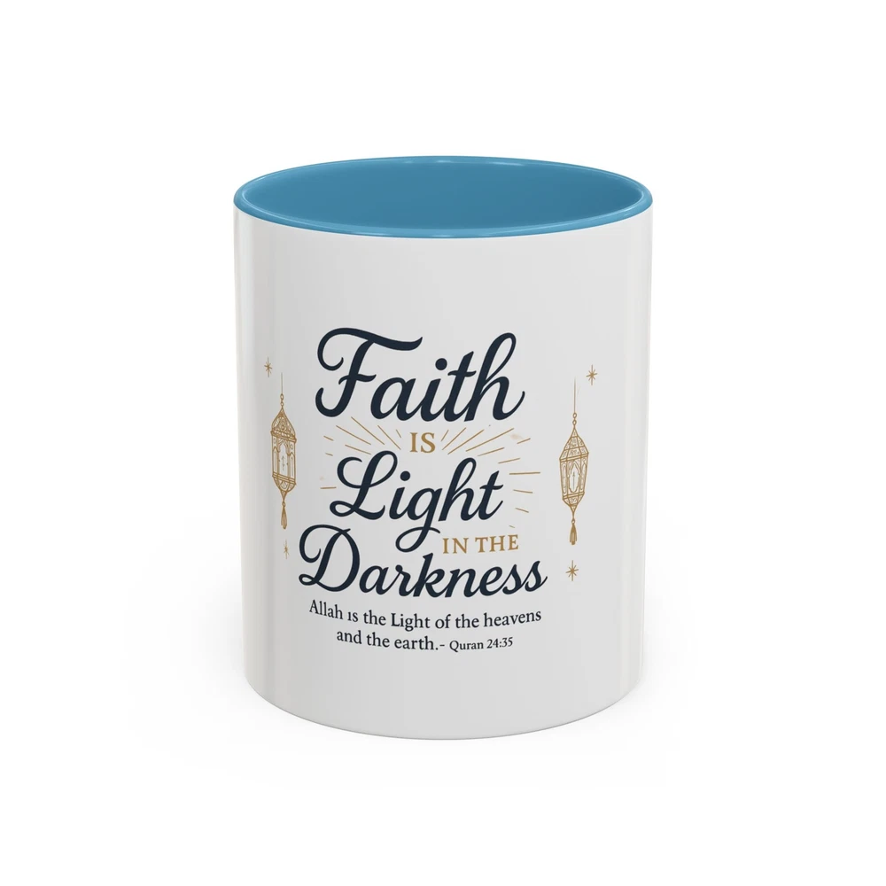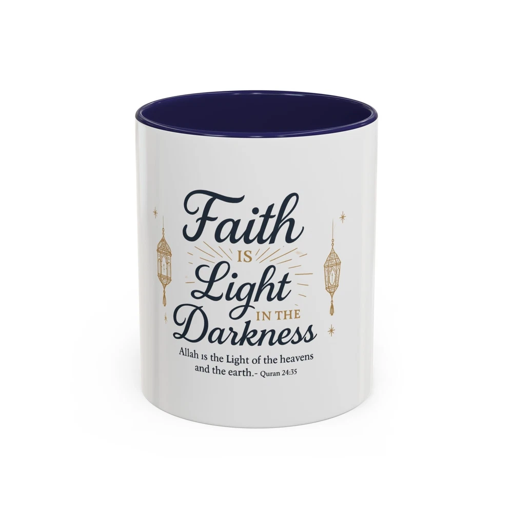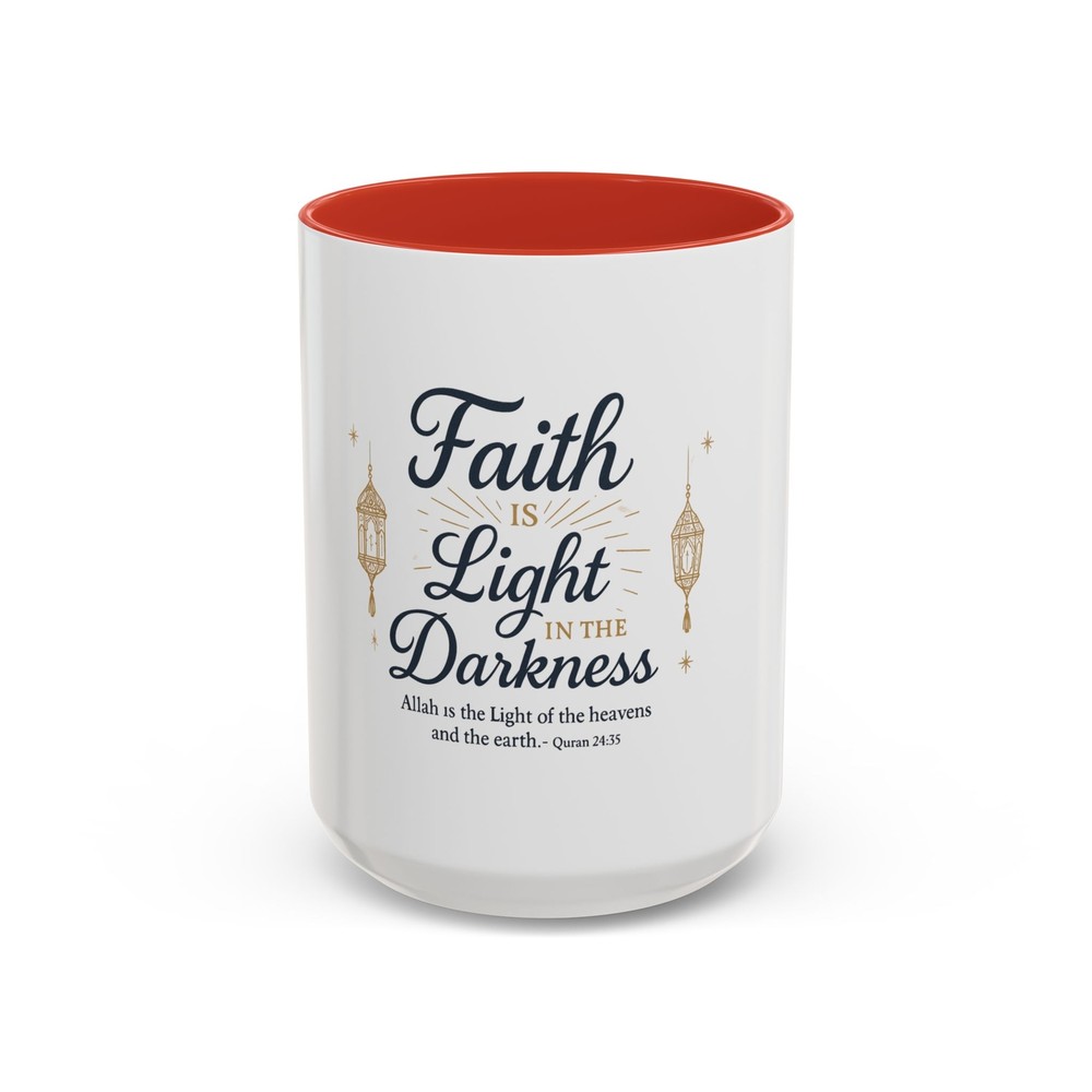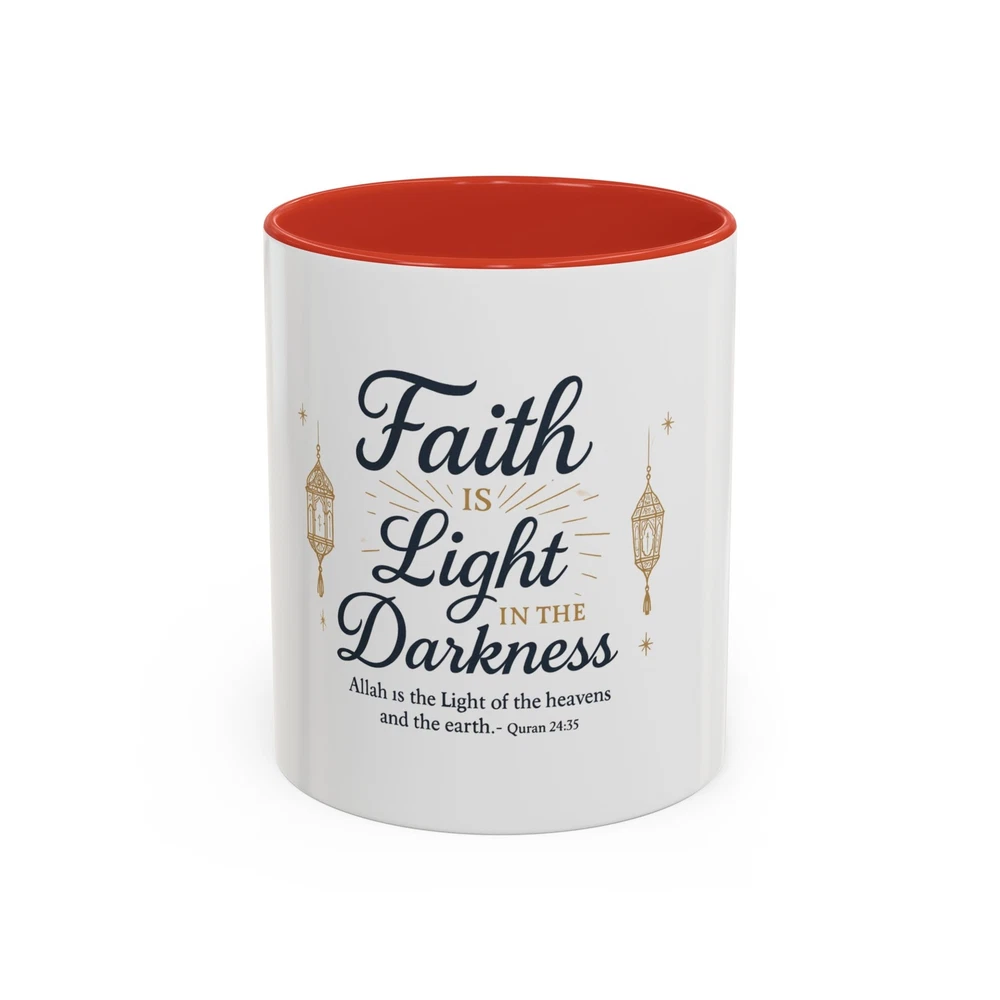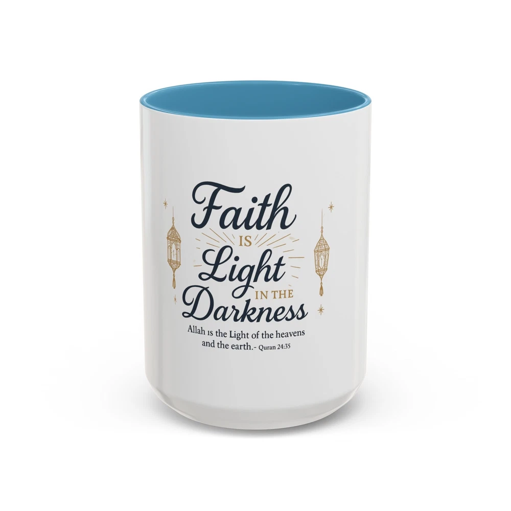 Introducing a vibrant Accent Coffee Mug that adds a splash of personality to your morning routine! Made from durable white ceramic, this mug features a stunning color contrast with a glossy finish that makes even the dullest days feel bright. Ideal for coffee lovers and tea enthusiasts alike, its generous sizes of 11oz and 15oz cater to your caffeine cravings perfectly. The C-shaped handle offers a comfortable grip, ensuring that every sip feels delightful. Whether you’re enjoying a quiet moment at home, sharing laughs with friends, or gifting it to someone special, this mug is perfect for various occasions like birthdays, holidays, or even as a thoughtful 'just because' gift. Celebrate your faith or inspire a loved one during Ramadan, Christmas, or any season of giving with this beautiful piece that reminds us that 'Faith is Light in the Darkness'. Embrace your unique style with this expressive addition to your drinkware collection! Product features - Microwave-safe for easy heating - Dishwasher-safe for effortless cleaning - Vibrant colors with crisp designs - Made from lead and BPA-free ceramic - Available in two sizes for your preference Care instructions - Clean in dishwasher or wash by hand with warm water and dish soap EU representative : HONSON VENTURES LIMITED, 3, Gnaftis House flat 102, Limassol, Mesa Geitonia, 4003, CY Product information : Generic brand, 2 year warranty in EU and Northern Ireland as per Directive 1999/44/EC Care instructions : Clean in dishwasher or wash by hand with warm water and dish soap