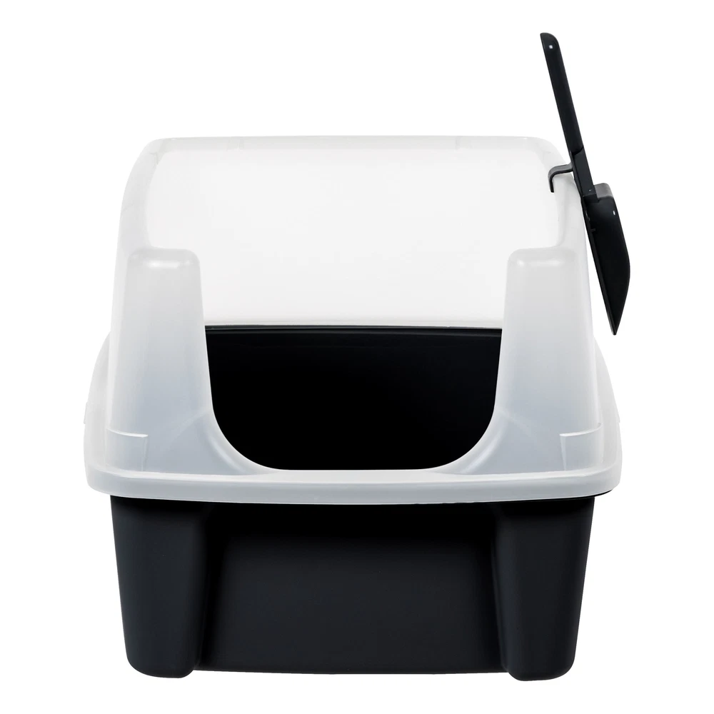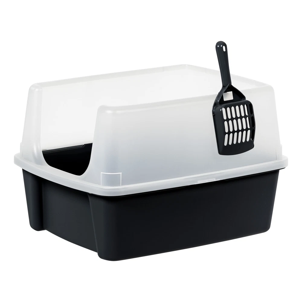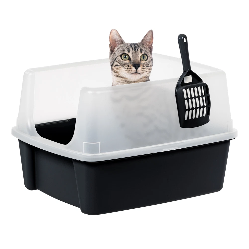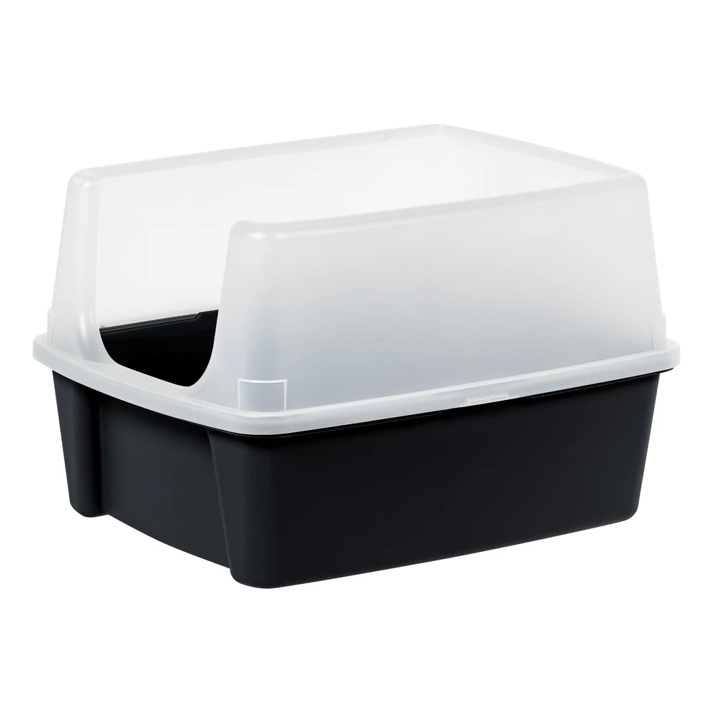 Inspired Essentials Cat Litter Box with Shield and Scoop has extra tall walls on three sides to help contain litter and spray while keeping dirt out. Open top cat litter container provides quick and easy access, while the deep litter pan design gives your cat a semi-private space. The high-polished interior surfaces and included cat litter scoop make the litter box easy to clean. Recessed bottoms and molded-in feet keep the IRIS cat litter box in place and the molded-in rims around the pan add strength and stability to the litter box tray. The cat litter container comes with a matching litter scoop for easy cleaning, and the scoop is designed to fit anywhere in the litter pan. Inspired Essentials, Open-Top Cat Litter Box with Shield and Scoop, is designed to offer cats plenty of room and quick accessibility Inspired Essentials cat litter box includes a matching litter scoop and polished interior for easy cleaning Recessed bottom and molded-in feet allow litter pan to fit neatly in all types of spaces. Cat litter boxes include matching litter scoops and high polished finish for easy cleaning Dimensions: 19.00"L x 15.00"W x 11.75"H Color: Black