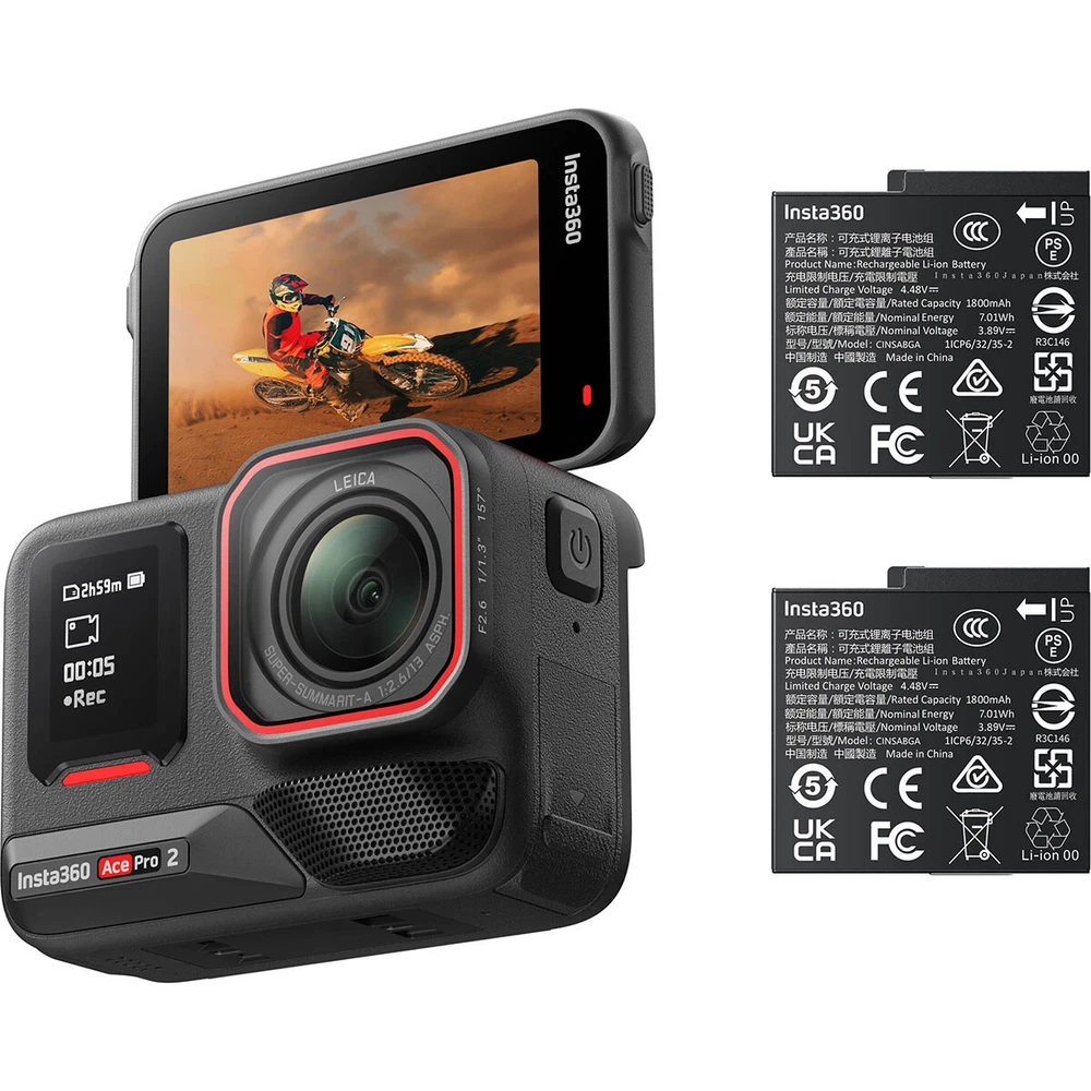 Insta360 Ace Pro 2 8K AI-Powered Action Camera with Dual Battery SKU: INSTACEPRO2 Mfr. Part: CINSBBGA_ACEPRO208 Item Includes Insta360 Ace Pro 2 8K AI-Powered Action Camera - Wind Guard (Pre-Installed) - 2x Battery - Standard Mount - Mic Cap - USB-C Cable - Insta360 1 Year Limited Warranty Description Leica Summarit Lens - Simply The Best Co-engineered with Leica to set a new benchmark for action camera image quality, with a F2.6 aperture that captures more light and reduces noise. New 1/1.3" 8K Sensor - Upgraded Performance, Unlimited Potential Insta360 Ace Pro 2's elite 1/1.3" 8K sensor boasts unparalleled imaging, with 13.5 stops of dynamic range and 2.4microm equivalent pixel size. Now with support for 4K60fps Active HDR and 8K30fps video. Dual AI Chip - Unique Setup For Unreal Image Quality Meet the first action camera with a dedicated imaging chip for noise reduction and image processing, plus a 5nm AI chip for further processing and powerful performance. Delivering 100% more computing power than Insta360 Ace Pro, it's a revolutionary setup with incredible results. Upto 100% Computing Power Upto 100% Low Light Details Superior Image Quality 8K30fps - The Cinematic Special Immerse yourself in breathtaking 8K resolution, capturing every detail with stunning clarity. Even in motion, enjoy smooth, cinematic 30fps video that brings your adventures to life. 4K60fps Pure Video Mode - Low-Light Expert Our advanced dual chip system and sensor deliver stunning low light clarity. This is backed up by PureVideo, a low-light shooting mode that reduces noise while enhancing brightness and details, available in up to 4K60fps. 50MP Photos - Crystal Clear Snaps Picture-perfect, captured with more pixels than ever. Just check out that clarity. Color Your World 4K60fps Active HDR Upgraded to a max of 4K60fps, Active HDR unlocks a powerful dynamic range for your shots, with better light and shadows through any adventure. Leica Color Profiles Shoot like Leica. An exclusive set of Leica color profiles infuse your footage with signature color aesthetics, adding a touch of elegance to every shot. Precise Underwater Colors Our precise underwater color technology ensures vibrant, true-to-life footage, inspiring you to explore the depths like never before. 4K Clarity Zoom - Zoom Without Issue Tap twice on the touchscreen and zoom in 2x without losing any image quality. Need a close-up but can't get there in time? Clarity Zoom has you covered. 4K120fps - Slow It All The Way Down Rock-solid clarity, super high frames. Smoother, clearer action, Insta360 Ace Pro 2 handles whatever you throw at it. Wider Views, Less Distortion 157 Degree Wide-Angle Lens Capture it all and then some. A wider field of view takes POV shots to the next level. Perfect for creating a sense of speed on two wheels! Megaview Less distortion and straighter, cleaner edges. MegaView unlocks a wider FOV, keeping your shot picture-perfect and exactly as you saw it. Ready For Action All-New Wind Guard - Simply Clearer Audio The first action camera with an integrated Wind Guard. With an innovative design, it keeps noise at a minimum during peak moments, ready to snap on and off as you need. Advanced Audio Algorithms - Relive It As You Remember It Refreshed audio algorithms bring clarity to your content, immersing your viewers like nothing else. Rugged & Waterproof - Born To Explore Waterproof To 39ft. Waterproof to 39ft (12m) straight out of the box from an upgraded 33ft (10m), or dive down to 197ft (60m) with the Dive Case. Rugged Design. Solid performance with a sturdy flip screen and removable Lens Guard that can handle the action. Ramp Up The Action Flowstate Stabilization Impossibly smooth videos no matter what with leading image stabilization. 360 Degree Horizon Lock Keep your videos perfectly level with in-camera horizon leveling. Fast Charging & Long-Life Battery - Ready When You Are Power through with a bigger 1800mAh battery and 180 minutes of battery life. Get back out there in no time with PD fast charging, getting your camera to 80% in just 18 minutes and fully charging in 47 minutes. Out all day and your phone's dead? Connect your camera and reverse-charge for those emergency "no power bank" moments. 180 mins Battery Life 18 mins to 80% Weather Resistant - Up For The Challenge Handles tough conditions and extreme temperatures from -4 Degree F to 113 Degree F (-20 Degree C to 45 Degree C) like a champ. Smart Shooting 2.5" Flip Touchscreen - Master The Shot Have more control with the bigger, clearer 2.5" flip touchscreen. More rugged than before, it makes it easier to preview and perfect your shots, even in bright sunlight. 70% Pixel Density 100% Flip Durability Magnetic Mounting - Say Hello To Seamless Easily switch between accessories with the magnetic mounting system. Quickly swap out mounts so you'll never miss the shot. Stats Dashboard - Show Off Your Data GPS Activity Stats Overlay stats from your smartphone in your videos directly through the Insta360 app-no extra gear needed. Third-Party Stats Overlay real-time stats from third-party sports brands and apps, including Garmin, Apple, COROS, and more. Stay on Top of Your Game Bluetooth Headset Compatible Pair your motorcycle helmet headset from Sena, Cardo, and more to get clear dual-track audio and hands-free control on every ride. Dashcam Mode Easily transform your camera into a dashcam. Eliminates storage concerns by automatically saving footage based on the storage space you set, ensuring a confident and safe drive on every journey. Pre-Recording Never miss a moment with up to 120 seconds of footage saved before you even hit record. Be Completely In Control Gesture Control Smarter shooting starts here. Insta360 Ace Pro 2 recognizes gestures for easier, hassle-free shooting. Perfect for groups and loud environments, and it works with gloves and helmets on, too. Voice Control 2.0 Just say the word. The new voice control algorithm makes it easier to control your camera when it'