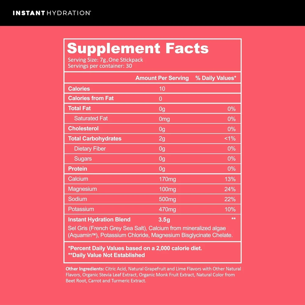 Instant Hydration Electrolytes Powder Packets - Raspberry Electrolyte Drink Mix - Zero Sugar - Keto, Vegan, Gluten-Free, Non-GMO - Boost Recovery, Brain Health, Muscle & Tissue Support- 30 Sticks Description Features: RASPBERRY FLAVOR: Enjoy the vibrant, tangy taste of freshly picked raspberries with every sip. This flavor embodies the essence of a refreshing summer treat – bold, natural, and the perfect hint of sweetness. It's hydration made easy, invigorating you without any artificial ingredients, sugar, or extra calories. Unmatched 1445mg electrolytes per serving for superior hydration and peak performance, far surpassing other brands. Our blend supports optimal cellular hydration, muscle function, and recovery. Perfect for health-conscious individuals and those with specific dietary needs. Supports muscle recovery and reduces fatigue with a potent and balanced mix of sodium, potassium, calcium, and magnesium. Our formula helps you recover and build stronger muscles post-workout. Hand-harvested French Grey salt provides a rich source of 83 trace minerals, enhancing hydration at the cellular level. Our proprietary blend is scientifically backed and lab-tested for safety and efficacy. MORE SALT, MORE SUPPORT: Studies show that high-functioning bodies need higher levels of salt intake. The more you sweat the more you need SALT! This is why we formulated our perfect all-in-one electrolyte drink with sel gris known for its complex, mineral-rich flavor. Product Details: Product Dimensions : 4.17 x 3.35 x 2.83 inches; 7.8 ounces Manufacturer : Instant Hydration Brand: Instant Hydration Flavor: Raspberry Primary Supplement Type: Magnesium Unit Count: 7.9 Ounce Item Form: Powder Item Weight: 7.8 Ounces Item dimensions L x W x H: 4.17 x 3.35 x 2.83 inches Product Benefits: Protects The Ocean, Muscle Recovery, Energy Management, Cellular Hydration Age Range (Description): Adult Number of Items: 1 Handling We will ship all orders within 1 business day of payment. Delivery We Do Not Ship Outside of the Continental US. Return Policy All items qualify for returns within 30 days of receipt. Buyer is responsible for return shipping on any item that is not damaged. Feedback We take our reputation seriously, we buy and sell online, so we understand the value of trust. If you are unsatisfied with your order, please contact us and we will work with you to resolve it to your satisfaction.