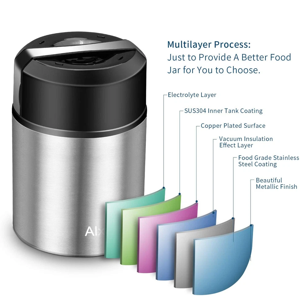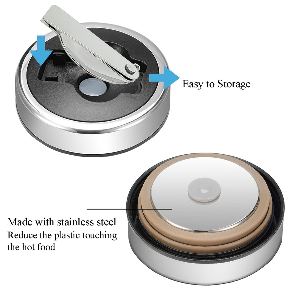 Vacuum Insulated Food Jar for School/ Office/Travel/ Outdoor Activities Why choose our insulated food jar : ✔Every food jar supplied by uses seamless welding technology to effectively improve the insulation effect. ✔The Double wall 304 18/8 stainless steel vacuum insulated technology can effectively eliminate the convection process. ✔Double lids design for enhance insulation & leakproof. Outer lids can be used as a bowl, perfect for kids’ lunch. ✔Big capacity for addressing hunger. The 27 oz big size also enough for 2 small appetite people. ✔With convenient folding spoon & firmly handle. That would be easy to carry & use. ✔The big mouth of the food jar makes you easier to clean, you can easily reach the bottom of the food container. How to use the food jar? 1. For maximum thermal efficiency, you are suggested to preheat(Using hot water)/pre-chill(Using cold water) the food jar before use for about 3 minutes and then empty water. And then you could fill contents to your container. 2. Press the air button before opening the food jar, and be careful the exhausted hot steam. Product Specifications: Size: 4.4inch X 4.4inch X 6.5inch Capacity: 27oz Weight: 0.55kg/1.2lb Material: PP、 food grade silicone、food grade 304 stainless steel All of the parts are food grade material, BPA Free, no PVC. please feel relieved about usage. Package Contents: Insulation Body X 1 Folding Spoon X 1 Inner Lid X 1 Outer Lid X 1 User Manual X 1 Vacuum Insulated & Seamless Welding Technology: Double wall vacuum insulation technology and seamless welding technology for maximum temperature retention keep food hot for more than 6 hours or keep food cold for 24 hours. Portable & Convenient Food Jar: The outer lid with a telescopic handle is very convenient for people to take it out to travel, picnic, work or school. Moreover, the outer lid is made of food grade pp material, it can also place food. 3.4 INCH Wide Mouth & Sturdy Folding Spoon: The wide mouth design with spoon of the food jar make you easy to fill and eat and quick cleaning. Meanwhile, it has 27 oz big capacity, no worry for hungry. Leak Proof Design: We only choose high quality stainless steel inner lid and silicone sealing ring, so that the food container would improve insulation effect and prevent spilling accidents. The stainless steel inner lid bring better insulation. High Quality : The Insulated food jar is made of premium quality 304 stainless steel (BPA Free, Non-Toxic, No PVC).This food jar has full size folding stainless steel spoon that you can use on any occasion. We promise service, please do not hesitate to contact us for help.