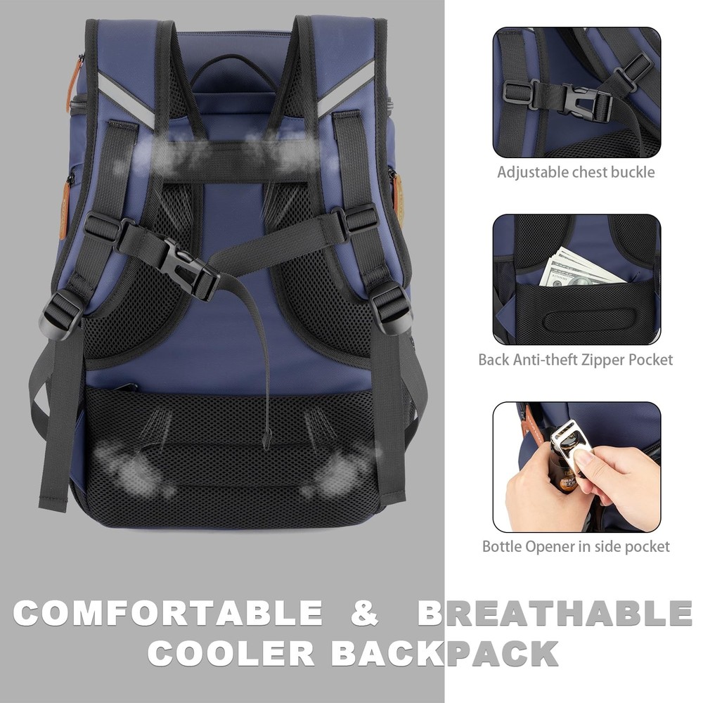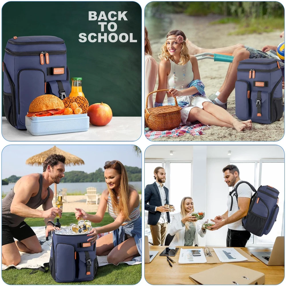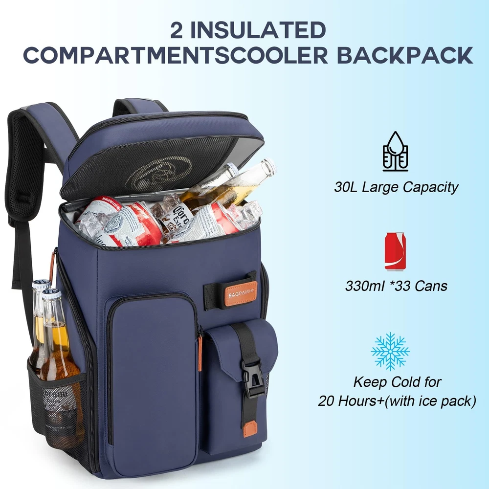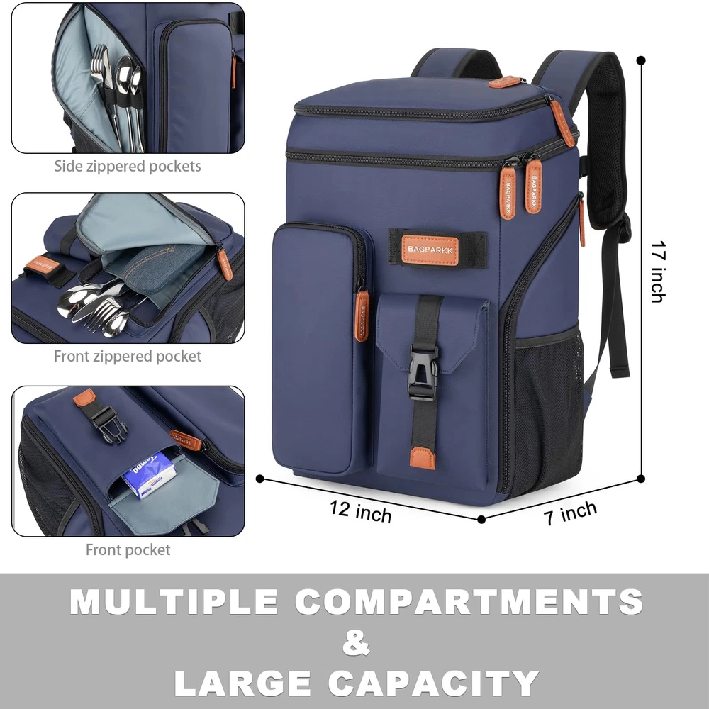 Insulated Cooler Backpack,33 Cans Multifunctional Double Deck 33Can, Blue Description Features: Insulated Cooler Backpack: Bagparkk backpack cooler is insulated with thickened 8mm foam, together with advanced silver PEVA seal for blocking UV rays to keep beverages and foods cool up to 20h,We recommend storing hot and cold and separately for better results Leak-proof & Water Resistant: Our cooler backpack liner adopts high-tech seamless hot pressing process for leak-proof. The zipper is not leakproof, please be careful not to tip over when using it.High-density Scratch-resistant nylon material & Waterproof PVC Fabric can effectively resist external moisture and wear, protect the safety and dryness of the items inside the pack Large Capacity & Multiple Compartments: Featured 2 insulated compartments for cooling drinks & dry foods,Main bag can hold up to 33 cans(330ml). 1 top zipper pocket, 2 front pocket and 4 side pockets to hold your snacks and other accessories.Beach backpack also hidden pockets on the back for your mobile phone and valuables.There is one bottle opener included for more convenience Sternum Strap & Ergonomic Design: Thicker padded back with ergonomic breathable design paired with adjustable,breathable and padded S shoulder straps help to reduce fatigue during a long day of trip. The adjustable chest buckle works perfectly to distribute the pack’s weight and keep it steady and centered,Reflective strips on the straps reduce the risk of traveling at night,perfect for lunch, picnic, work, travel, hiking, biking, park, beach and zoo Stylish Appearance and Ideal Gift: Our Convertible insulated backpack can use it as a travel backpack,Arrive in style—back trolley sleeve for easily sliding over your luggage/suitcase handles, dual padded shoulder straps provide optimum comfort. With this fashionable back pack cooler, you will get a lot of compliments.It's a great gift idea for men & women Product Details: Handling We will ship all orders within 1 business day of payment. Delivery We Do Not Ship Outside of the Continental US. Return Policy All items qualify for returns within 30 days of receipt. Buyer is responsible for return shipping on any item that is not damaged. Feedback We take our reputation seriously, we buy and sell online, so we understand the value of trust. If you are unsatisfied with your order, please contact us and we will work with you to resolve it to your satisfaction.