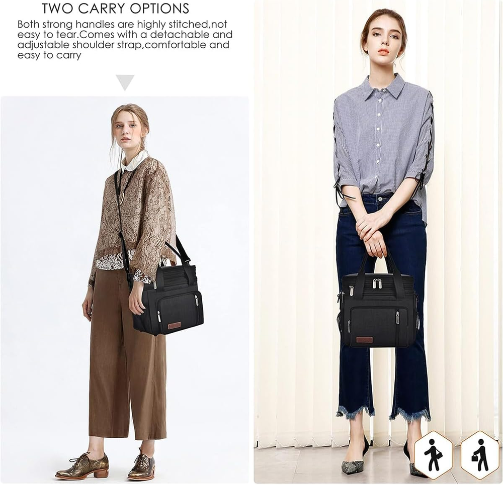 Large-Capacity Double-Layer Lunch Bag: It measures 10.1" x 7.7" x 9.1". Expanded size: 10.1" x 7.7" x 10.3". Different foods can be placed on the upper and lower layers to prevent food from being piled up and squeezed. The large-capacity lunch bag can easily hold all your beer, snacks, drinks, sandwiches, fruits, lunch boxes Multi-Functional: You can take it to picnics on weekends, take lunch and snacks to the office, take cold beer to the beaches,and it can also be used as a casual tote bag. Suitable for both men, women Leak-Proof & Insulation: Thickened PEVA liner without splicing to prevent leakage. The inner liner is made of thermal insulation material, which can keep the food warm or cold, and can also place ice cubes Easy Clean: PEVA liner is smooth and easy to wipe clean. You can put the used tableware in without worrying about cleaning Long-Term Storage: Ice cubes can be placed in the bag to maintain the temperature and freshness of food and beverages for at least 7 hours Product Description