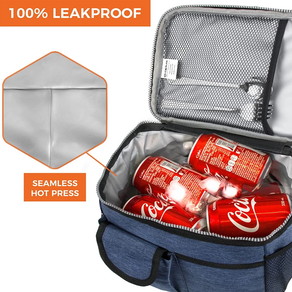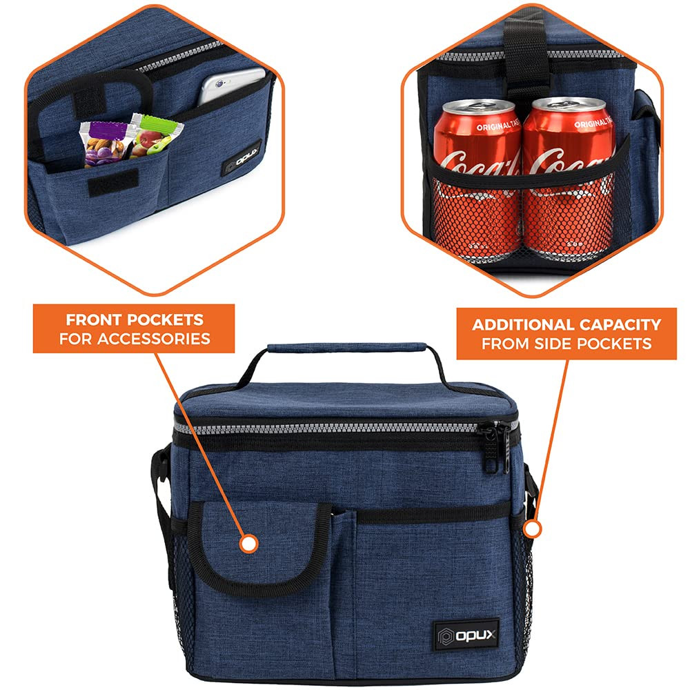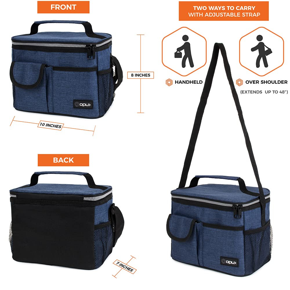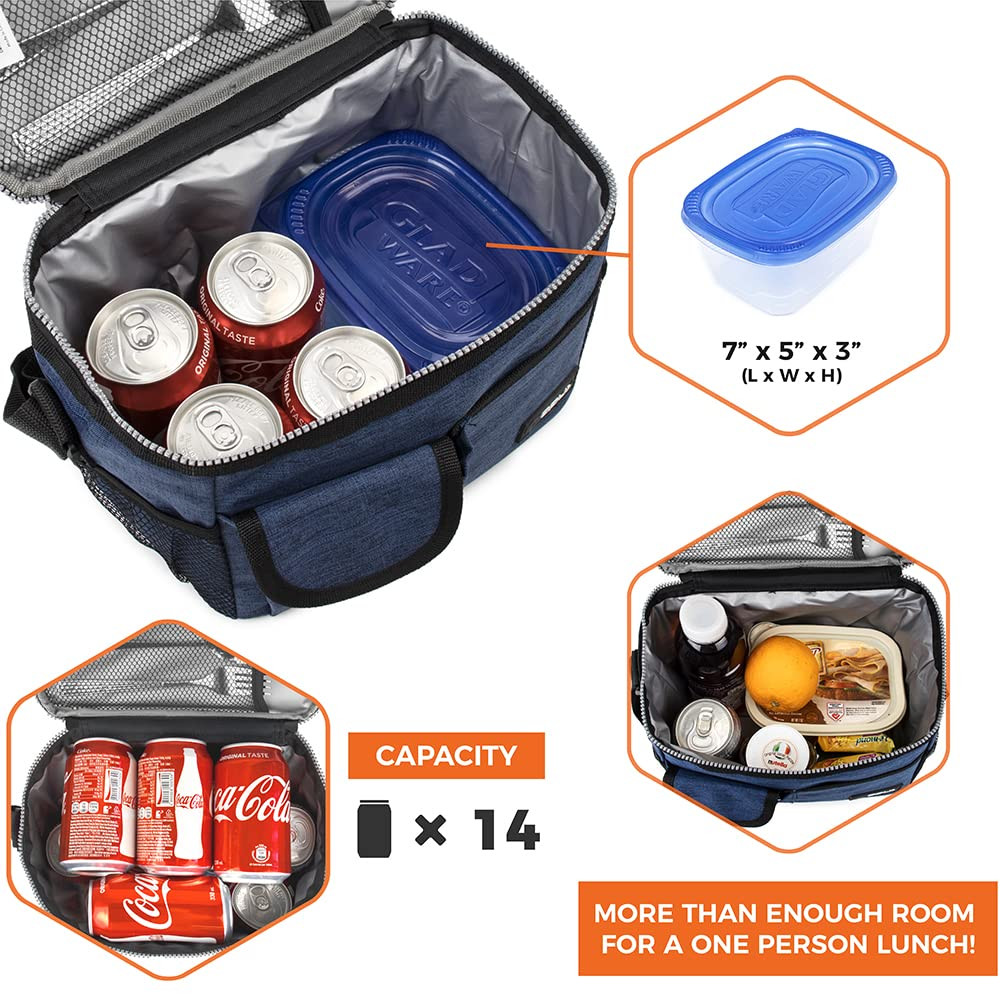 INSULATED LUNCH BOX FOR WORK: This medium lunch cooler bag measured as 10 x 7 x 7.75 inch, holding up to 14 cans of soda or 8L of food. lunchbox fits large meals, meal preps, bento boxes, making this leakproof insulated lunch box a lunch supply essentials for adults, men, women, , teens, boys, and girls. LEAKPROOF LUNCH BAG: The mens lunch bag for work features a food-PEVA lining that is leakproof and easy to clean. The thick thermal foam insulation ensures your food stays hot or cold for hours. Stay organized with our portable cooler bag that keeps meals fresh and containers secure. This soft cooler lunch box is great for taking to school, office, work, and gym. MULTI-POCKET & PORTABLE: Our lunch bag for working women men features an adjustable shoulder strap that allows you to carry it comfortably to school, office, or picnic. The lunch cooler, lunchbox for adults includes side mesh bottle holders and front pocket to utensils, napkins, and lunch essentials. The dual zippers ensure easy opening and closing of the lunch pail. EASY TO CARE & DURABLE: Our lunchbag is crafted from heavy duty 600D Oxford polyester that prevents rips and tears, ensuring long-lasting durability. Whether you're an adult or student, our reusable lunch bag lunchbox can handle it all. Simply wipe it with a damp cloth to keep it clean and fresh. Thick soft material protects your food during travel.. NAVY LUNCH BAG FOR ALL: Our navy lunch box is perfect for carrying meals to work, school, hiking, and picnics. The insulated cooler bag is leakproof with vibrant color options, making our cooler lunch bag ideal for adults, men, women, , teens, boys, and girls. Passed CPSIA Lead, CSPA Phthalates & Cadmium Test - Manufacturer recommended age: Ages 3+.