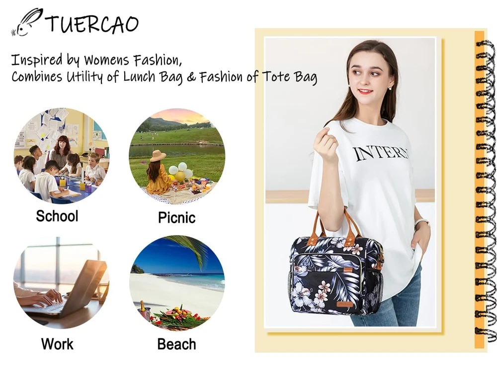 MULTIPLE POCKETS: TuErcao insulated lunch bag: 1, Features one main zippered compartment to keep your food and fruits warm or fresh. 2, The front zipper pocket great for your headphones, data cable. 3, The velcro pocket suitable for holding cutlery or your snacks. 4, The back privacy zippered pocket is for your necessities like keys, credit cards, and small change. 5, Two mesh pockets are for drinks, beer, cola, water bottles, shoulder strap or tissues LEAKPROOF & THERMAL INSULATED: TuErcao reusable lunch bags are equipped with waterproof ethylene vinyl acetate lining, which is soft, leakproof, and easy to clean. Padded with 6mm EPE foam and 900d polyester & composite tarpaulin outer fabric will keep your food fresh or warm when you're on the go DIMENSIONS & CAPACITY: TuErcao lunch bag dimensions are 10.25" x 6.3" x 10.5" (L x W x H). The main compartment has large capacity and can fit 16 cans 330ml colas. It can hold all of your food like sandwiches, salad, snacks, drinks, and fruits for the entire day PORTABLE & CONVENIENCE: TuErcao insulated lunch box features one reinforced handle on top for carrying as a handbag or tote bag. And comes with a detachable & adjustable shoulder strap which can be adjusted from 15" to 27" for carrying as a shoulder bag or crossbody bag DURABLE MATERIALS: Premium reinforced metal dual zippers, secure zipper closure, and sturdy buckle ensure smooth open and maximum durability. Our Insulated lunch box follows a strict set of specifications and quality standards WIDE USAGE: This lunch bag can use as a cooler bag, small ice chest, tote bag, work bag, travel bag, picnic bag, beach bag, sundry bag, food delivery bag, reusable grocery bags, reusable shopping bags. This insulated lunch tote is perfect for a family time, house warming, birthday party, picnic and more
