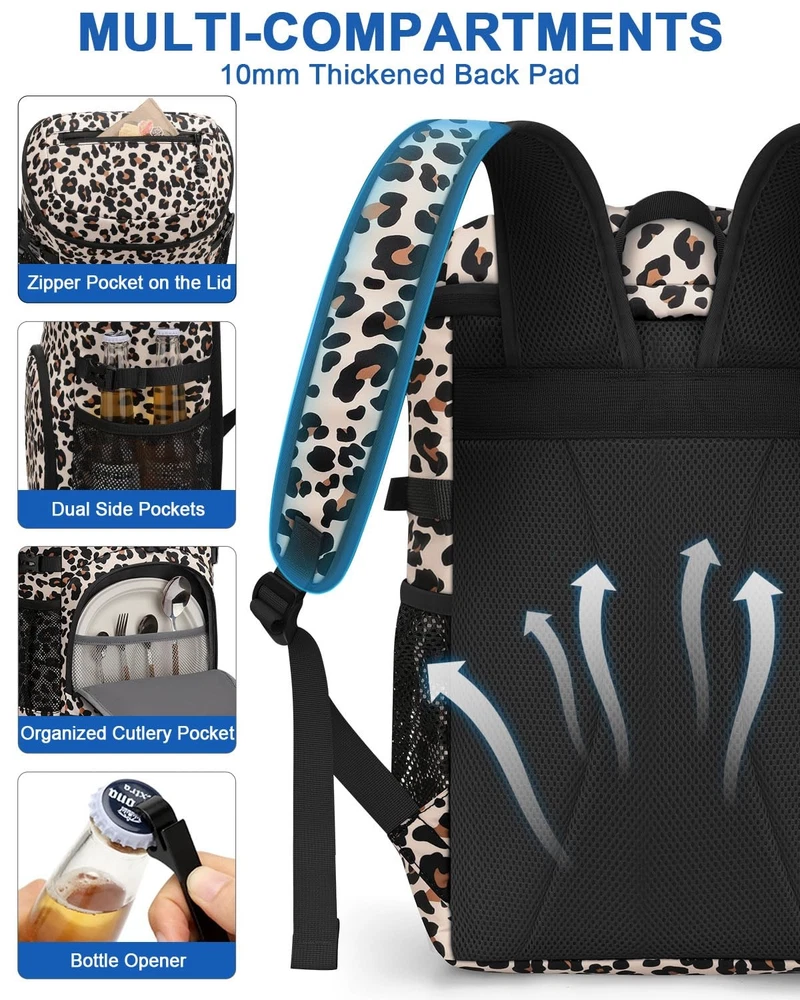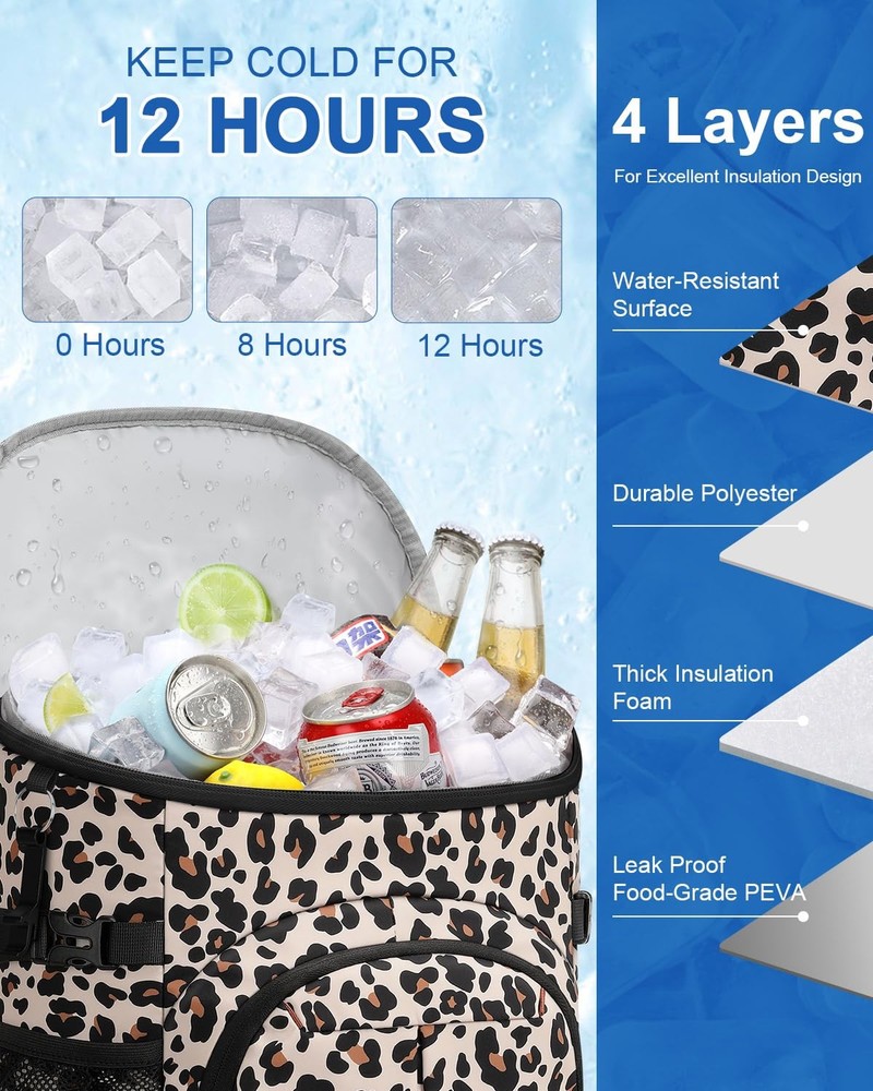insulated cooler backpack keeps food and drinks hot or cold for up to 16 hours. Featuring a leakproof, food-grade liner and multiple compartments for easy organization, it's perfect for lunch, hiking, camping, fishing, or travel. Lightweight, comfortable, and designed for both men and women. Weight: 1.32 lbs Material: Upgrade Insulated & Leak-proof & Waterproof Cooler Backpack Size: 12.6 x 8.9 x 3.3 inch Color: Black/Khaki/Gray/Blue/Cow Print/Leopard/Pink Upgraded Insulation Technology: Our backpack cooler features multi-layered, high-density foam insulation and a food-grade PEVA lining that work together to maintain the temperature of your food and drinks for up to 16 hours. Whether you're packing hot lunches or cold beverages, backpack coolers insulated leak proof performs in all conditions. Enjoy fresh, safe meals and perfectly chilled drinks no matter how long you're out Leakproof Cooler Backpack: Engineered with a durable EPVA liner and seamless hot-pressing construction, this cooler provides 100% leakproof protection. Cooler backpack insulated waterproof prevents liquids from seeping through, even when carrying ice or sauces. Plus, the interior wipes clean in seconds. Keeps your gear dry and eliminates cleanup hassles—so you can focus on fun, not messes Spacious Multi-Compartment Cooler Bag: Features a generously sized main compartment for storing meals and fresh ingredients, a top zipper pocket for keeping dry snacks secure, front utility pockets with elastic cords for utensils or small tools, and 2 mesh side pockets for quick-grab items like water bottles or umbrellas. Ensures your essentials stay neatly organized and within reach with our insulated backpack cooler—eliminating clutter and saving time Ergonomic Comfort for All-Day Wear: Our ice chest backpack ergonomically designed with thick, breathable back padding and wide, adjustable shoulder straps that are cushioned for added comfort and airflow. Even when fully loaded, weight is evenly distributed to reduce pressure. Our backpack coolers offer unmatched comfort for all-day carrying—say goodbye to sore shoulders and sweaty backs Multi-Purpose Insulated Cooler Backpack : More than just a coolers, our lunch backpack is designed for versatility across all your activities—whether hiking rugged trails, lounging at the beach, fishing by the lake, or camping on weekends. Its durable, leakproof construction and thoughtfully organized compartments keep your food and drinks fresh, hot, or cold for hours. Experience unmatched convenience and peace of mind, making every outing more enjoyable and hassle-free.