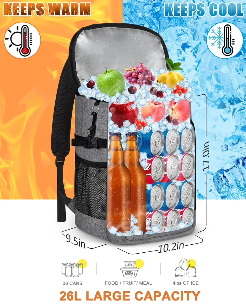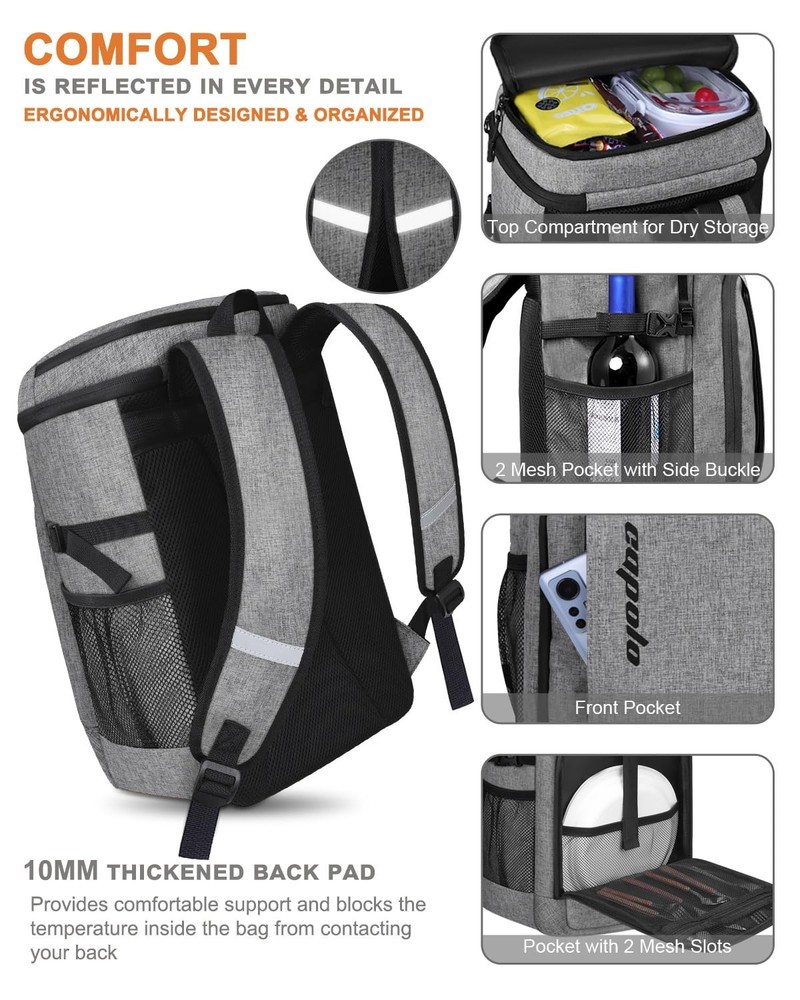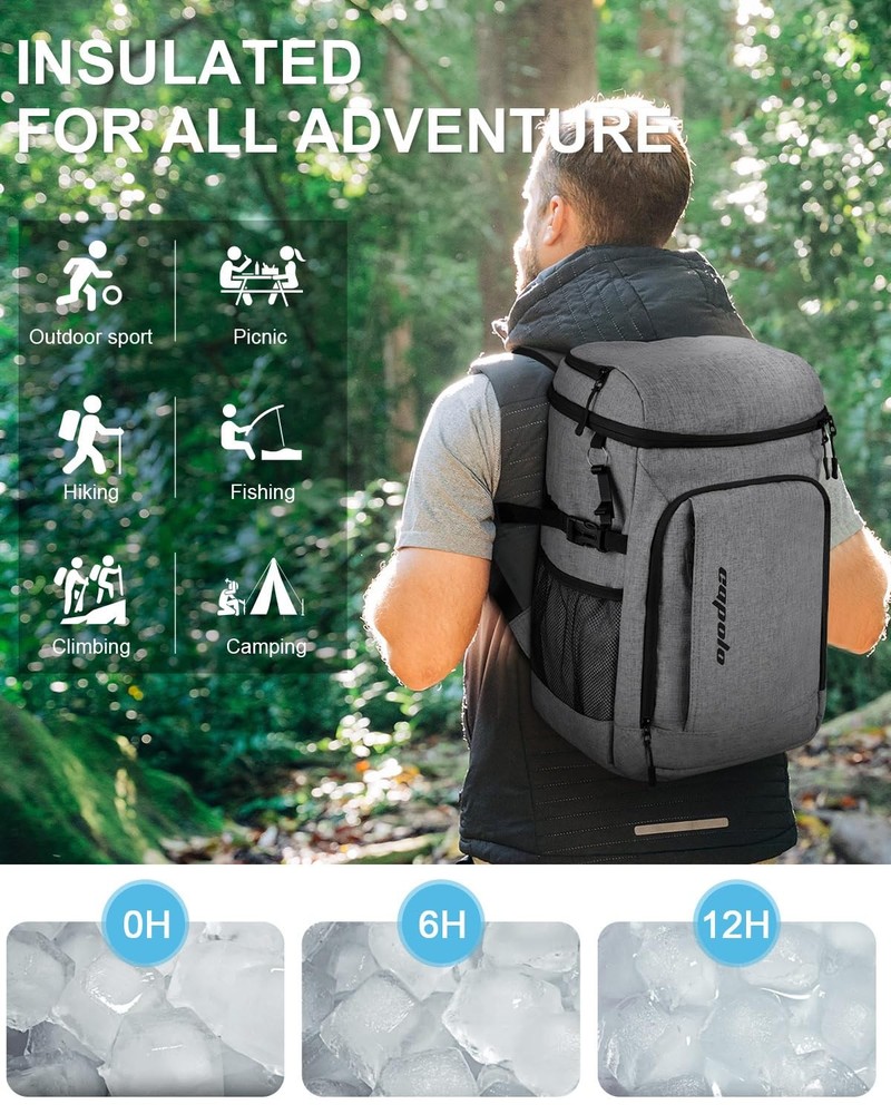 Cooler Backpack Insulated Waterproof for Women Men,36/45 Cans Backpack Coolers Insulated leak Proof Thermal Bag Soft Travel Cooler Bag Portable Ice Chest Picnic lunch Backpack for Camping Hiking Beach Upgrade Insulated & Leak-proof & Sweat-Free Material:Upgrade 4 layers(others 3) of material to effectively lock temperature.The inner layer uses a silver PEVA seal and adopts a seamless hot pressing process for leak-proof .210D waterproof wear-resistant lining lowers the risk of tearing or coming apart. Thickened 8mm (others 5mm) foam Insulation helps to prevent heat transfer. Waterproof nylon outer adds abrasion protection.(The zipper isn't leakproof, kindly take care to avoid tipping over) 36 Cans Large Capacity & 4 Compartments:soft cooler with 4 compartments offers convenient organization options, and helps you keep your item neat and organized, eliminating the need to search the entire bag.36 Cans Main Compartment, perfect for keeping your food and drinks chilled on the go. The top compartment offers a separate dry storage space, ideal for snacks or personal items. Plus, 2 additional pockets with 2 mesh slots for utensils, napkins, or any small travel essentials. Lightweight & Ergonomic Design:Tailored with adjustable shoulder straps and thickened 10mm back foam(others 8MM), it offers personalized support, ensuring your load is evenly distributed for maximum comfort during any adventure. The generous foam thickness acts as a barrier, blocking cold air from contacting your back and enhancing your comfort even further. Bid farewell to cumbersome traditional soft coolers, upgrade your journey experience today, and invest in a cooler bag! Experience Unmatched Convenience and Detail:beach cooler bag stands out with its meticulously crafted details. Adjustable side buckle designed to hold tall bottles adjusts for optimal bag shape retention and serves as a makeshift handle for easy two-person carry. We provide an opener ensuring you can enjoy your favorite beverages hassle-free anytime. Reflective strips on the shoulder straps increase visibility during low-light conditions, ensuring your adventures are safe at any hour. Water-resistant Outer:Water-resistant Outer to protect your items from raindrops, sweat, and moisture, Be well suited as a backpack lunchbox, travel cooler, camping cooler, insulated backpack, etc.
