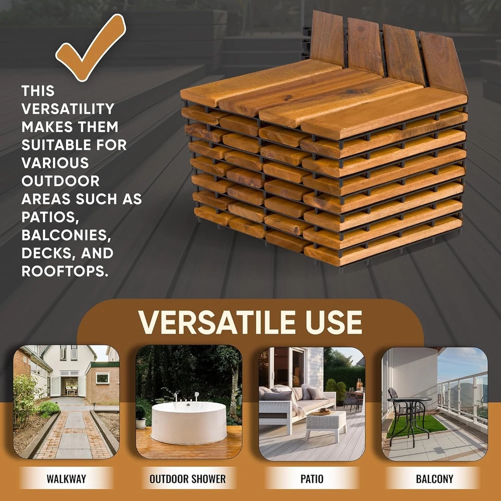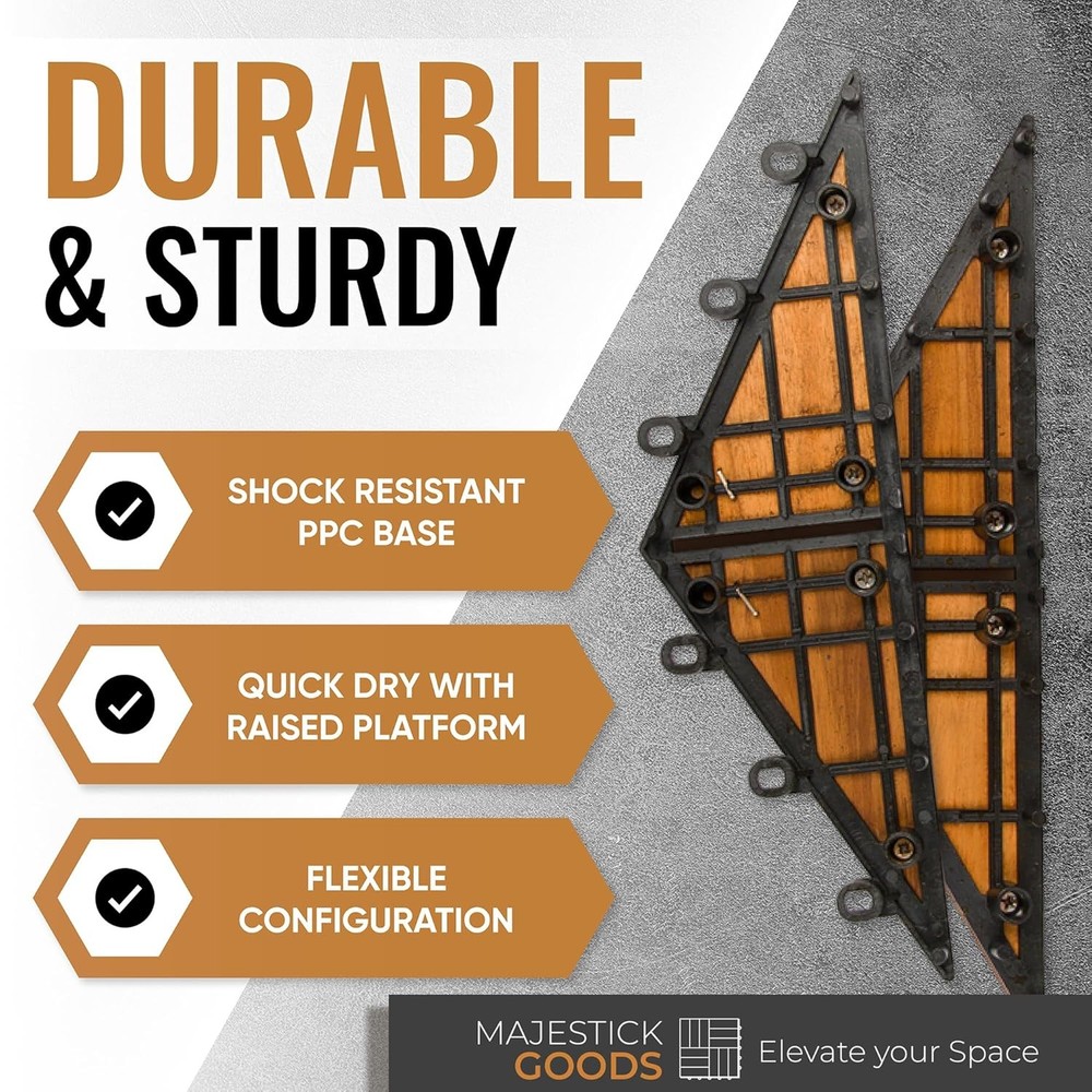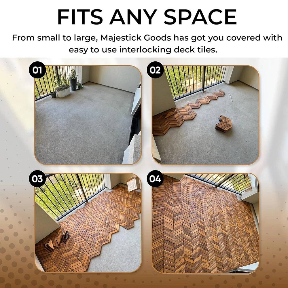 Interlocking Deck Tiles 12" x 8" Herringbone 6 Sq 12" x 8", Brown Product Details Package Dimensions : 12.91 x 12.83 x 6.57 inches; 1 Pounds Manufacturer : Majestick Goods Material: Acacia Wood Brand: Majestick Goods Color: Brown Shape: Herringbone Item Thickness: 0.9 Inches EASY INSTALLATION WITH INTERLOCKING DESIGN: Our herringbone interlocking deck tiles provide a simple yet sophisticated solution for your outdoor space, featuring a snap-together system that's perfect for patio deck tiles renovation projects. No tools, no fuss – just a beautiful patio flooring upgrade that's ready in no time. WATER-RESISTANT AND SLIP-RESISTANT: Create a safe and stylish area with our outdoor interlocking all weather patio tiles that are not only water-resistant but also slip-resistant. These balcony flooring solutions offer peace of mind, ensuring your outdoor oasis is both safe and stunning, even during wet conditions. VERSATILE AND MULTI-USE: Our herringbone wood deck tiles are the quintessence of versatility, suitable as outdoor floor tiles for patios, decking tiles for gardens, or even as a durable balcony floor covering. The timeless look of our patio deck seamlessly complements any outdoor decor, making it the ideal choice for outdoor floor enhancement. ECO-FRIENDLY COMPOSITE OPTION: For the environmentally conscious, our composite deck tiles offer an eco-friendly alternative without sacrificing quality or aesthetics. Enjoy the look and feel of wood with our outdoor interlocking tiles that are crafted to be kinder to the planet while providing the perfect finish to your patio floor. MEASUREMENTS: Each tile is roughly 9" length x 12" width and 0.9" height/thickness. This 8 pack box contains 8 tiles and covers 6.33 square feet.