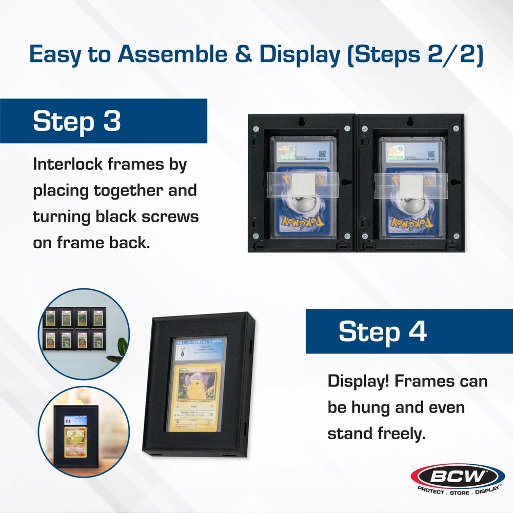 CUSTOMIZABLE: The interlocking technology allows you to attach them to each other vertically and/or horizontally to create your own case - or use as individual frames - or both! The user-friendly design makes it easy to switch it up whenever you want SHOW OFF YOUR FAVORITE CARDS: The interlocking card frames are designed to showcase your sports cards, gaming cards, and collectible trading cards, offering a polished and elegant presentation. The sleek black frame matches any space, making it perfect for offices, man caves, game-rooms and more. SPORTS, GAMING AND COLLECTIBLE CARDS: Showcase a wide range of collectible cards, including baseball cards, football cards, basketball cards, hockey cards, soccer cards, Magic the Gathering (MTG) cards, Pokemon cards, Yugioh cards and more. The frame allows for horizontal or vertical use and offers design flexibility to suit your preferences.