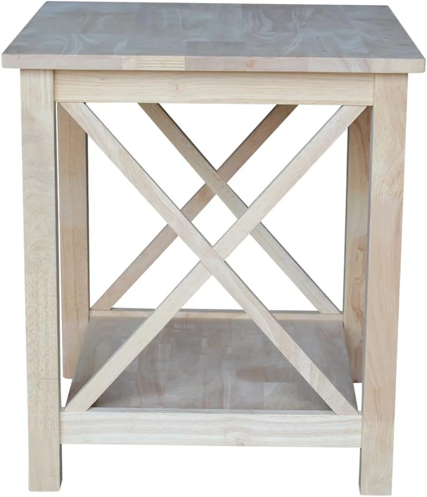 International Concepts Hampton End Table, Unfinished Product Details Brand: IC INTERNATIONAL CONCEPTS Product Dimensions: 22"D x 22"W x 25"H Maximum Weight Recommendation: 200 Pounds Color: Unfinished Product Care Instructions: Wipe with Dry Cloth Item WeightFrame Material: 31 PoundsWood Top Material TypeShape: Rubber WoodSquare Made from solid parawood One Shelf Decorative X design Assembly required Unfinished This practical, beautiful table from International Concepts is the perfect accent piece to your family room, living room, bedroom or entryway. This solid wood table is part of a high-quality collection of wood furniture that will easily complement any décor. Parawood – a hardwood known for its durable, strong, and environmentally friendly nature – is used to craft these traditional, unique tables. Whether you are creating a casual or elegant look and feel in your home, the occasional table from International Concepts will be a perfect match.