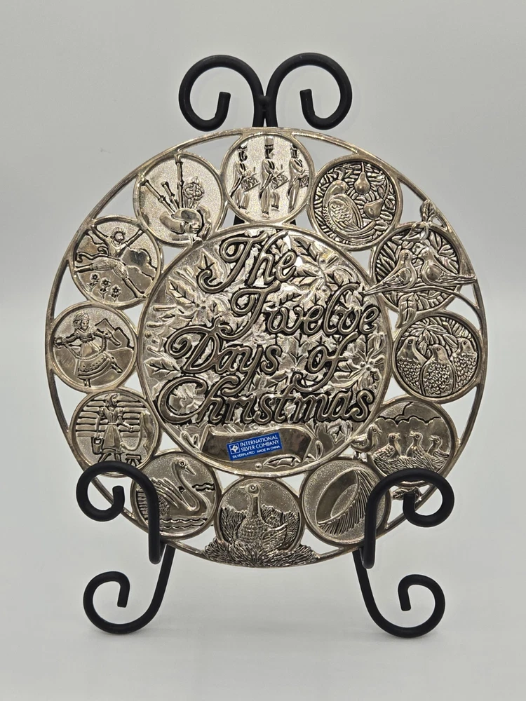 This International Silver Company trivet features a 12 Days of Christmas design in silverplate metal, perfect for holiday decor or serving. Made in 1995, this collectible piece adds a festive touch to any Christmas celebration. The trivet is a functional and decorative item that commemorates the classic holiday song in a timeless silver finish by the international Silver Co.
