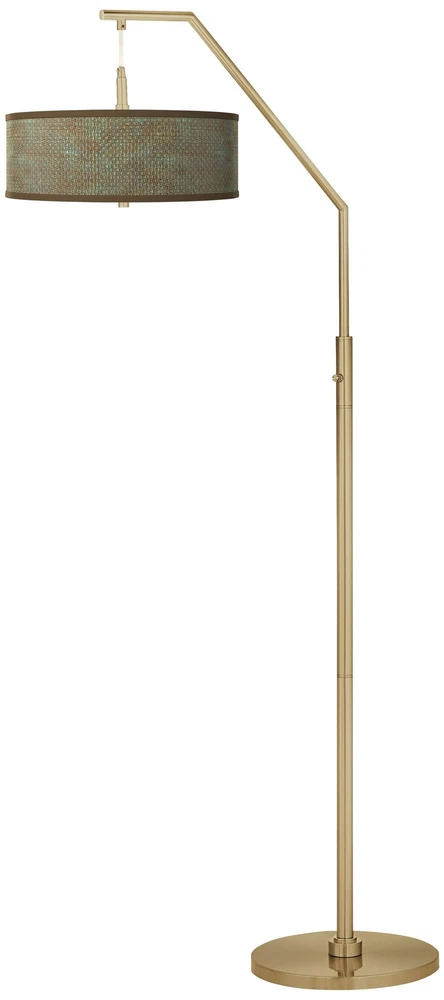 Shop Sale > Chandeliers Ceiling Lights Lamps Wall Lights Outdoor Lights Fountains Ceiling Fans Furniture Decor Interweave Patina Giclee Warm Gold Arc Floor Lamp Style #350G8 PRODUCT DETAILS: 71 1/2" high overall. Base is 14" wide. Shade is 16" across the top x 16" across the bottom x 5 1/2" high. Weighs 23 lbs. Uses two maximum 100 watt standard-medium base light bulbs (not included). 4-position stem column switch. Switch positions: Right bulb on, left bulb on, both on, both off. Contemporary arc floor lamp from the Giclee Glow brand. Translucent Interweave Patina shade. Shade has the exclusive pattern and is custom made to order. Shade printing process U.S. Patent # 7,347,593. Warm gold finish. Metal construction. 8-foot long cord. DESCRIPTION: Add style with this contemporary arc floor lamp design. It features a warm gold finish and a shade with a bottom diffuser to prevent glare. The shade shows off an exclusive Interweave Patina shade pattern and is giclee printed and made to order. Stem switch allows for two different lighting levels for ultimate convenience. Shade printing process U.S. Patent # 7,347,593. *Free Shipping applies only to orders shipping to the 48 continental United States that qualify and meet the minimum purchase requirement; standard shipping only and select products excluded, including freight and oversized items. Free Returns valid on select items in United States only; does not apply to freight, clearance, Daily Sale, designs with giclee art shades, Color Plus and Tiffany Color Plus brand items, or certain items with designer shades.