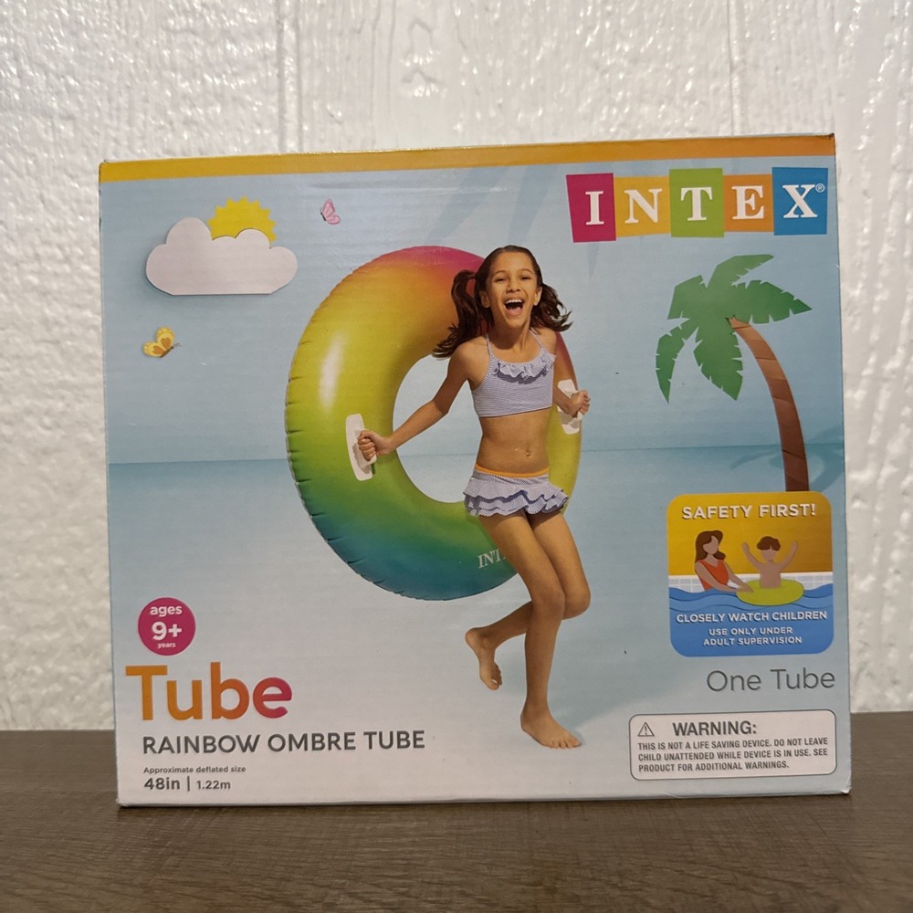 The Intex Color Whirl Rainbow Ombre Swimming Pool Float Tube is a vibrant and fun inflatable ride on designed for ages 9 and up. This multicolor ring-shaped float features a handle for easy maneuvering in the pool. With a recommended age range of 9 to 16 years and 17 years & up, this float tube is perfect for older kids to enjoy a day of splashing and relaxing in the water. Made by trusted brand Intex, this pool float is sure to provide hours of entertainment for teenagers and adults alike. Approximately 48 inches diameter.