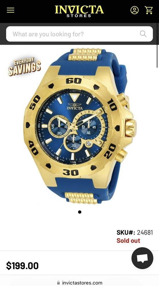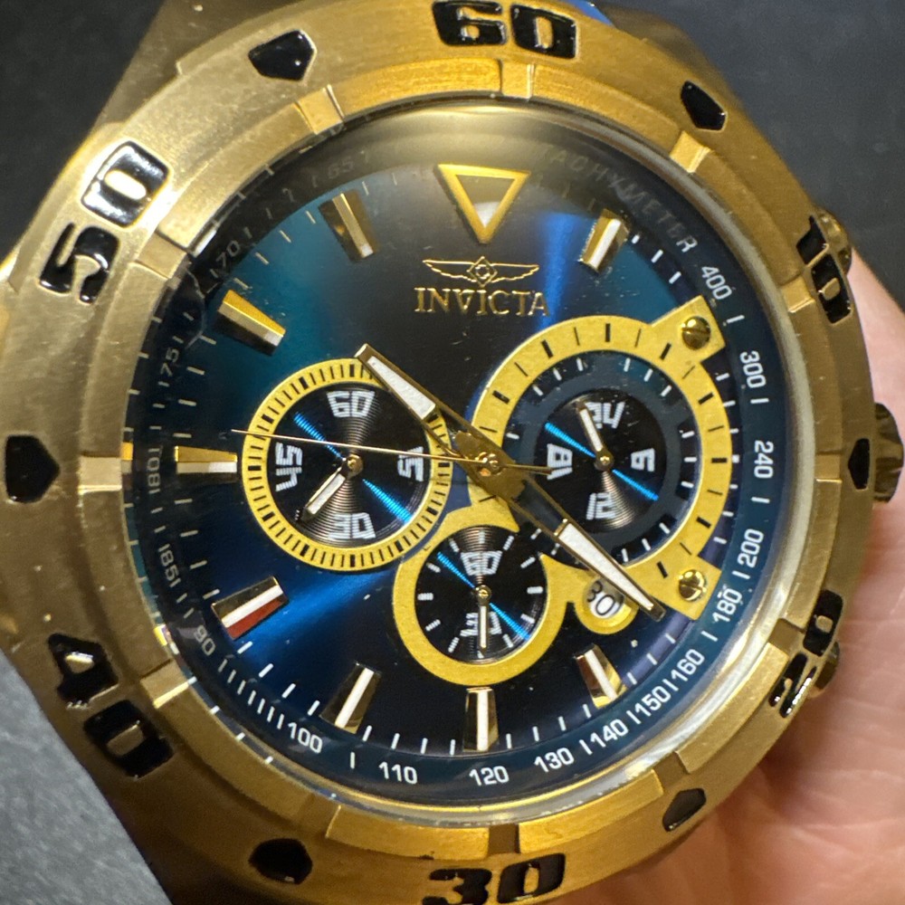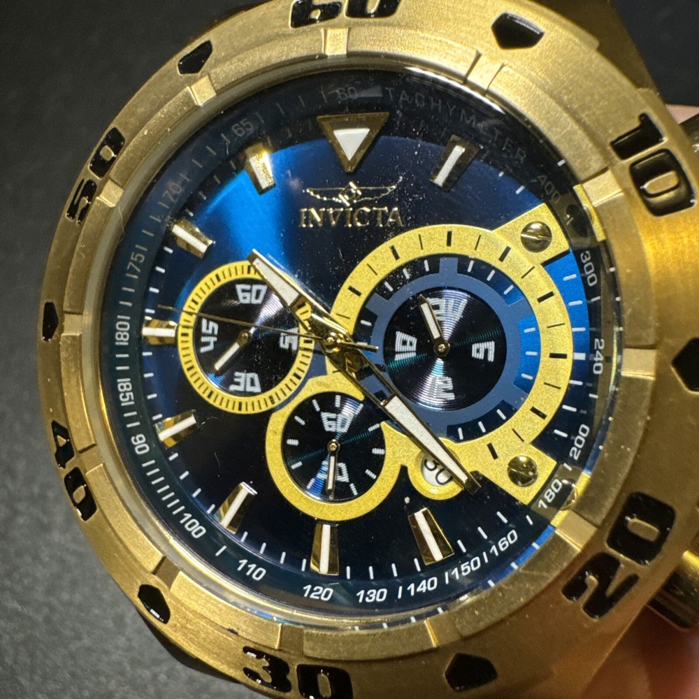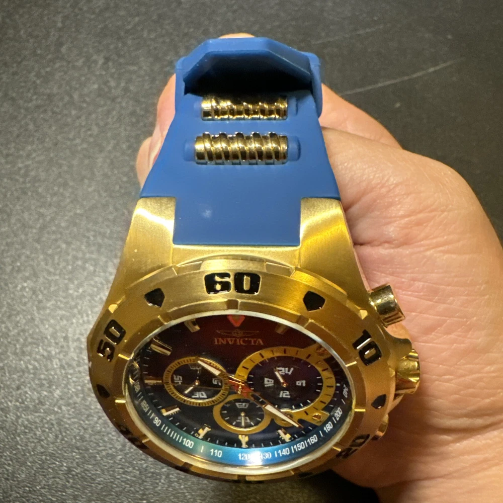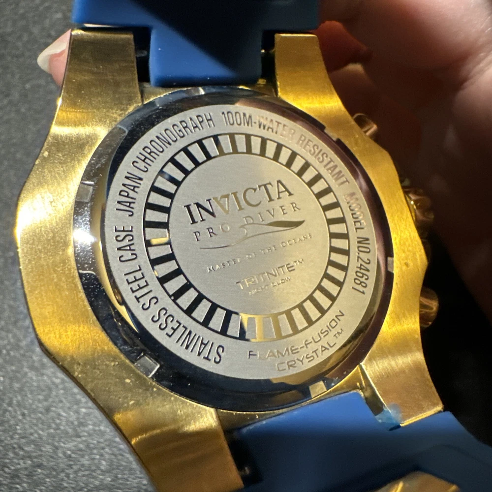 Introducing the Invicta Pro Diver 24681, a stunning men's wristwatch with a 52mm yellow gold-plated stainless steel case and a blue polyurethane band. This watch features a fixed blue bezel, a blue dial with minute, second, hour, date, chronograph, and tachymeter functions, and a solid caseback. With a water resistance of 100 meters/330 feet, this watch is perfect for professional divers and anyone who loves the ocean. The Invicta Pro Diver 24681 is a quartz movement watch that is suitable for left-handed men and has a tang clasp. This watch is an excellent addition to any collection and is sure to impress. Personal used condition in collection. Not currently running. NEEDS NEW BATTERIES! Bought couple years back and it's been in storage. No box. Just the watch itself with the band. Very good pristine condition. Currently sold out at retail value on official site: $199.00 very rare to find. offers welcome.