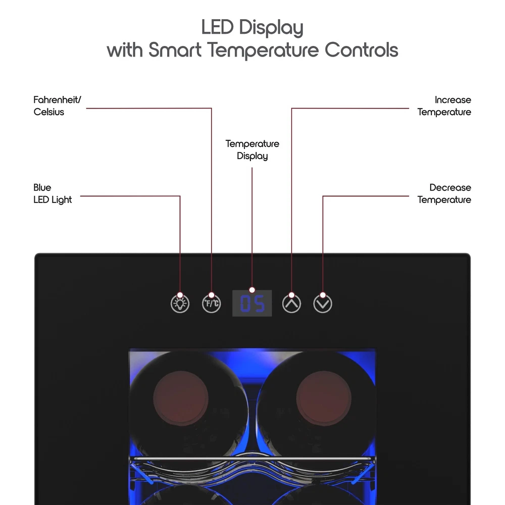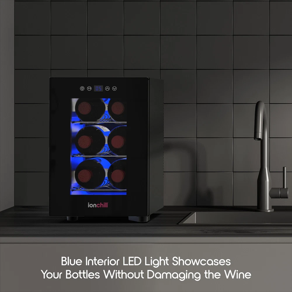 Keep your wine collection perfectly chilled with the Ionchill 6-Bottle Wine Cooler! This spacious, yet space-saving countertop cooler has a standard 6-bottle capacity and three removable chrome steel racks to keep your bottles stacked nicely and securely. Its smart cooling technology maintains balanced humidity levels and a constant internal temperature between 53-64°F, guaranteeing that your wine will always taste rich and fresh. Monitor and adjust your cooler’s internal temperature easily with its smart temperature controls and LED display. Quiet and compact, this sleek wine cooler is the ideal storage space for your red vintages. New Ionchill Wine Cooler Beverage Refrigerator with 6-bottle capacity LED smart display with Fahrenheit and Celsius temperature controls Soft blue LED interior lighting that showcases your bottles without damaging the wine Spacious interior with a space-saving exterior design at 17.66 x 9.76 x 14.43 in. Ideal temperature for red and white wine; fits most wine bottles (excluding champagne bottles) Specs: Input – 12V/5A; Power – 60W (Max); Capacity – 6 750mL wine bottles; Temperature Range – 53-65°F (12-18°C)