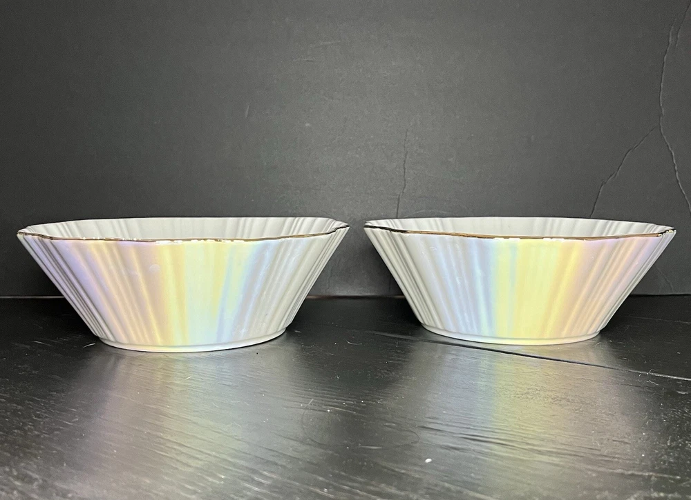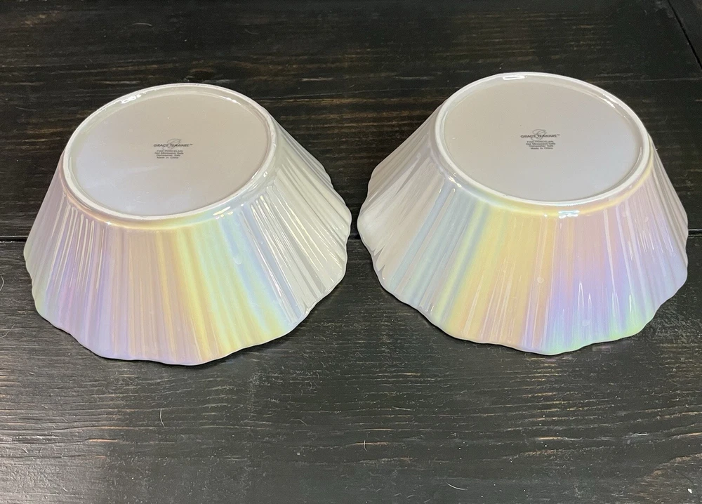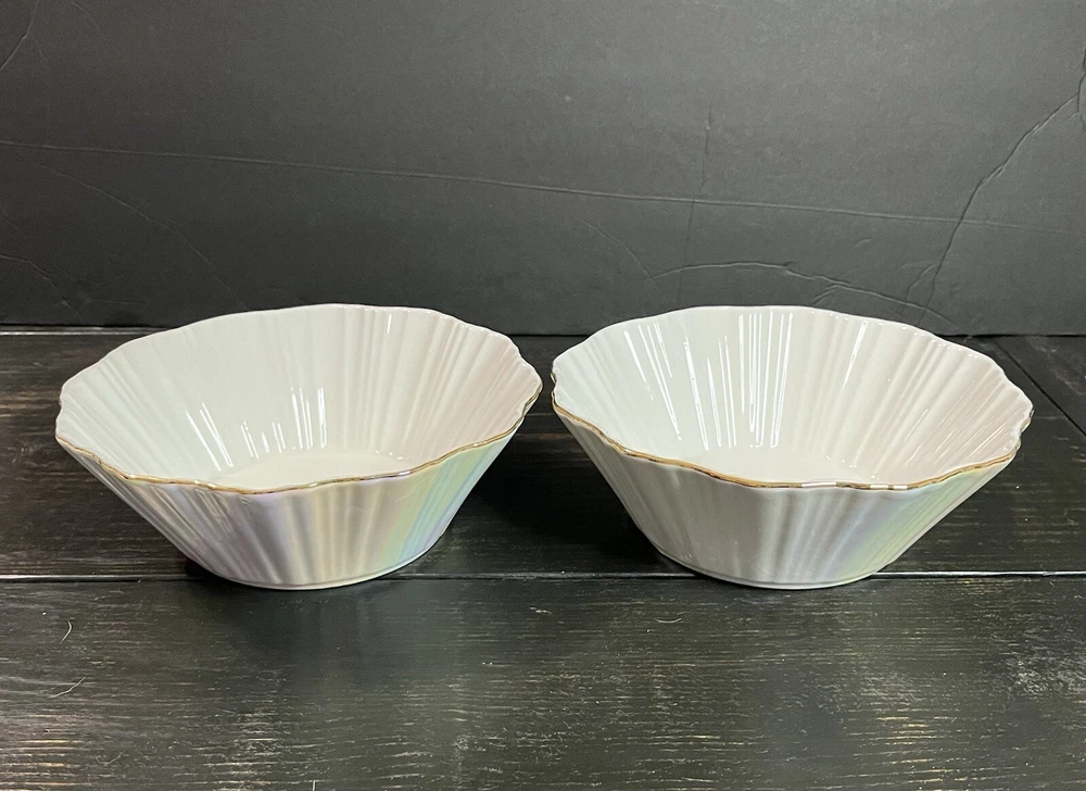 Iridescent Fine Porcelain Scalloped Gold Rim Bowl By Grace Teaware Set Of 2-8” Pre-owned, never used. Excellent condition. Photos are part of the description.