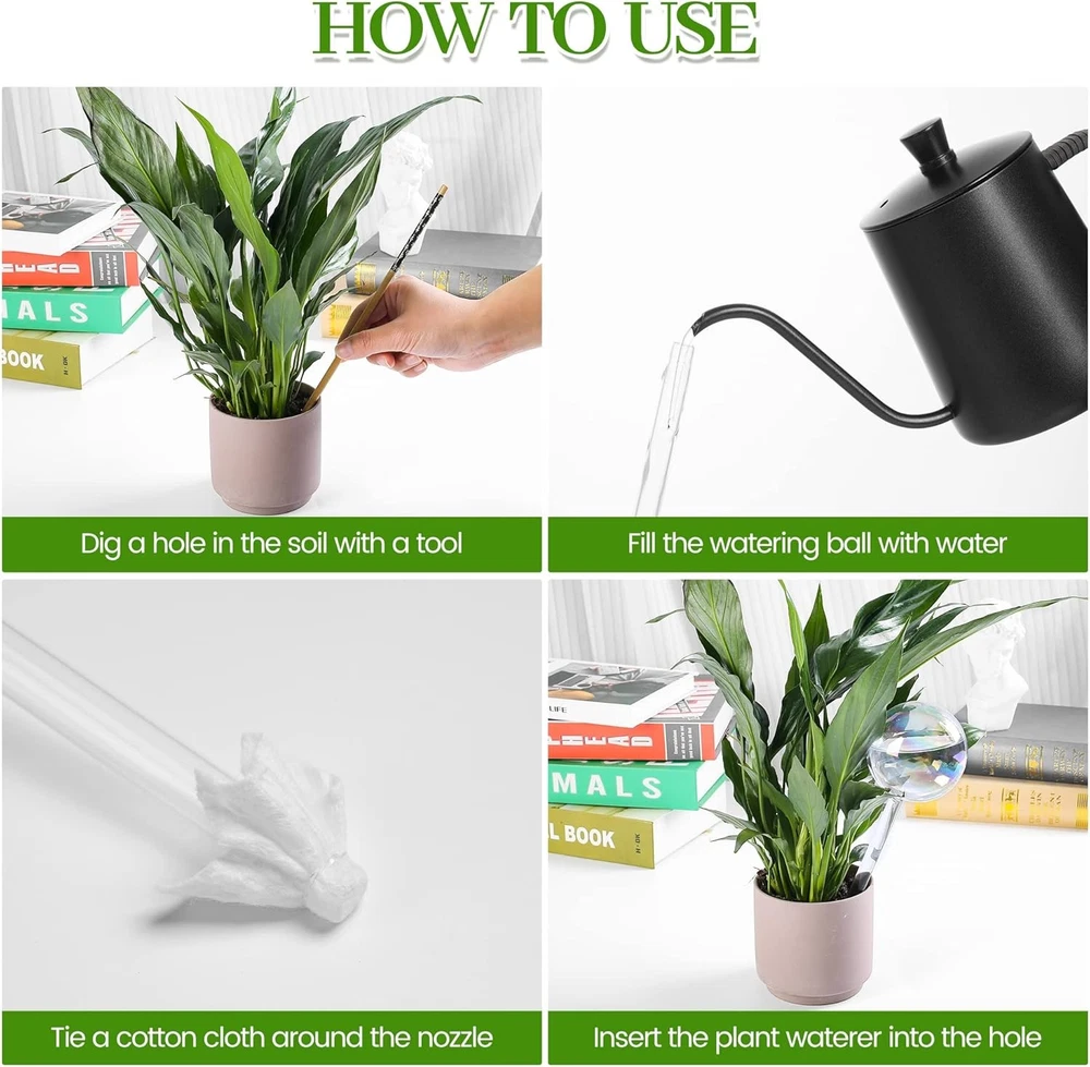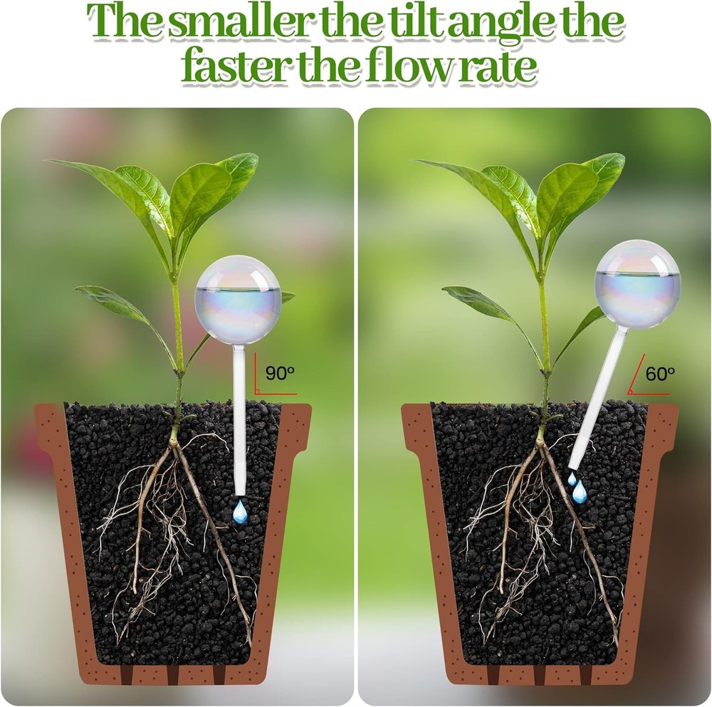 Plant Watering Globes - 4 Pack Iridescent Rainbow Gradient Color Clear Glass Plant Watering Devices - Self Watering Planter Insert for Indoor and Outdoor Plants - Measures 9" L x 2.9" D Product Details Product Dimensions: 9 x 2.9 x 2.9 inches Item Weight: 8.4 ounces Manufacturer: jiuhexuj Country of Origin: China Item model number: Plant Watering Globe-6 Water Plants for You: A beautiful self watering globes is to add a decorative touch to your house and garden, The water bulbs for indoor plants will provide your flowers or plants with enough water - especially help you water plants while away to travel Relaxed Grow Plants: The plant watering globe can distribute water for 1 weeks to help plants maintain water and nutrition while you're away. The soil slowly absorbs water from the globe and the water will stop flowing once it's saturated watering system Easy to Use:Plant watering globes Approx 9" high 2.7" diameter, Turn on the water tap and turn it down a little to let the water run slowly. Fill water into the globe through the pipe opening. Cover the opening with a soaked cloth to prevent the pipe from being blocked by soil. Pipe downwards, then insert it into the soil. The amount of water flowing out depends on the quality of the soil Gardening Present:Hand-blown colorful self watering globes are gardening tools that keeps the plants hydrated, and a beautiful decoration for house plants. A great present for family/friends/plant lovers/busy gardeners Widely Use:The plant watering globes can be used indoor or outdoor like the garden,home,office,school,decorate the room. And the watering bulbs can also be used with any plant size like hanging plants or patio plants