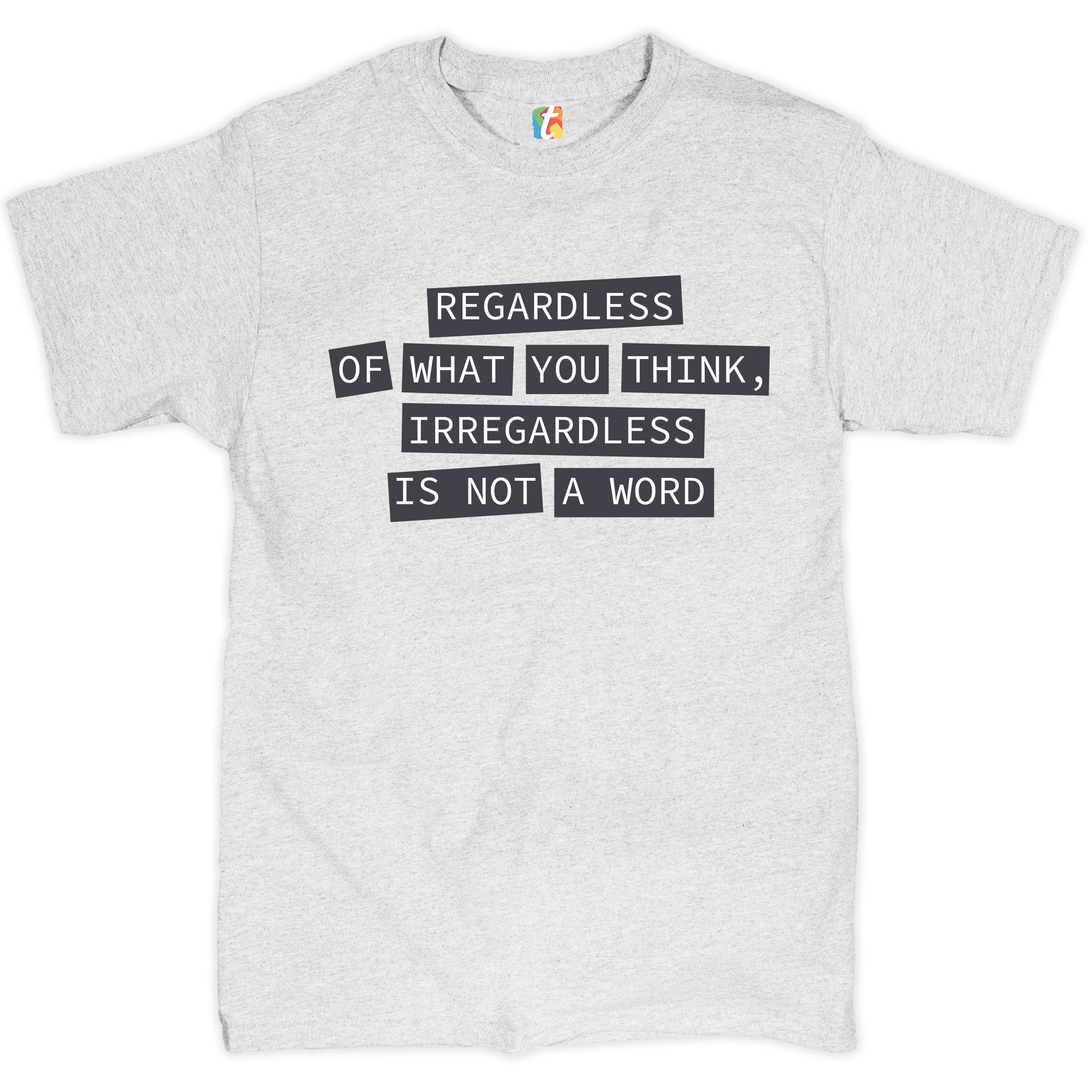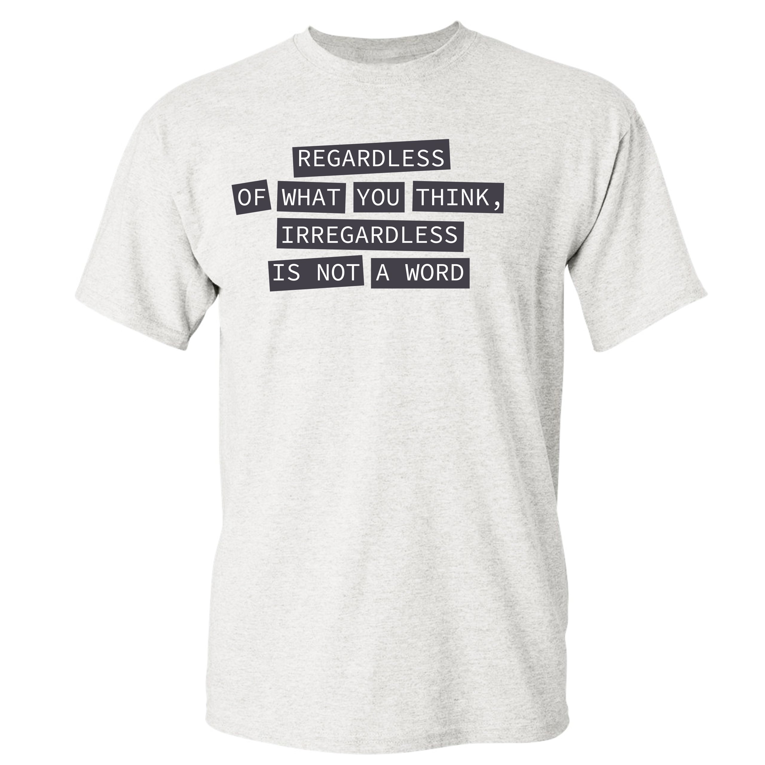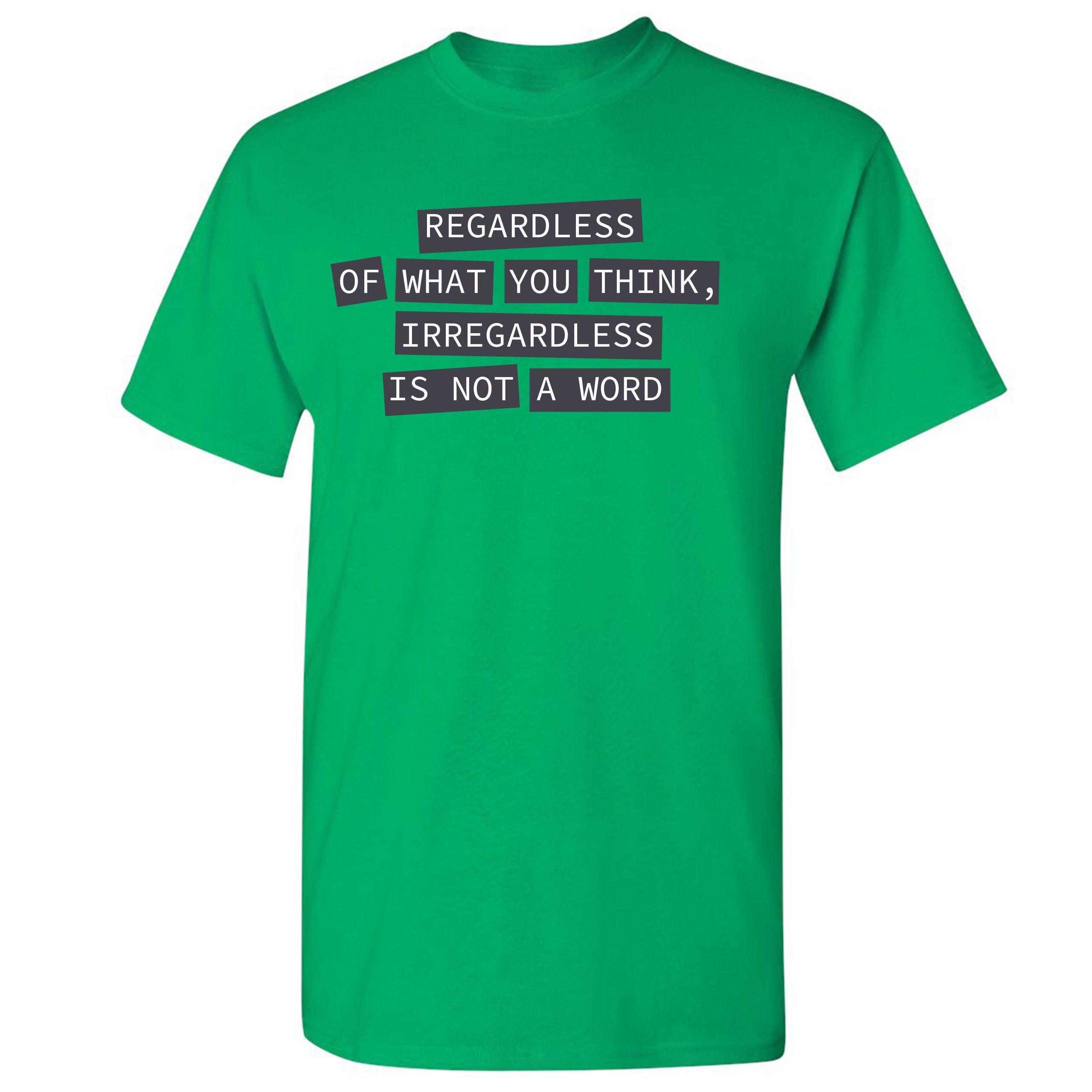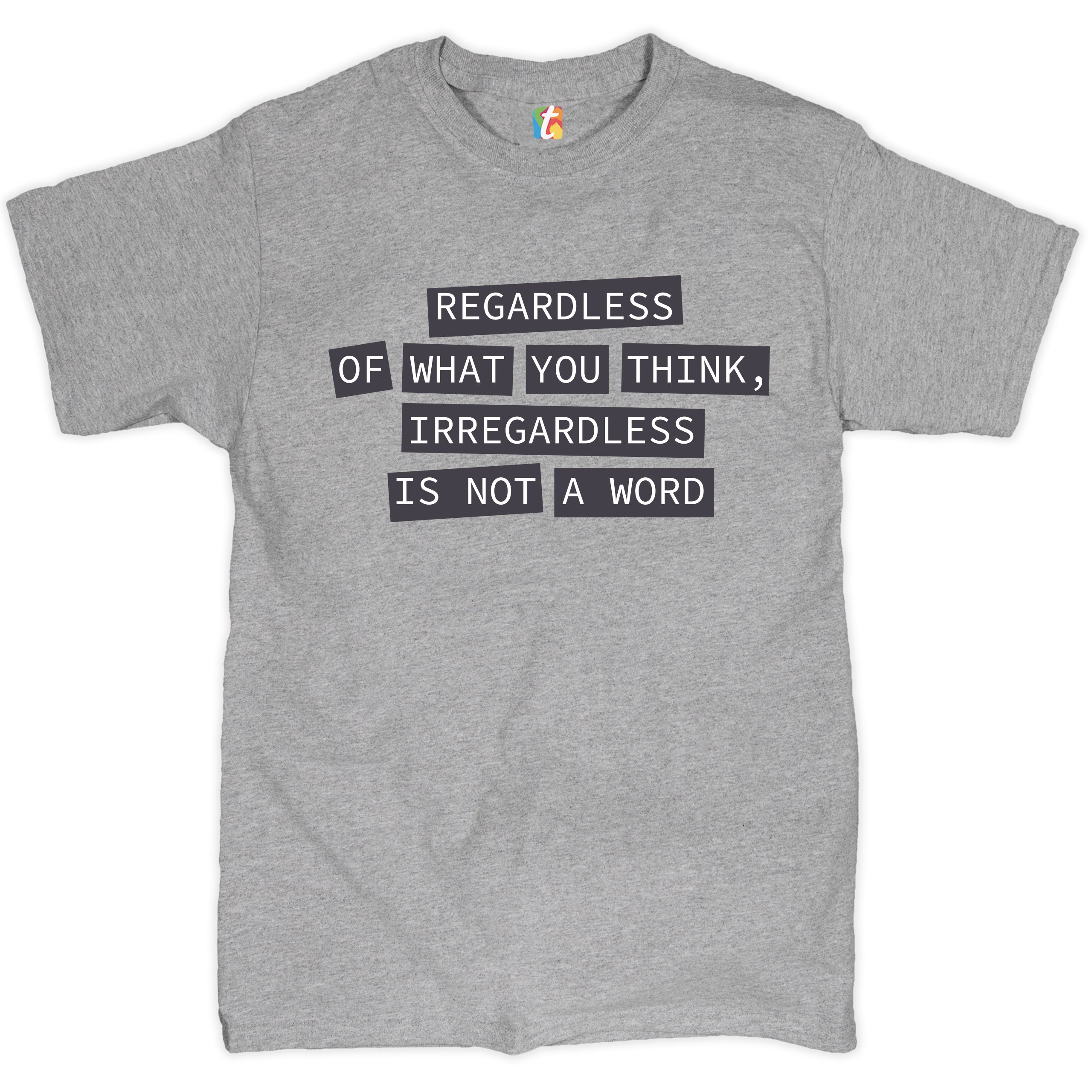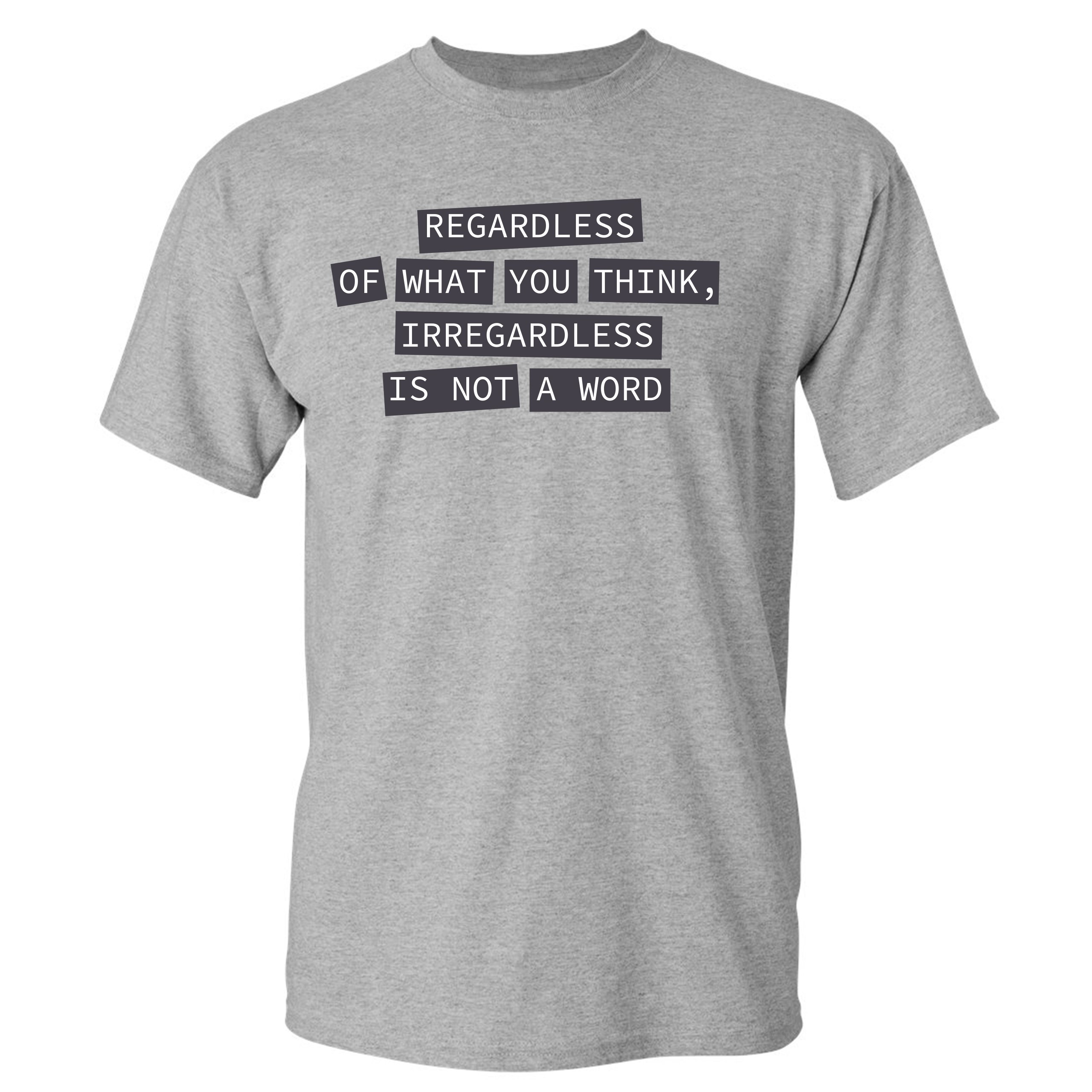 Fast & Free Shipping HIGH QUALITY 1 DAY HANDLING Irregardless Is Not a Word T-shirt Grammar Police Funny Men's Tee ITEM DESCRIPTION Brand New Men's Short Sleeve Tee High Quality Print Classic Fit 100% Pre-Shrunk Cotton Sport Grey : 90/10 cotton/polyester Ash Grey: 99/1 cotton/polyester Printed in the USA Also Available In WASHING INSTRUCTIONS: turn inside out and wash in cold water on a delicate cycle of your washing machine. Try to avoid dryer or set it on low heat. To minimize shrinkage we recommend to air dry. PLEASE NOTE: The print may appear smaller on larger sizes. Due to the many variations in monitors and browsers, actual colors may vary slightly from what appears online. PAYMENTS: We accept the following payment methods: Paypal, All Major Credit Cards (processed through eBay's Payment System, no account necessary). We do not ship package until the payment is cleared. if you have a problem with payment, please contact us. SHIPPING: We offer FREE domestic shipping within the continental US! Your order will be shipped within 1 business day of receiving payment (Monday-Friday) Shipping services we offer: Domestic Orders: USPS First Class Mail, Priority Mail and Express options. International Orders: USPS First Class Mail, Priority Mail and Express options. We are NOT responsible for any foreign customs duties or taxes. We do not refund postage for unclaimed, undeliverable or refused packages. If a package is returned as undeliverable unclaimed or refused, it is the customers responsibility to follow up with the postal carrier. In the very unlikely event that your item is lost or damaged during post, then WE are responsible and will issue either a full refund or replacement. RETURNS: If you are not completely satisfied with your purchase, you can return the item within 30 days and get a full refund if the item is defective, damaged, or an error is made on our end. If you would like to exchange the item, please contact us through eBay Messages. All returns must be initiated through eBay Returns System. If 30 days have gone by since your purchase, unfortunately we can’t offer you a refund or exchange. And returned item can be shipped back to customer at customers expense, or will be disposed within 7 days. To be eligible for a return, your item must be unused, unwashed and in the same condition that you received it. Custom made items (including custom images, writing or other customization requested by customer) are not eligible for a refund or exchange. Once your return is received and inspected, we will notify you of the approval or rejection of your refund. If approved, your refund will be processed, and a credit will automatically be applied to original method of payment, within 3-4 days. All payments and refunds are processed by eBay's Payment system. If a refund has been issued, but you do not see the funds in your account within 3-4 days, please contact eBay Support. You will be responsible for paying for your own shipping costs for returning your item. Shipping costs are non-refundable. if you receive a refund, the cost of return shipping will be deducted from your refund. Depending on where you live, the time it may take for your exchanged product to reach you, may vary. You should consider using a trackable shipping service or purchasing shipping insurance. We don’t guarantee that we will receive your returned item. Visit our ebay store to see more amazing items T-Shirts Sweatshirts Tank Tops