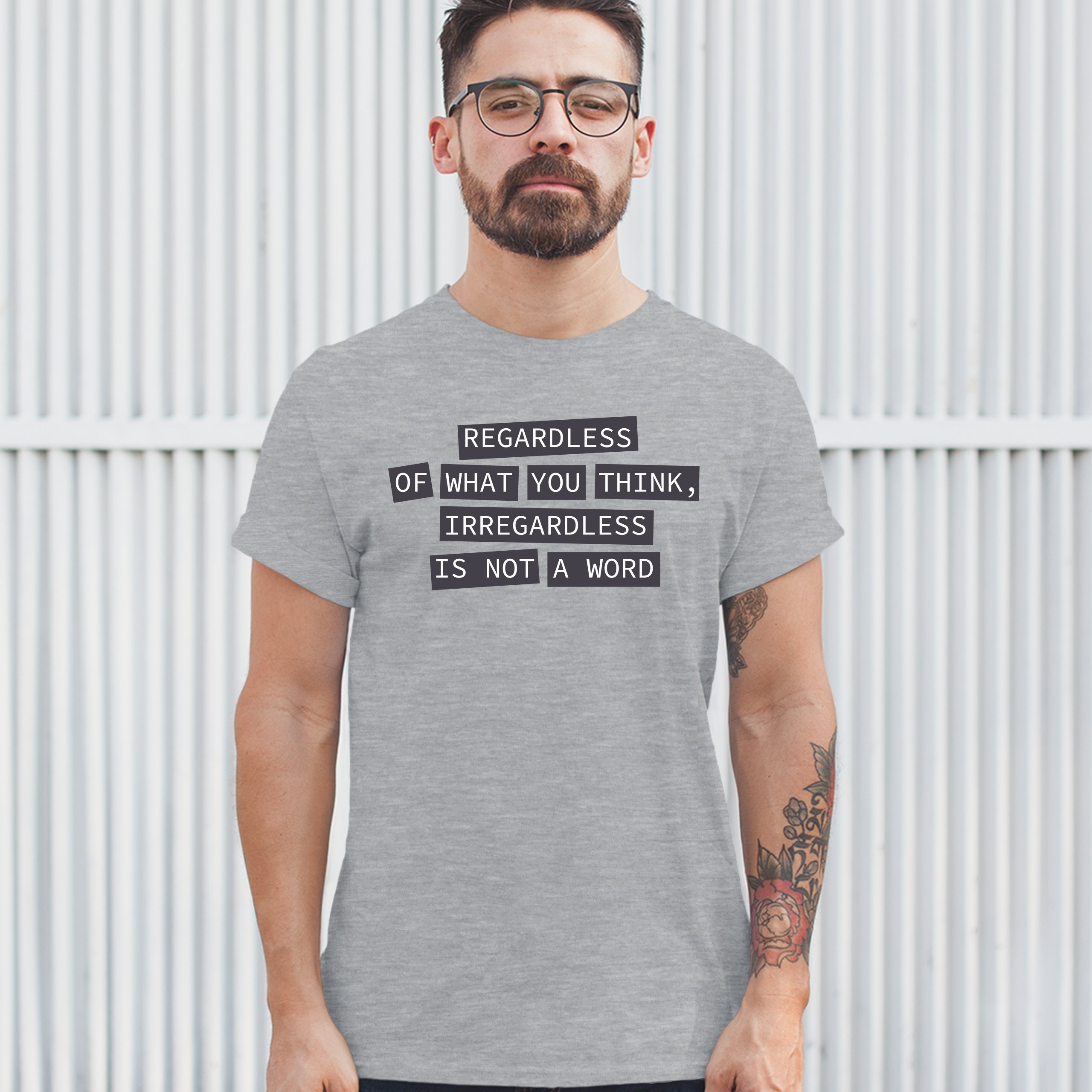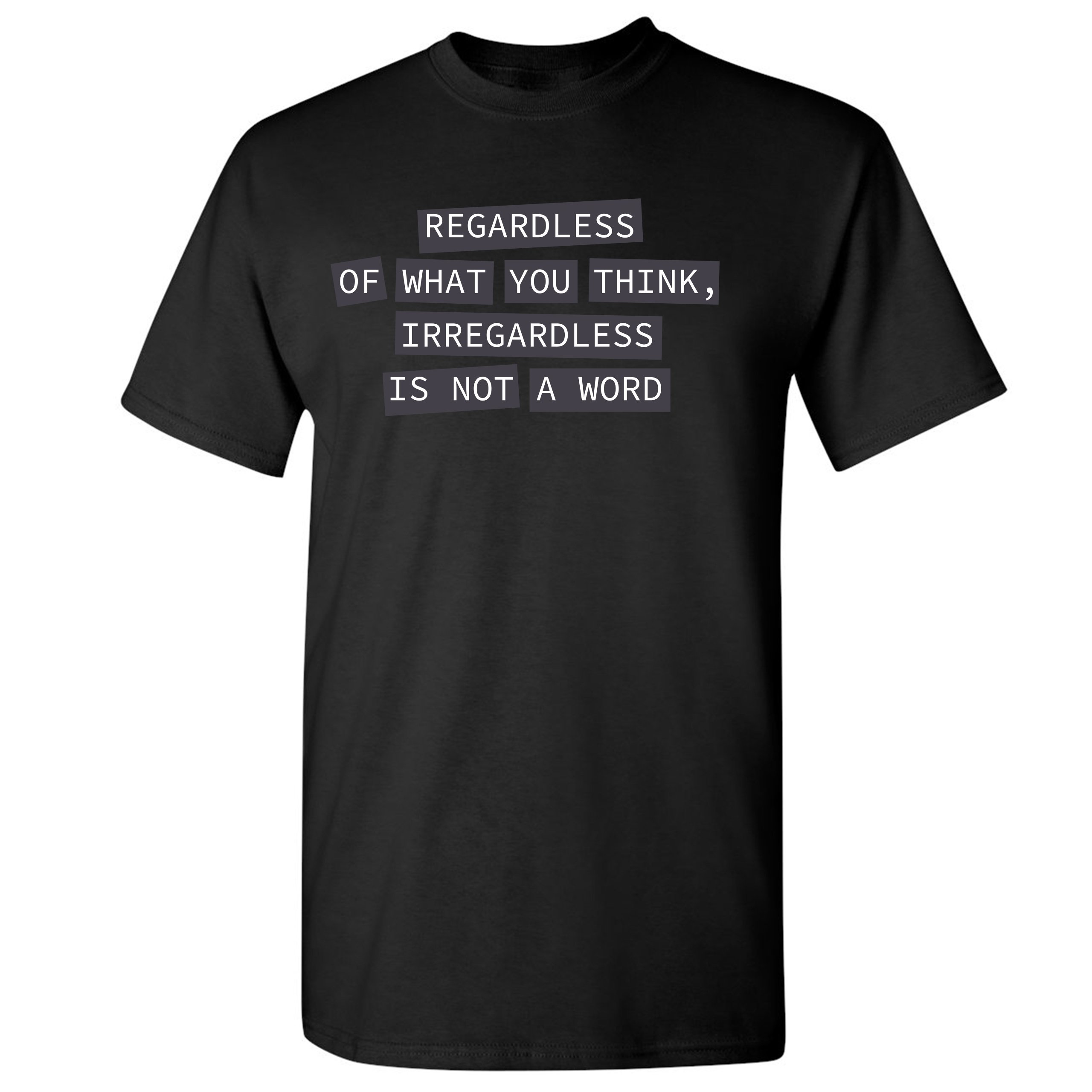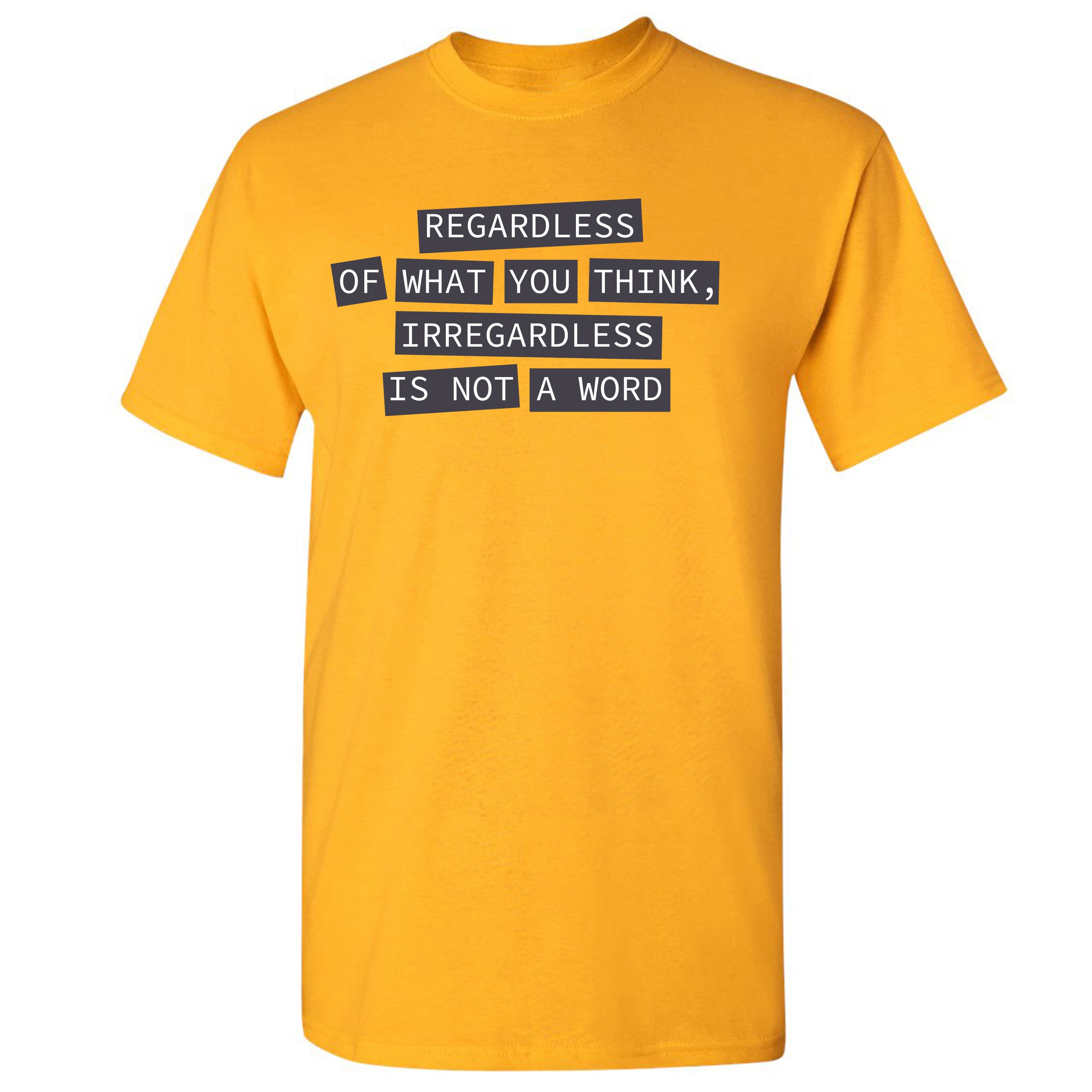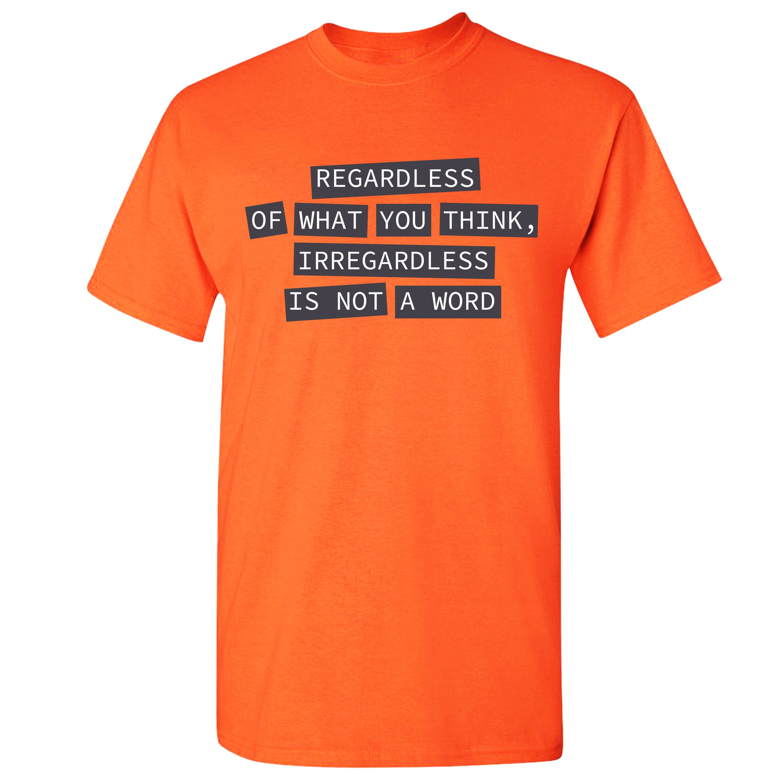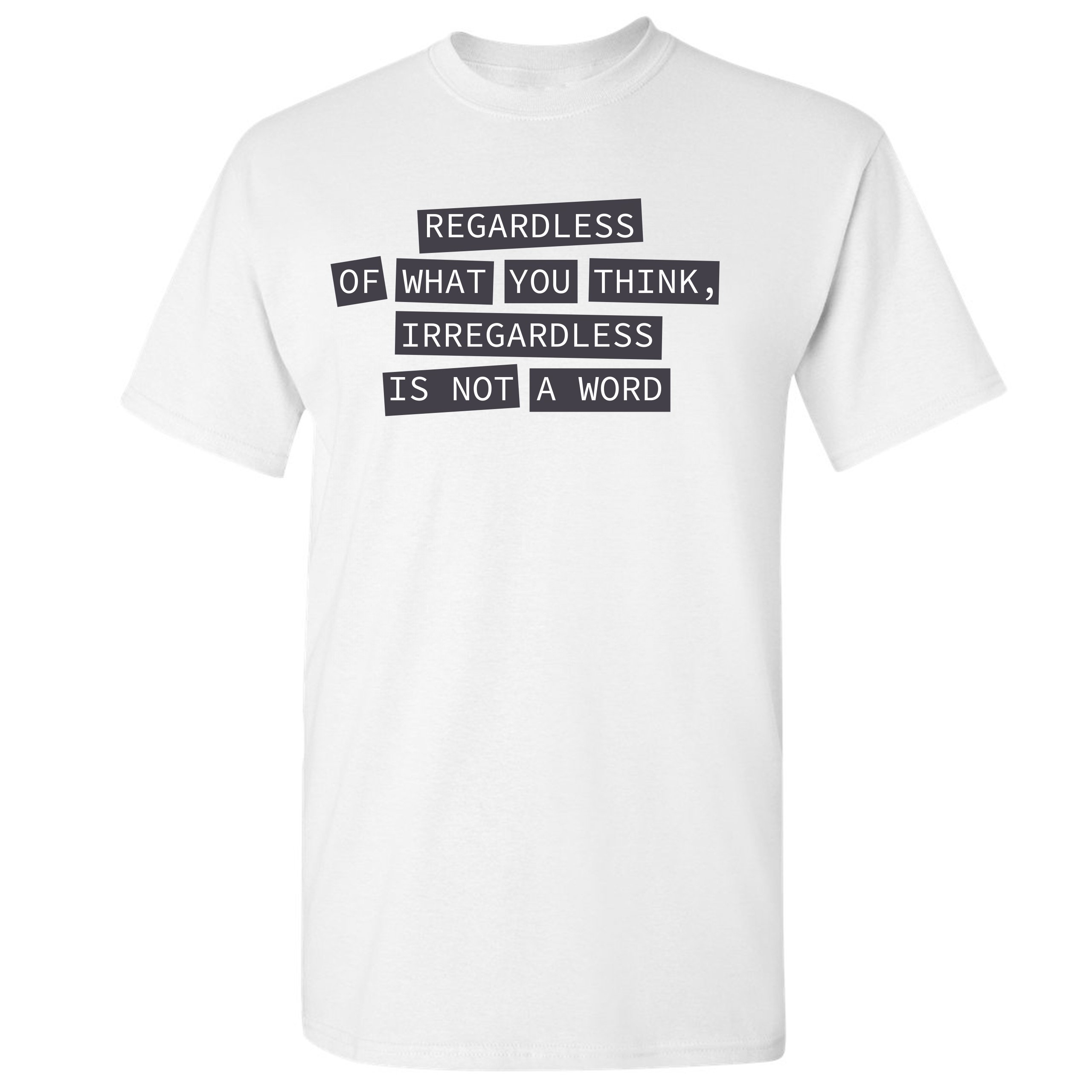 Fast & Free Shipping HIGH QUALITY 1 DAY HANDLING Irregardless Is Not a Word T-shirt Grammar Police Funny Men's Tee ITEM DESCRIPTION Brand New Men's Short Sleeve Tee High Quality Print Classic Fit 100% Pre-Shrunk Cotton Sport Grey : 90/10 cotton/polyester Ash Grey: 99/1 cotton/polyester Printed in the USA Also Available In WASHING INSTRUCTIONS: turn inside out and wash in cold water on a delicate cycle of your washing machine. Try to avoid dryer or set it on low heat. To minimize shrinkage we recommend to air dry. PLEASE NOTE: The print may appear smaller on larger sizes. Due to the many variations in monitors and browsers, actual colors may vary slightly from what appears online. PAYMENTS: We accept the following payment methods: Paypal, All Major Credit Cards (processed through eBay's Payment System, no account necessary). We do not ship package until the payment is cleared. if you have a problem with payment, please contact us. SHIPPING: We offer FREE domestic shipping within the continental US! Your order will be shipped within 1 business day of receiving payment (Monday-Friday) Shipping services we offer: Domestic Orders: USPS First Class Mail, Priority Mail and Express options. International Orders: USPS First Class Mail, Priority Mail and Express options. We are NOT responsible for any foreign customs duties or taxes. We do not refund postage for unclaimed, undeliverable or refused packages. If a package is returned as undeliverable unclaimed or refused, it is the customers responsibility to follow up with the postal carrier. In the very unlikely event that your item is lost or damaged during post, then WE are responsible and will issue either a full refund or replacement. RETURNS: If you are not completely satisfied with your purchase, you can return the item within 30 days and get a full refund if the item is defective, damaged, or an error is made on our end. If you would like to exchange the item, please contact us through eBay Messages. All returns must be initiated through eBay Returns System. If 30 days have gone by since your purchase, unfortunately we can’t offer you a refund or exchange. And returned item can be shipped back to customer at customers expense, or will be disposed within 7 days. To be eligible for a return, your item must be unused, unwashed and in the same condition that you received it. Custom made items (including custom images, writing or other customization requested by customer) are not eligible for a refund or exchange. Once your return is received and inspected, we will notify you of the approval or rejection of your refund. If approved, your refund will be processed, and a credit will automatically be applied to original method of payment, within 3-4 days. All payments and refunds are processed by eBay's Payment system. If a refund has been issued, but you do not see the funds in your account within 3-4 days, please contact eBay Support. You will be responsible for paying for your own shipping costs for returning your item. Shipping costs are non-refundable. if you receive a refund, the cost of return shipping will be deducted from your refund. Depending on where you live, the time it may take for your exchanged product to reach you, may vary. You should consider using a trackable shipping service or purchasing shipping insurance. We don’t guarantee that we will receive your returned item. Visit our ebay store to see more amazing items T-Shirts Sweatshirts Tank Tops