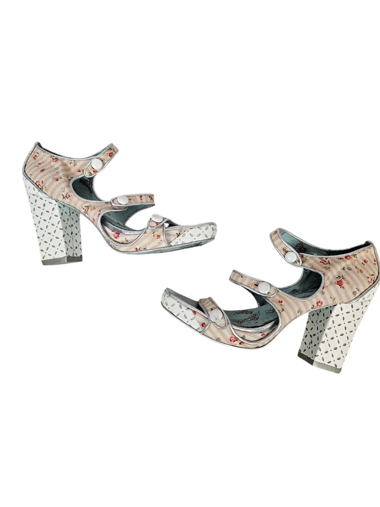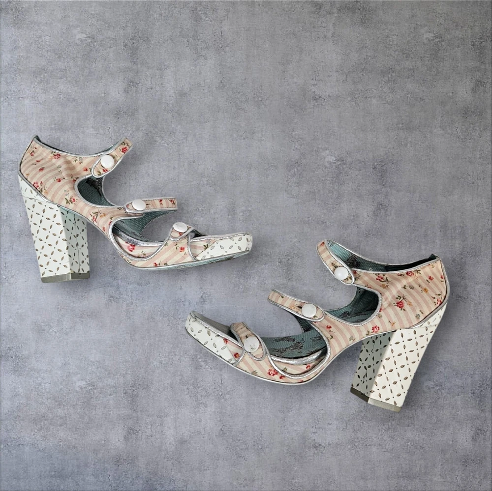 Irregular Choice Striped Floral Strappy Platform Heels Unicorn Bottoms Size 8 In excellent condition Irregular Choice Striped Floral Strappy Platform Heels Unicorn Bottoms Size 8 Women's. Features inspired 50s style platform heels by Irregular Choice, chucky heel with leather perforated diamond shape, peep toe, 3 straps with white leather buttons, silver toe beds, perforated white leather diamond print platform, square peep toe, pink and white striped floral print, Tiffany Blue bottoms adorned with unicorns, pin up girl style, cosplay, feminine heels, unique high heels. Measurements platform height .75" heel height 3.5" Fabric unknown This is a pre-owned item that may show signs of wear. In excellent condition, light black mark on 1 button and on back.