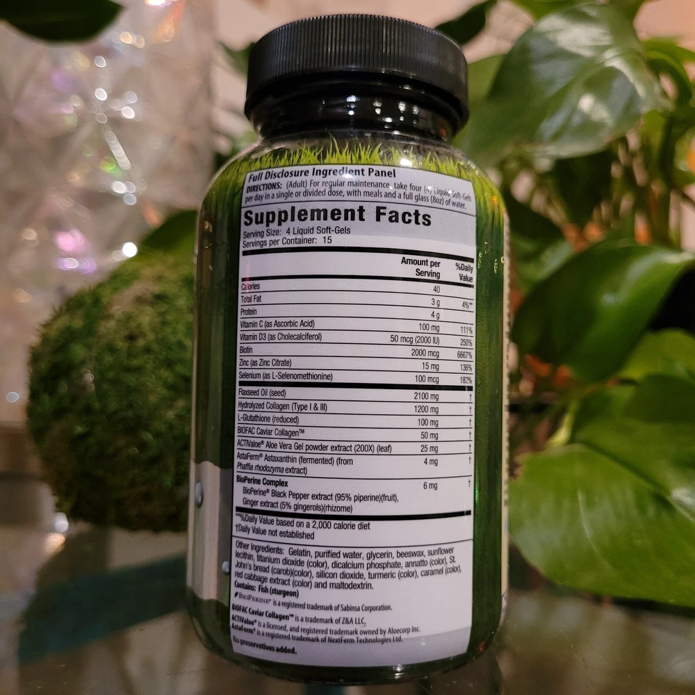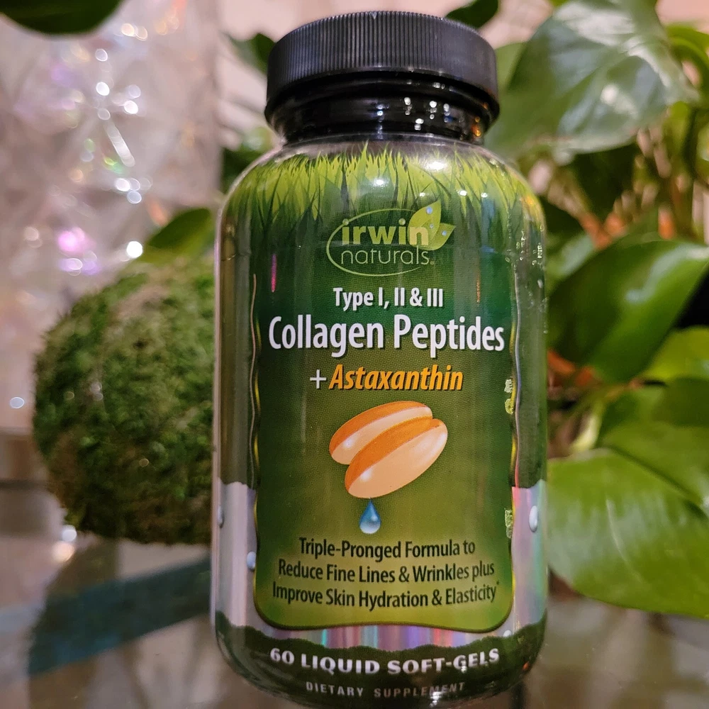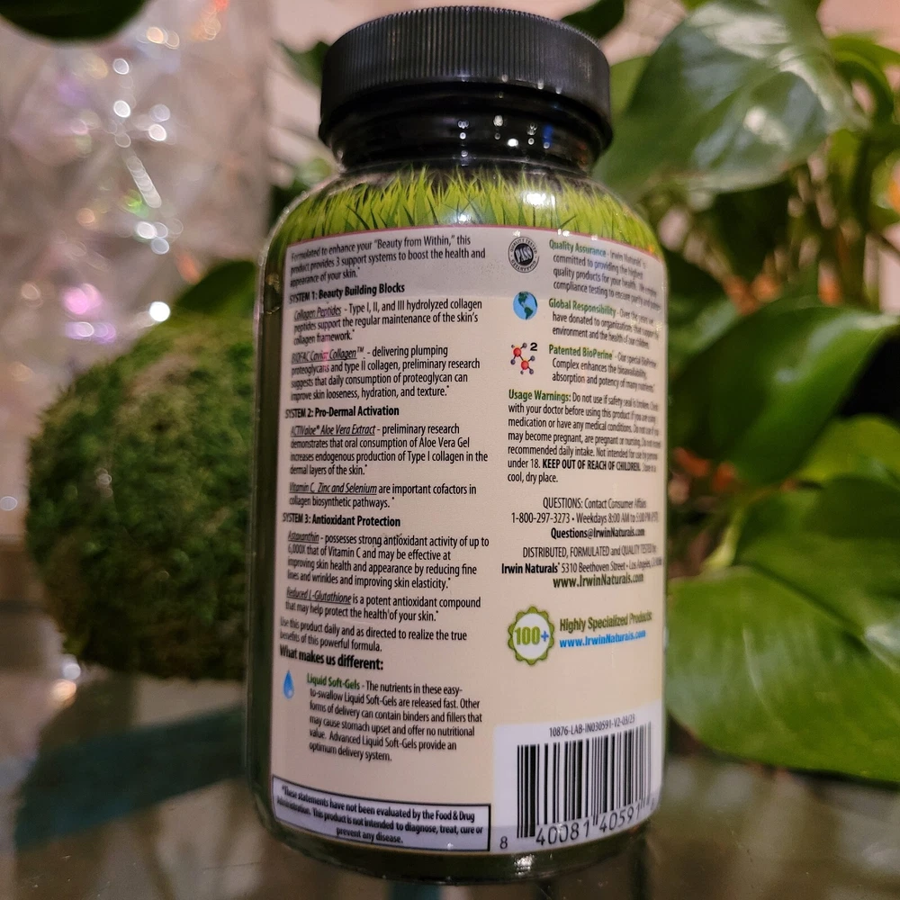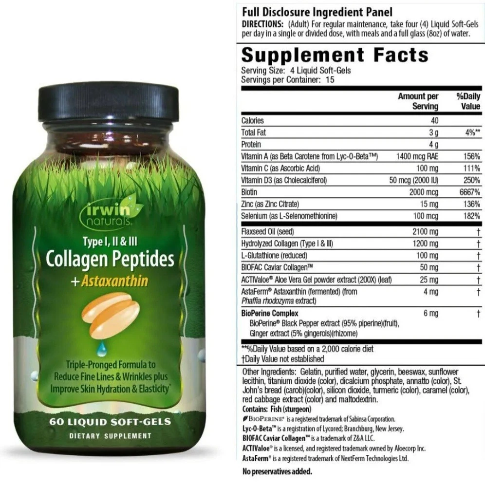 Irwin Naturals Collagen Peptides Astaxanthin Anti No Age Wrinkle 60 Softgels. Description Dietary Supplement Quality Tested Pass Guaranteed Highly Specialized Products Triple-pronged formula to reduce fine lines & wrinkles plus improve skin hydration & elasticity. Formulated to enhance your "Beauty from Within," this product provides 3 support systems to boost the health and appearance of your skin. SYSTEM 1: Beauty Building Blocks Collagen Peptides - Type I, II, and III hydrolyzed collagen peptides support the regular maintenance of the skin's collagen framework. BIOFAC Caviar Collagen™ - delivering plumping proteoglycans and type II collagen, preliminary research suggests that daily consumption of proteoglycan can improve skin looseness, hydration, and texture. SYSTEM 2: Pro-Dermal Activation ACTIValoe® Aloe Vera Extract - preliminary research demonstrates that oral consumption of Aloe Vera Gel increases endogenous production of Type I collagen in the dermal layers of the skin. Vitamin C, Zinc and Selenium are important cofactors in collagen biosynthetic pathways. SYSTEM 3: Antioxidant Protection Astaxanthin - possesses strong antioxidant activity of up to 6,000X that of Vitamin C and may be effective at improving skin health and appearance by reducing fine lines and wrinkles and improving skin elasticity. Reduced L-Glutathione and Vitamin A are potent antioxidant compounds that may help to protect the health of your skin. Use this product daily and as directed to realize the true benefits of this powerful formula. What makes us different: Liquid Soft-Gels – The nutrients in these easy-to-swallow Liquid Soft-Gels are released fast. Other forms of delivery can contain binders and fillers that may cause stomach upset and offer no nutritional value. Advanced Liquid Soft-Gels provide an optimum delivery system. Quality Assurance – Irwin Naturals® is committed to providing the highest quality products for your health. We employ compliance testing to ensure purity and potency. Patented BioPerine® – Our special BioPerine Complex enhances the bioavailability, absorption and potency of many nutrients.
