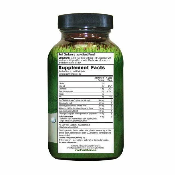 About This Item We aim to show you accurate product information. Manufacturers, suppliers and others provide what you see here, and we have not verified it. Irwin Naturals Ginza-Plus Maca & Rhodiola, 75ct. Ginza-Plus combines five of the most highly-prized adaptogens in the world including Maca, Rhodiola, Ginseng, Schisandra, and Cordyceps!* Adpatogens to the rescue! Russian scientists coined the term adaptogen to describe a special group of botanicals that increase the bodys resistance to physical, mental and environmental stressors.* Adaptogens have a broad influence on the entire body and, among their many properties, have the capacity to balance body function and support body systems affected by stress.* Ginza-Plus is specially designed to promote general well-being, and is especially suited for individuals who feel depleted due to overwork, excess stress and inadequate rest.* It can be used daily for overall support or as needed during times of stress.* *These statements have not been evaluated by the Food & Drug Administration. This product is not intended to diagnose, treat, cure or prevent any disease. IRWIN NTRLS ADVNC GINZA PLUS PWRFL ADPTG FRML GNSNG EXTRC SFTGL BTL HERBAL AND OIL SUPPLEMENTS Indications: Health Concern: Energy Support Warnings: Usage Warnings: Do not use if safety seal is broken. This product contains Ingredients that may affect blood pressure and/ or heart conditions. Check with your doctor before using this product and engaging in activity, if you are using medication or have any medical conditions, including heart disease or high/ low blood pressure. Do not exceed 90 days of continuous use of this product without a two (2) week break. Do not use if you may become pregnant, are pregnant or nursing. Do not exceed recommended daily intake. Not intended for use by persons under 18. keep out of reach of children. Store in a cool, dry place. Warning: (State of California Prop 65) This product contains a chemical known to the State of California to cause birth defects and other reproductive harm. Ingredients: Ingredients: Other Ingredients: Gelatin, Purified Water, Beeswax, Glycerin, Soy Lecithin, Annatto, Titanium Dioxide, St. Johns Bread and Turmeric. Contains: Fish (Anchovy, Sardine), Soy. Active Ingredients: Fish Oil (30% Omega-3 fatty acids, 450 mg) 1500 mg , Maca powder (root) 500 mg , Rhodiola (Rhodiola rosea) powder (root) 250 mg , Schisandra (Schisandra chinensis) powder (berry) 250 mg , Asian Ginseng extract (root) 62 mg , Cordyceps (Cordyceps sinensis) extract (4:1)(mycelium) 50 mg , BioPerine Complex 6 mg BioPerine® Black Pepper extract (95% piperine)(fruit), Ginger extract (5% gingerols)(rhizome). Other Ingredients: Gelatin, purified water, glycerin, beeswax, soy lecithin, annatto (color), titanium dioxide (color), St. Johns bread (carob)(color) and turmeric (color). Contains: Fish (anchovy, sardine), Soy. Directions: Dosage: 3.00 Softgel(s) Instructions: (Adult) Take three (3) Liquid Soft-Gels per day with meals. May be taken all at once or divided throughout the day. Specifications Assembled Product Weight 0.65 lb Brand Irwin Naturals Manufacturer Irwin Naturals Features increase_the_bodys_resistance_to_physical,_mental, resistance_to_physical, mental_and_environmental_stressors Assembled Product Dimensions (L x W x H) 2.50 x 2.50 x 5.00 Inches ~ Will be wrapped with care. ~ ~FREE SHIPPING~ Any questions, please feel free to contact us. Buy with confidence! Thanks for looking!