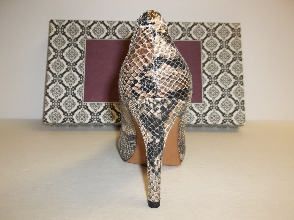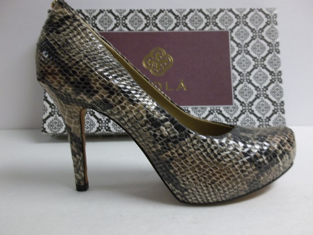 Isola Size 6.5 M Cagney Snake Print Sand Leather Platform Pumps New Womens Shoes. Leather snake print upper. Remainder is man made materials. Actual heel height is approx 4 inches. Platform is approx 3/4 inches. Euro 37.5.
