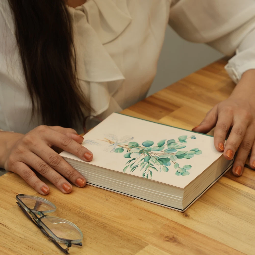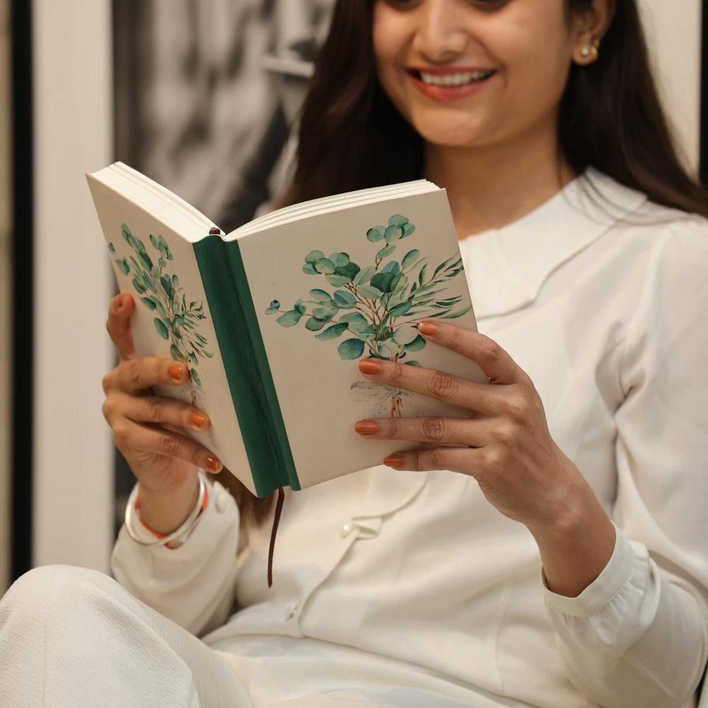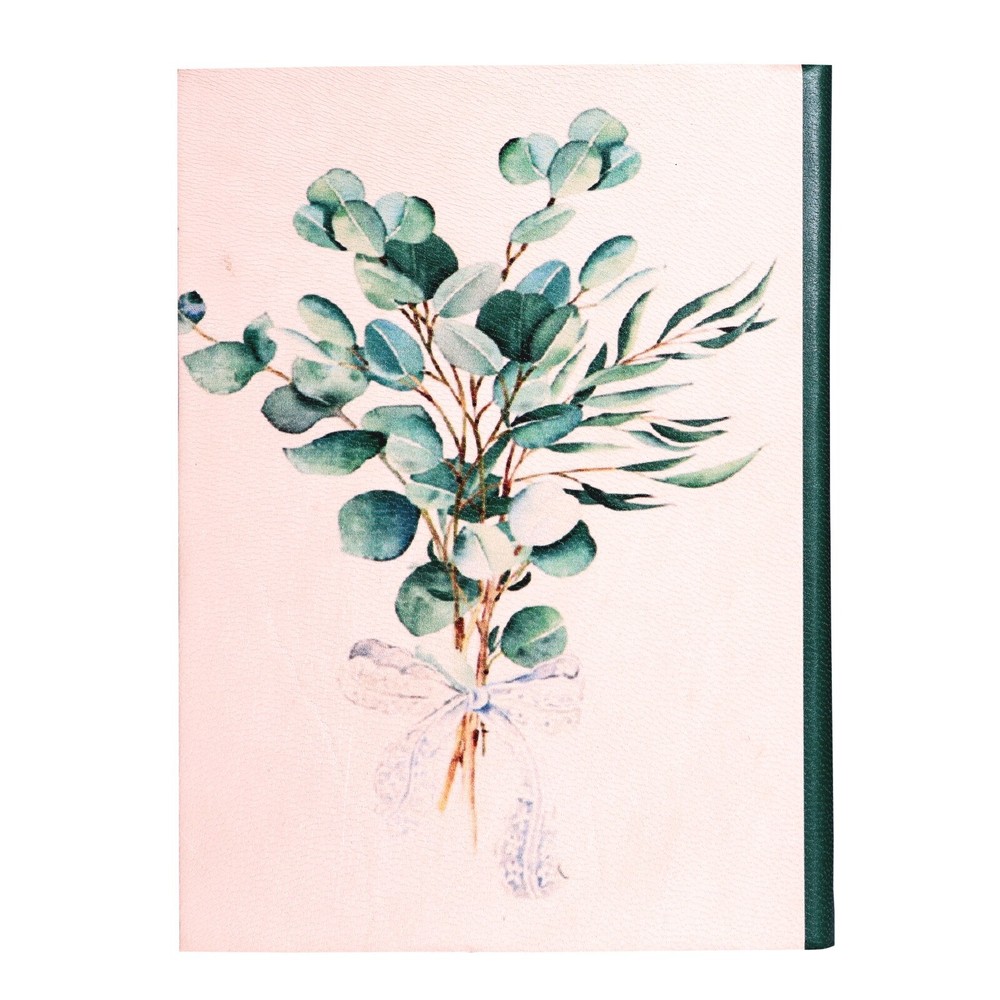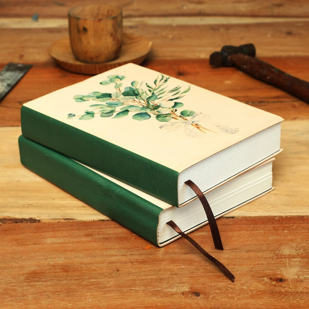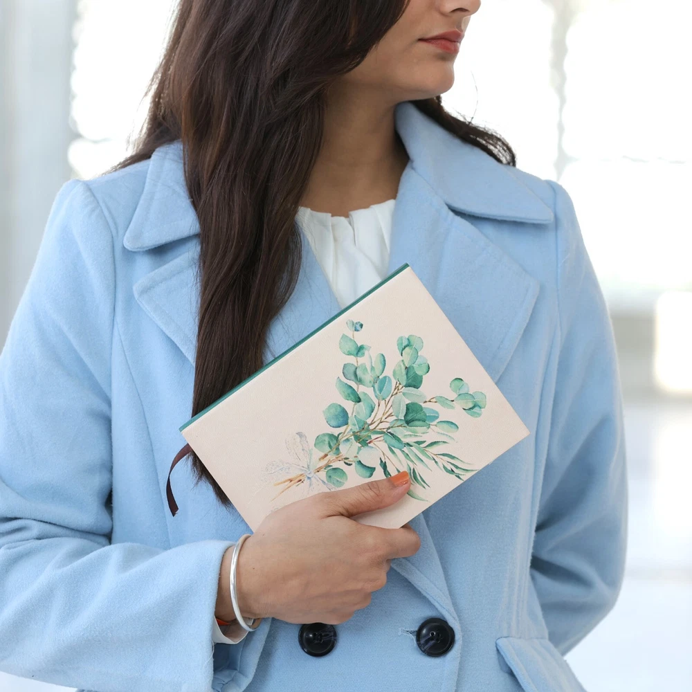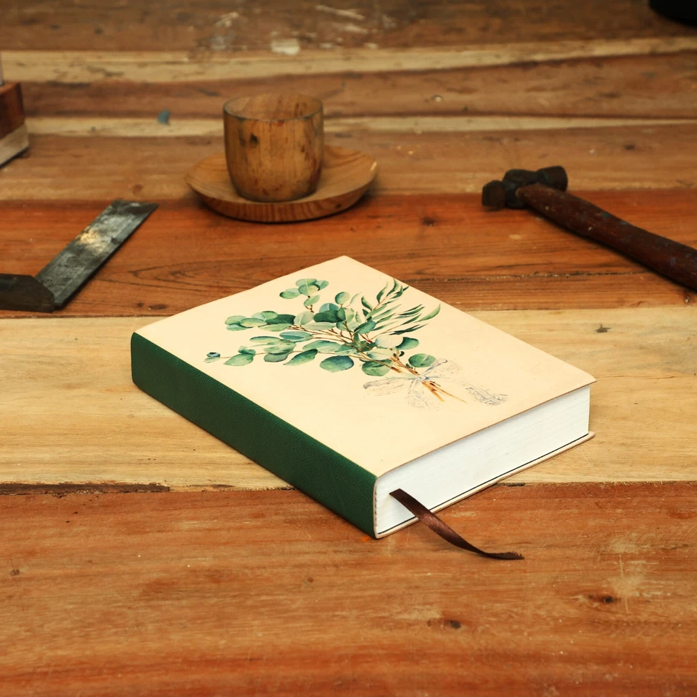 Features to Fall in Love With: Elegant Botanical Design: The eucalyptus bouquet motif embodies serenity and timeless beauty, perfect for writers and design enthusiasts. Expert Craftsmanship: Handcrafted using genuine leather and Assembled with precision using traditional bookbinding techniques, ensuring durability and quality. Exceptional Writing Pages: 190 sheets (380 lined ivory pages) of FSC-certified recycled 110-gram paper, ideal for journaling, planning, or creative writing. Durable and Thoughtful Details: Hand-sewn spine for a long-lasting finish and a coordinating green fabric bookmark to hold your place. Perfectly Sized for Daily Inspiration: At 8” x 6”, this journal is ideal for capturing your thoughts, ideas, and moments of reflection wherever life takes you. A Gift of Tranquility and Beauty:- Whether for a birthday, anniversary, or special occasion, this journal is a thoughtful gift for writers, creatives, or anyone who appreciates natural elegance. Write your story in the serene embrace of the Eucalyptus Bouquet Leather Journal, where artistry and inspiration meet.