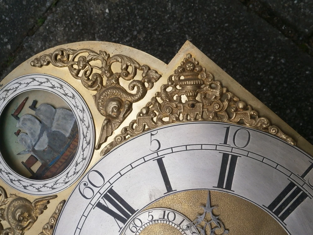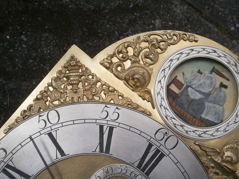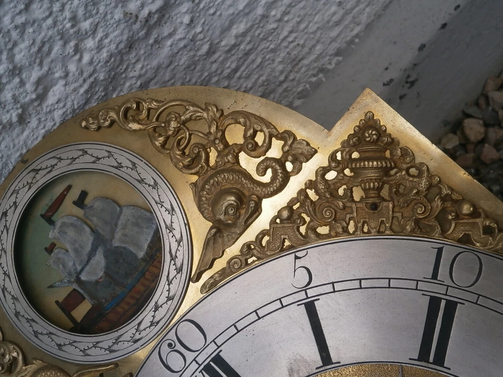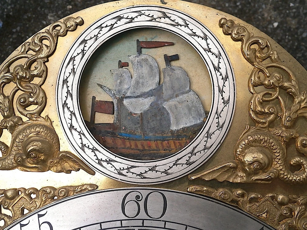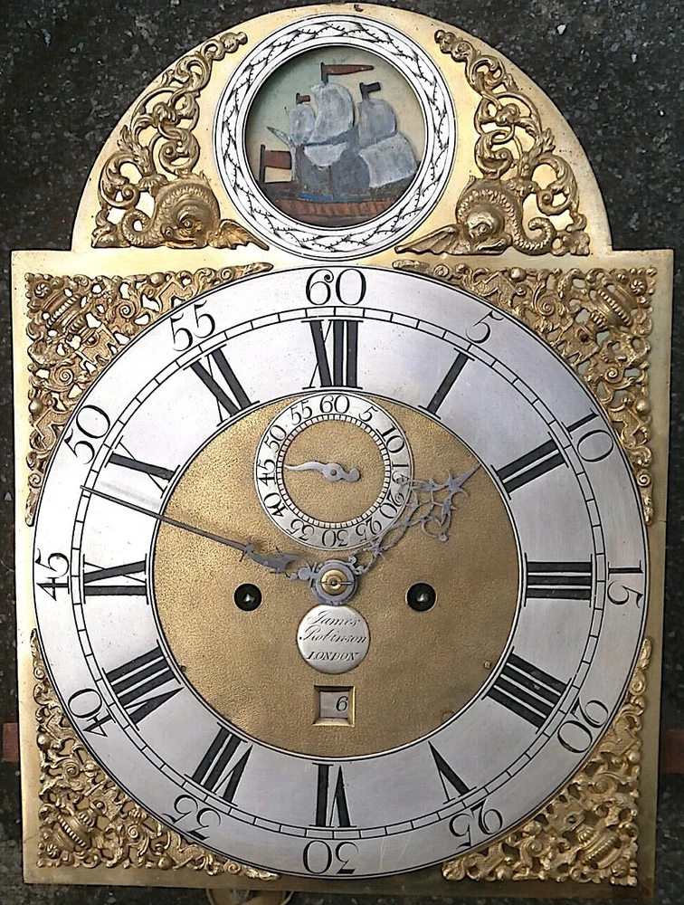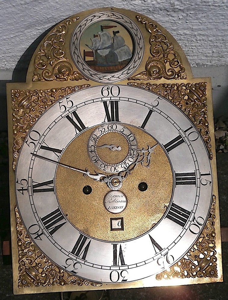 J ROBBINSON LONDON CLOCK DIAL+movent 12x16+1/4inch C1750 rocking ship LONGCASE GRANDFATHER CLOCK DIAL+movement 12x16+1/4 inch sold as is in the photos in need or restoration as you see it in the photos PLEASE SEE PHOTOS TICKS AND STRIKES WITH PRESSURE ON THE GREAT WHEELS 8day dial + movement ALL ORIGIANL TO EACH OTHER GOOD ITS BEEING SOLD FOR SPARES OR REPAIR ' POST UK 20 GBP USA AND EUROPE 95 GBP