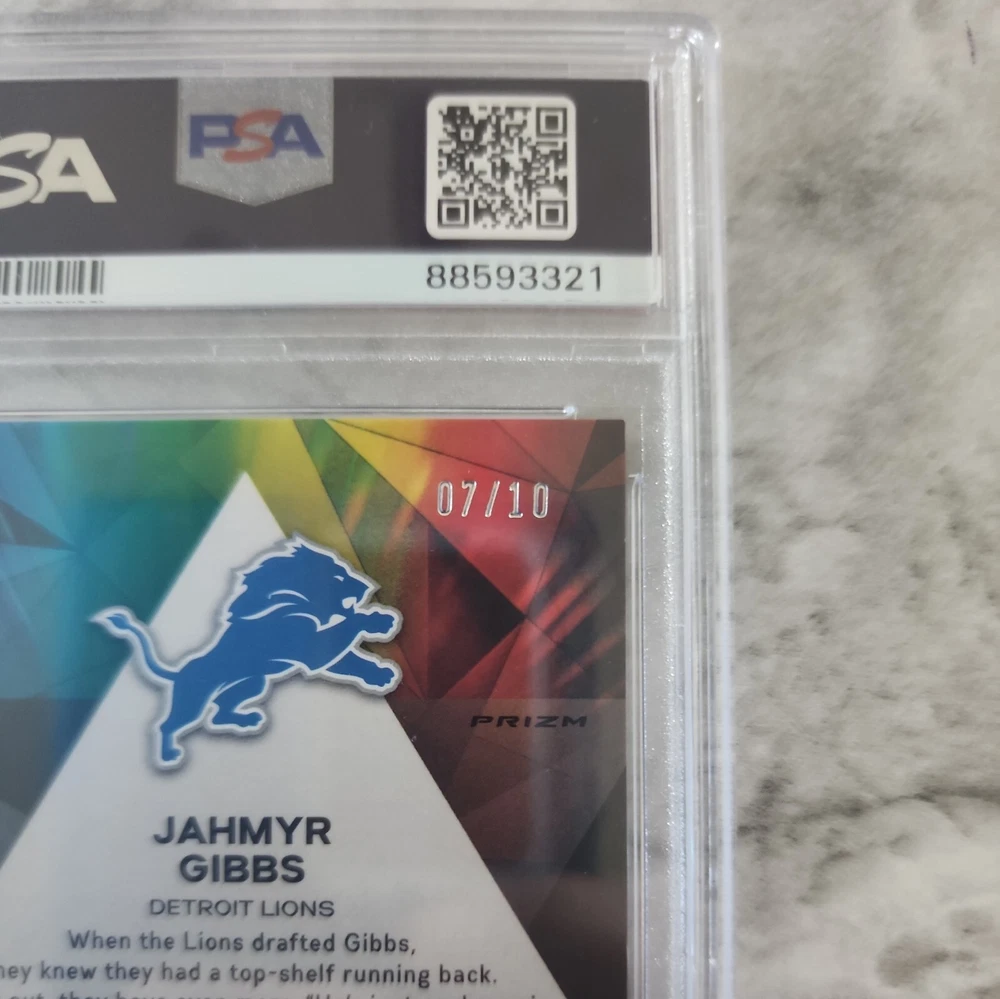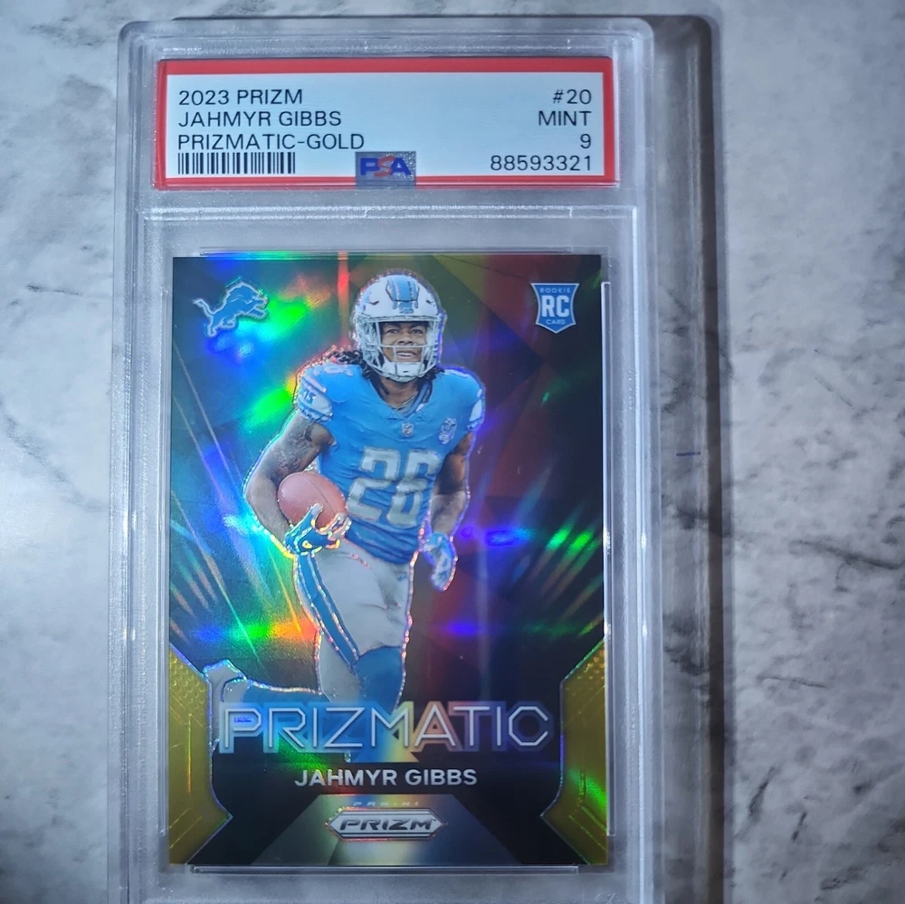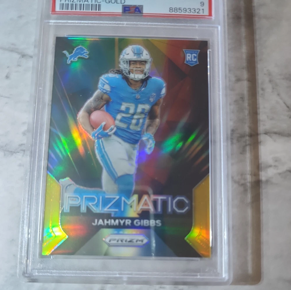 This rare and highly sought-after 2023 Prizmatic Gold sports trading card features the talented football player Jahmyr Gibbs. Limited to only 10 copies, this card is a true gem for any collector or sports enthusiast. The card has been professionally graded by the reputable Professional Sports Authenticator (PSA) and boasts a grade of 9. The card is perfect for fans of Jahmyr Gibbs and football in general. It's a great addition to any sports trading card collection and is sure to impress. Don't miss out on the opportunity to own this rare and valuable card.