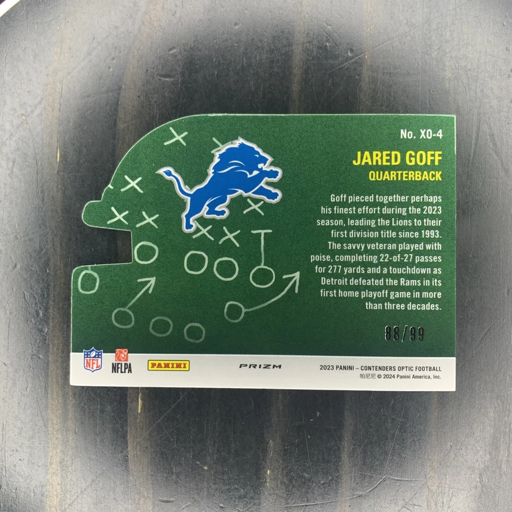This is a rare and collectible sports trading card featuring Jared Goff, the quarterback for the Oakland Raiders. The card is from the Contenders Optic X's and O's Blue Prizm set, manufactured in 2023. It is a near mint or better card, ungraded, with a serial number of /99. The card measures 3½" x 2½" and has a team of 10.7 and a card number of unspecified. It also features an autograph of Jared Goff, making it a valuable addition to any football fan's collection. This card is an original and licensed reprint, perfect for collectors who want to add a unique item to their collection.