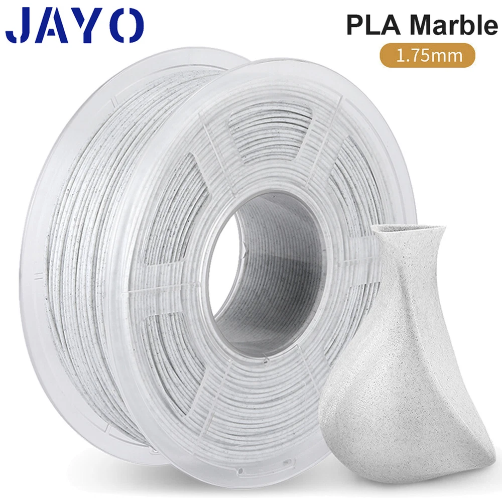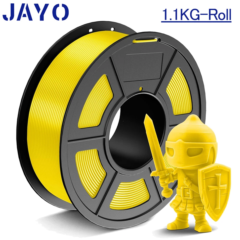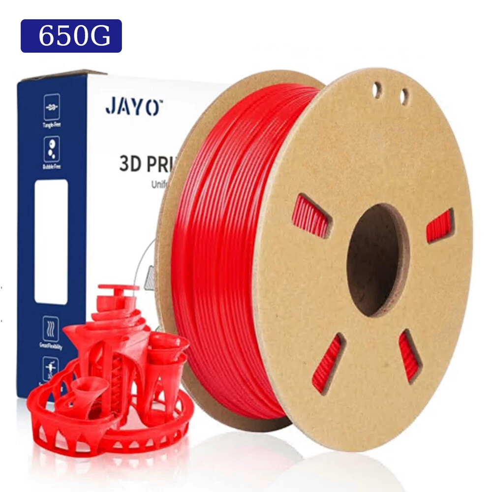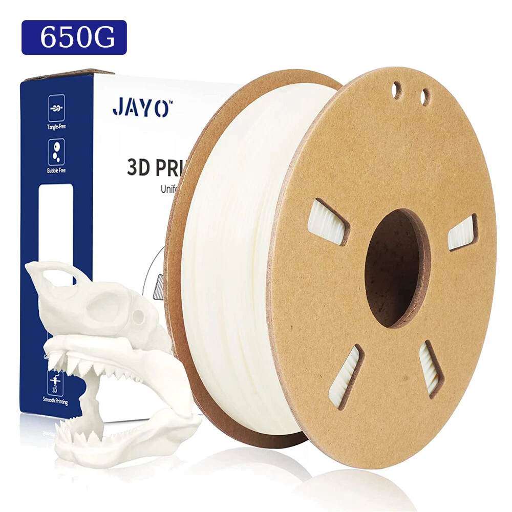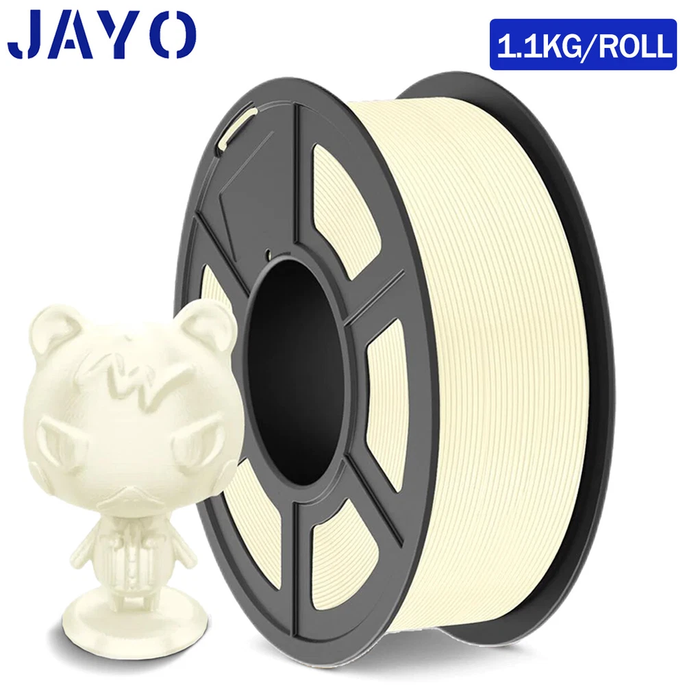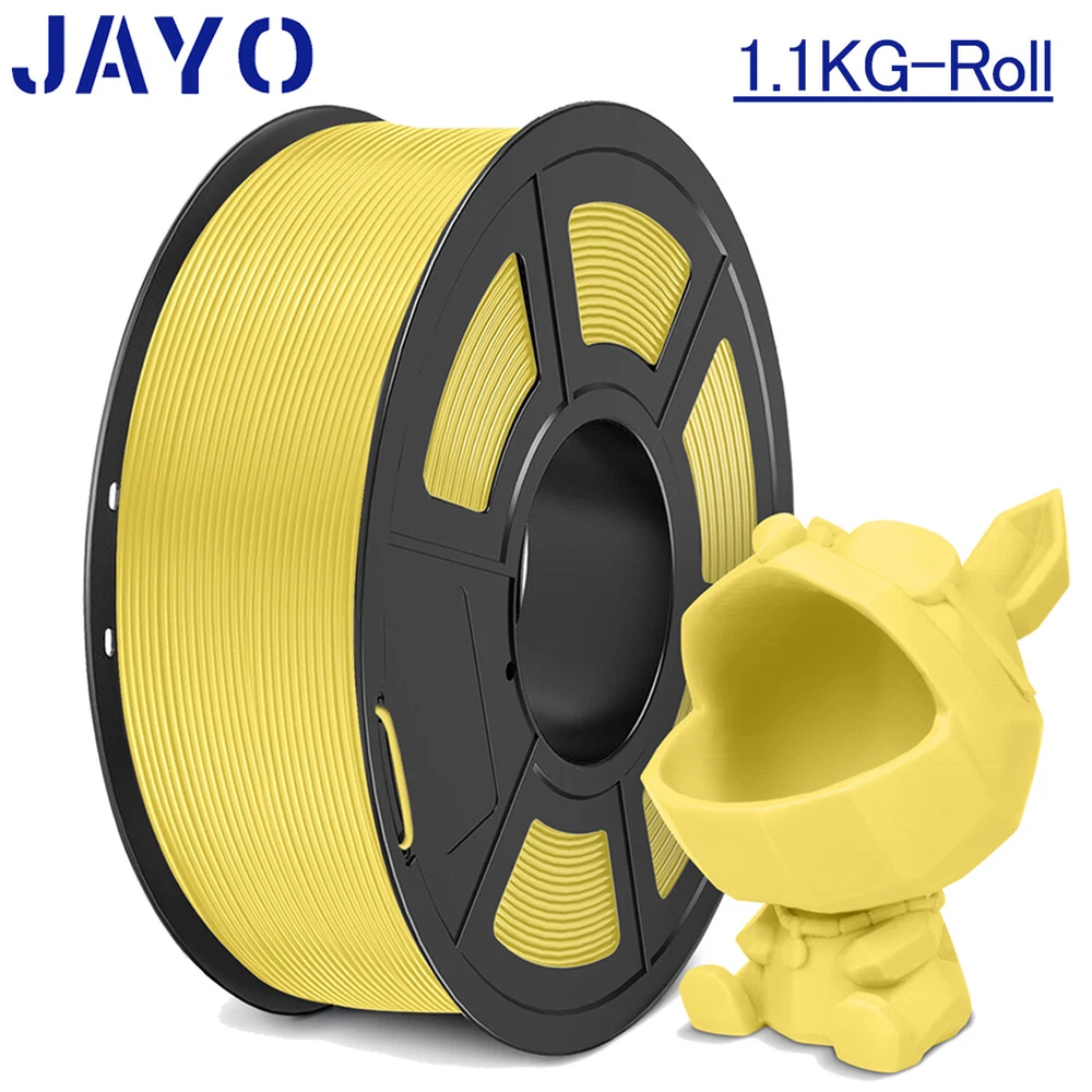 Filament Wire diameter Tolerance Printing temperature Print speed Heat bed temperature Elongation at break Net weight PLA 1.75mm ±0.02mm 200-210℃ 50-100mm/s 53℃ 4% 1.1KG/Roll PLA Meta 1.75mm ±0.02mm 185-195℃ 50-150mm/s 53℃ 35% 1.1KG/Roll PLA Matte 1.75mm ±0.02mm 205-215℃ 50-100mm/s 53℃ 4% 1.1KG/Roll PLA HighSpeed 1.75mm ±0.02mm 190-210℃ 190-210℃, 50-150mm/s 210-230℃,150-300mm/s 230-260℃,300-600mm/s 53℃ 3.6% 1.1KG/Roll PLA Glow 1.75mm ±0.02mm 200-210℃ 50-100mm/s 53℃ 21% 1.1KG/Roll PLA Carbon fibre 1.75mm ±0.02mm 215-225℃(YF) 205-215℃(TY) 40-60mm/s 53℃ 3% 1.1KG/Roll PLA Marble 1.75mm ±0.03mm 210-220℃ 40-60mm/s 53℃ 4% 1.1KG/Roll Wood 1.75mm ±0.03mm 205-215℃ 40-60mm/s 53℃ 4% 1.1KG/Roll PLA+ 1.75mm ±0.02mm 205-215℃ 50-100mm/s 53℃ 45% 1.1KG/Roll PETG 1.75mm ±0.02mm 200-230℃ 40-60mm/s 63℃ 210% 1.1KG/Roll SILK PLA+ 1.75mm ±0.02mm 205-215℃ 40-60mm/s 53℃ 200% 1.1KG/Roll TPU (95A) 1.75mm ±0.03mm 195-205℃ Proximale Extrusion:40mm/s Ferngesteuerte Extrusion:20mm/s 52℃ 600% 0.5KG/Roll TPU SILK(98A) 1.75mm ±0.03mm 210-220℃ Proximale Extrusion:50mm/s Ferngesteuerte Extrusion:30mm/s 131℃ 463% 1.1KG/Roll ABS 1.75mm ±0.03mm 250-260℃ 40-60mm/s 84℃ 25% 1KG/Roll 0.65KG/Roll Easy ABS 1.75mm ±0.03mm 225-235℃ 40-60mm/s 57.9℃ 20% 0.65KG/Roll JAYO guarantees that following filaments are 100% Neatly wound -- PLA/PLA+/PLA Meta/PETG/SILK/PLA Matt (ABS/TPU/PLA Marble is not included.) About this product: 【 JAYO Filament 1.75mm 】JAYO 3D printed fine filament uses advanced production technology to deliver an incredible 3D printing experience. Clean lines, precise dimensionality, low shrinkage and excellent adhesion make printing easier. 【 Neatly wound filaments 】JAYO's leading production process - neatly threaded filaments prevent filaments from tangling, twisting or breaking during printing, reducing the risk of clogging and greatly increasing print success. 【 High dimensional accuracy and consistency 】JAYO 3D printer filament diameter is 1.75 mm, and the dimensional accuracy is +/- 0.02 mm, which is almost suitable for FDM 3D printers. 【 No clogging and no air bubbles 】JAYO 1.75mm filament has better flowability and effectively reduces clogging when printing. Plastic vacuum packaging and desiccant make the filament less susceptible to moisture. 【 High Compatibility & Easy Operation 】Compatible with 99% of FDM 3D printers and 3D pens on the market. JAYO fine filament's excellent stability is suitable for beginners and advanced users. How to store: 1.If you leave your printer idle for more than a few days, please retract the filament to protect your printer nozzle. 2.In order to extend the life of your filament, please put the unsealed filament back into the original vacuum bag and store in a cool and dry place after printing. 3.When storing your filament, please pass the loose end through the holes on the edge of the filament spool to avoid coiling, so that it will be fed properly for the next use.