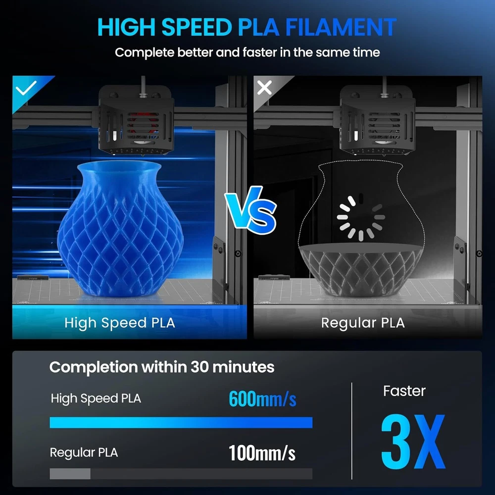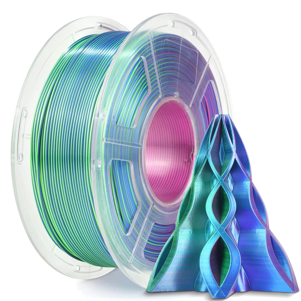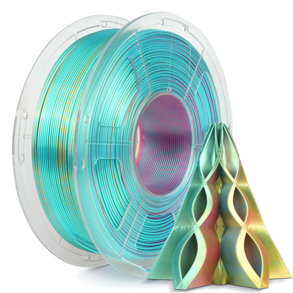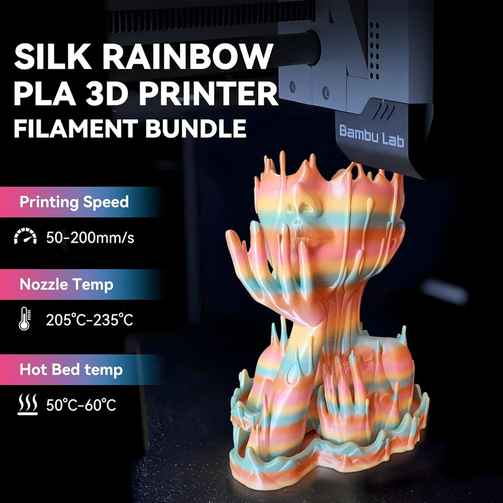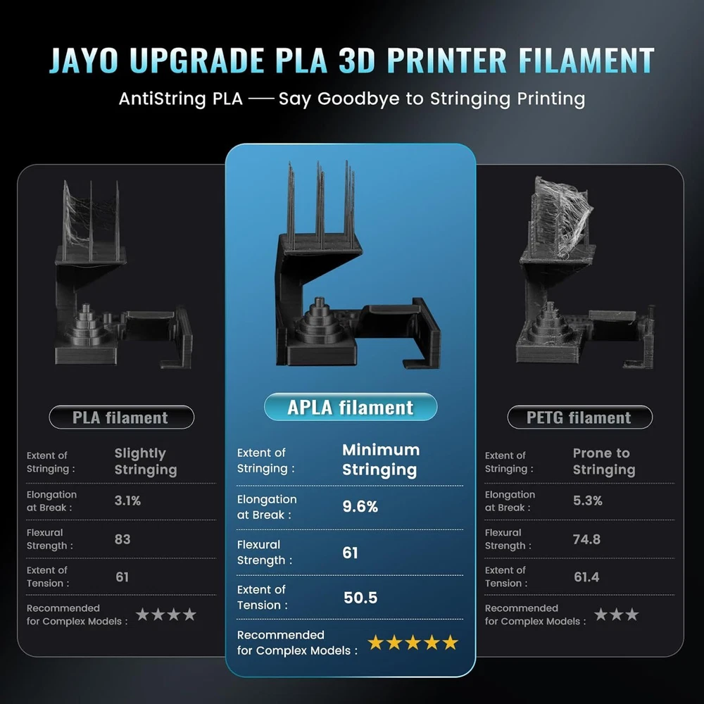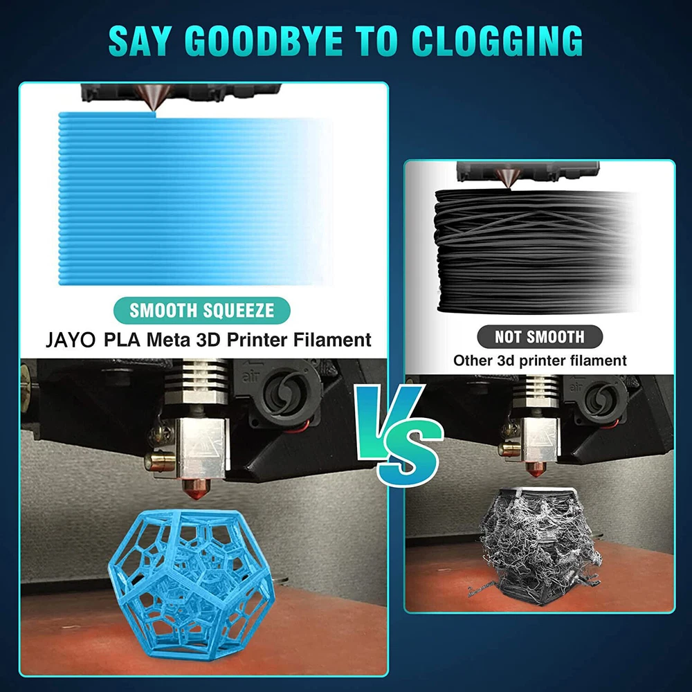 Filament Wire diameter Tolerance Printing temperature Print speed Heat bed temperature Elongation at break Net weight PLA 1.75mm ±0.02mm 200-210℃ 50-100mm/s 53℃ 4% 1.1KG/Roll PLA Meta 1.75mm ±0.02mm 185-195℃ 50-150mm/s 53℃ 35% 1.1KG/Roll PLA Matte 1.75mm ±0.02mm 205-215℃ 50-100mm/s 53℃ 4% 1.1KG/Roll PLA HighSpeed 1.75mm ±0.02mm 190-210℃ 190-210℃, 50-150mm/s 210-230℃,150-300mm/s 230-260℃,300-600mm/s 53℃ 3.6% 1.1KG/Roll PLA Glow 1.75mm ±0.02mm 200-210℃ 50-100mm/s 53℃ 21% 1.1KG/Roll PLA Carbon fibre 1.75mm ±0.02mm 215-225℃(YF) 205-215℃(TY) 40-60mm/s 53℃ 3% 1.1KG/Roll PLA Marble 1.75mm ±0.03mm 210-220℃ 40-60mm/s 53℃ 4% 1.1KG/Roll Wood 1.75mm ±0.03mm 205-215℃ 40-60mm/s 53℃ 4% 1.1KG/Roll PLA+ 1.75mm ±0.02mm 205-215℃ 50-100mm/s 53℃ 45% 1.1KG/Roll PETG 1.75mm ±0.02mm 200-230℃ 40-60mm/s 63℃ 210% 1.1KG/Roll SILK PLA+ 1.75mm ±0.02mm 205-215℃ 40-60mm/s 53℃ 200% 1.1KG/Roll TPU (95A) 1.75mm ±0.03mm 195-205℃ Proximale Extrusion:40mm/s Ferngesteuerte Extrusion:20mm/s 52℃ 600% 0.5KG/Roll TPU SILK(98A) 1.75mm ±0.03mm 210-220℃ Proximale Extrusion:50mm/s Ferngesteuerte Extrusion:30mm/s 131℃ 463% 1.1KG/Roll ABS 1.75mm ±0.03mm 250-260℃ 40-60mm/s 84℃ 25% 1KG/Roll 0.65KG/Roll Easy ABS 1.75mm ±0.03mm 225-235℃ 40-60mm/s 57.9℃ 20% 0.65KG/Roll JAYO guarantees that following filaments are 100% Neatly wound -- PLA/PLA+/PLA Meta/PETG/SILK/PLA Matt (ABS/TPU/PLA Marble is not included.) About this product: 【 JAYO Filament 1.75mm 】JAYO 3D printed fine filament uses advanced production technology to deliver an incredible 3D printing experience. Clean lines, precise dimensionality, low shrinkage and excellent adhesion make printing easier. 【 Neatly wound filaments 】JAYO's leading production process - neatly threaded filaments prevent filaments from tangling, twisting or breaking during printing, reducing the risk of clogging and greatly increasing print success. 【 High dimensional accuracy and consistency 】JAYO 3D printer filament diameter is 1.75 mm, and the dimensional accuracy is +/- 0.02 mm, which is almost suitable for FDM 3D printers. 【 No clogging and no air bubbles 】JAYO 1.75mm filament has better flowability and effectively reduces clogging when printing. Plastic vacuum packaging and desiccant make the filament less susceptible to moisture. 【 High Compatibility & Easy Operation 】Compatible with 99% of FDM 3D printers and 3D pens on the market. JAYO fine filament's excellent stability is suitable for beginners and advanced users. How to store: 1.If you leave your printer idle for more than a few days, please retract the filament to protect your printer nozzle. 2.In order to extend the life of your filament, please put the unsealed filament back into the original vacuum bag and store in a cool and dry place after printing. 3.When storing your filament, please pass the loose end through the holes on the edge of the filament spool to avoid coiling, so that it will be fed properly for the next use.