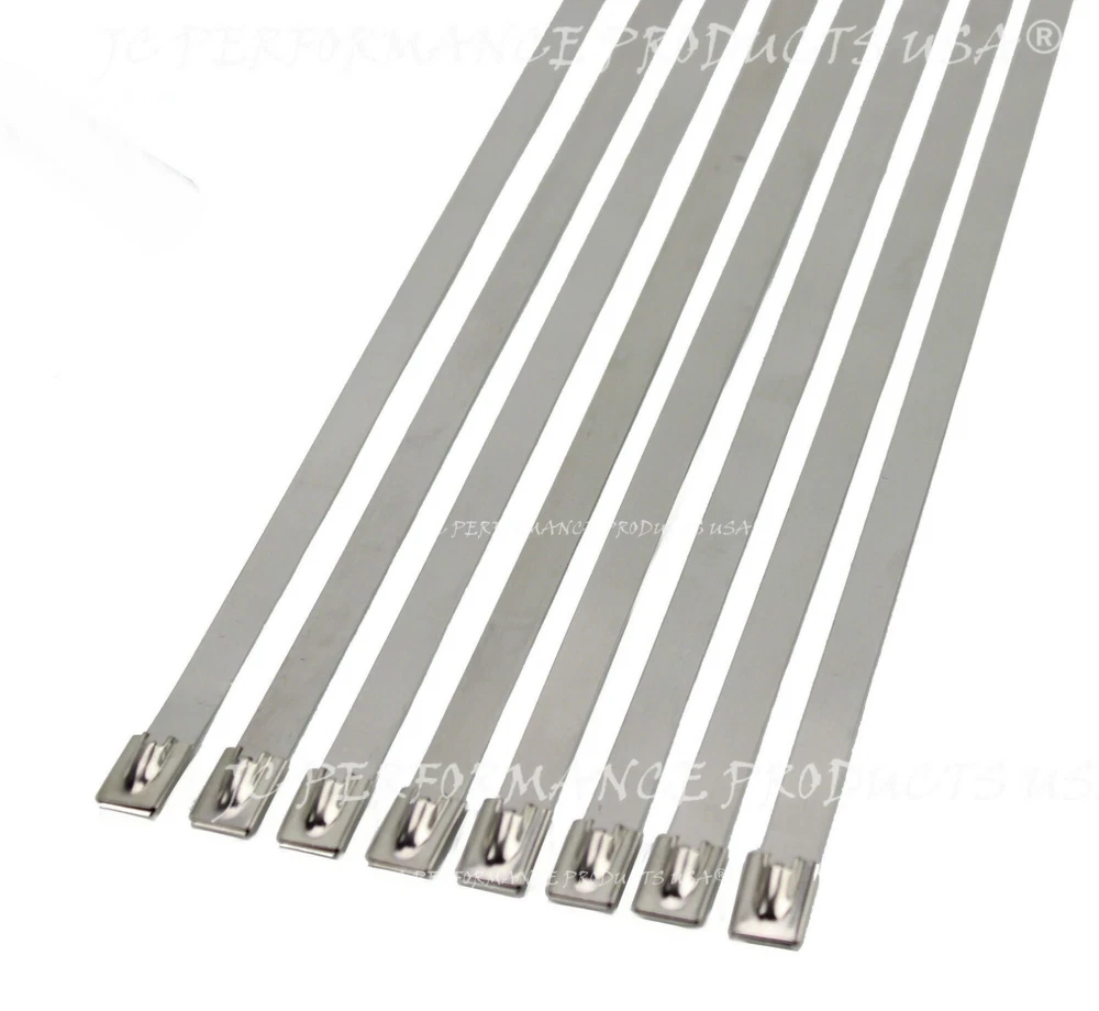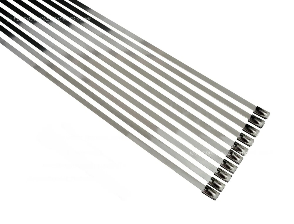 3/16" or 5/16" wide High polished mirror shine 100% first quality stainless steel ties 1000s of other daily uses and repairs, they will not rust or corrod, high durability non flammable non corrosive, Fully rounded tips,Smooth edges self-locking (w/ ball-bearing lock!) No special tools needed for installation (a pair of pliers to pull tight / tinsnips to cut off excess) The harder you pull the tighter they get (dont pull on them bare-handed) 122 or 198 pound load capacity! Beats anything out there