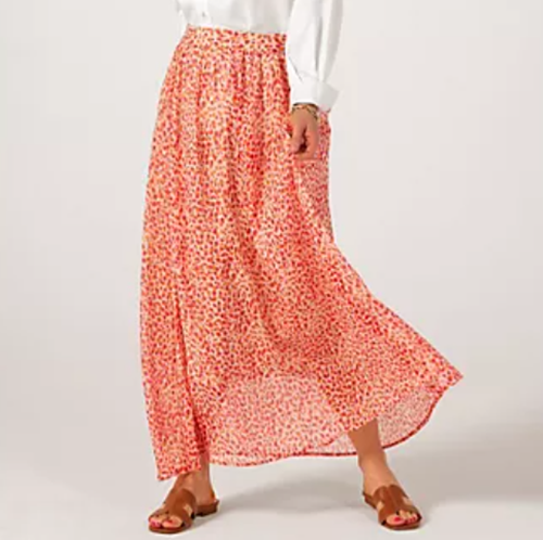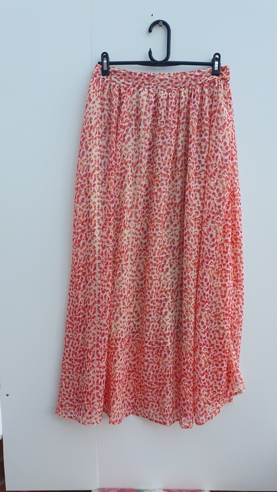 JDY Maxi Skirt With Half Elasticated Waistband Jenify size small new tags red orange multi Elasticated waistband for a comfortable fit Lined Made from 100% polyester chiffon, offering a lightweight and sheer quality with a nice drape Lined with polyester for a non-transparent look Care instructions: Cool iron, do not bleach, do not dry clean, do not tumble dry, line dry, maximum temperature 30C (mild process) length from top of waistband to hem 40" all measurements approx